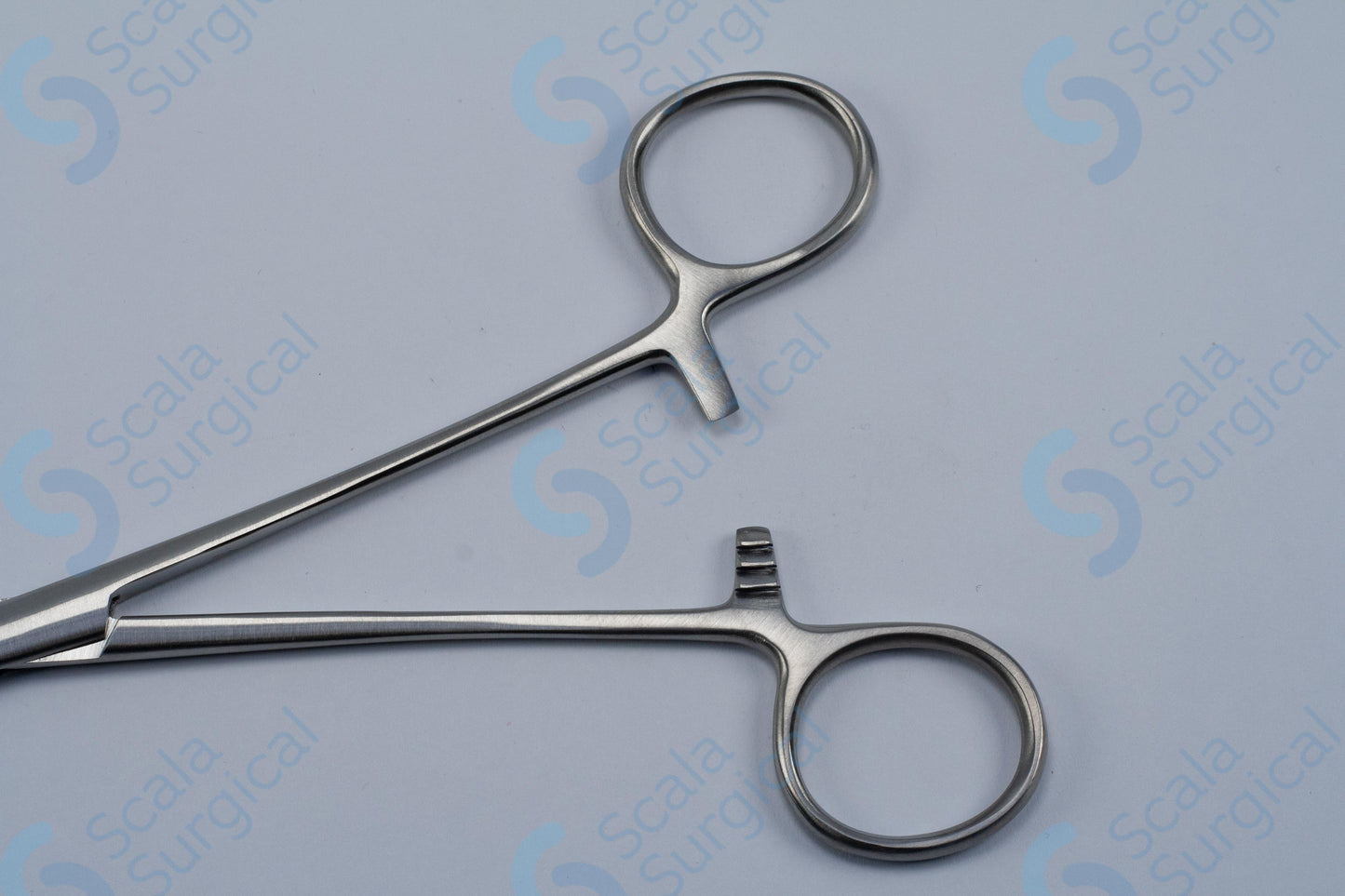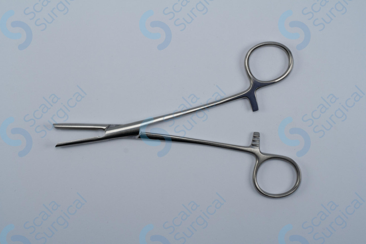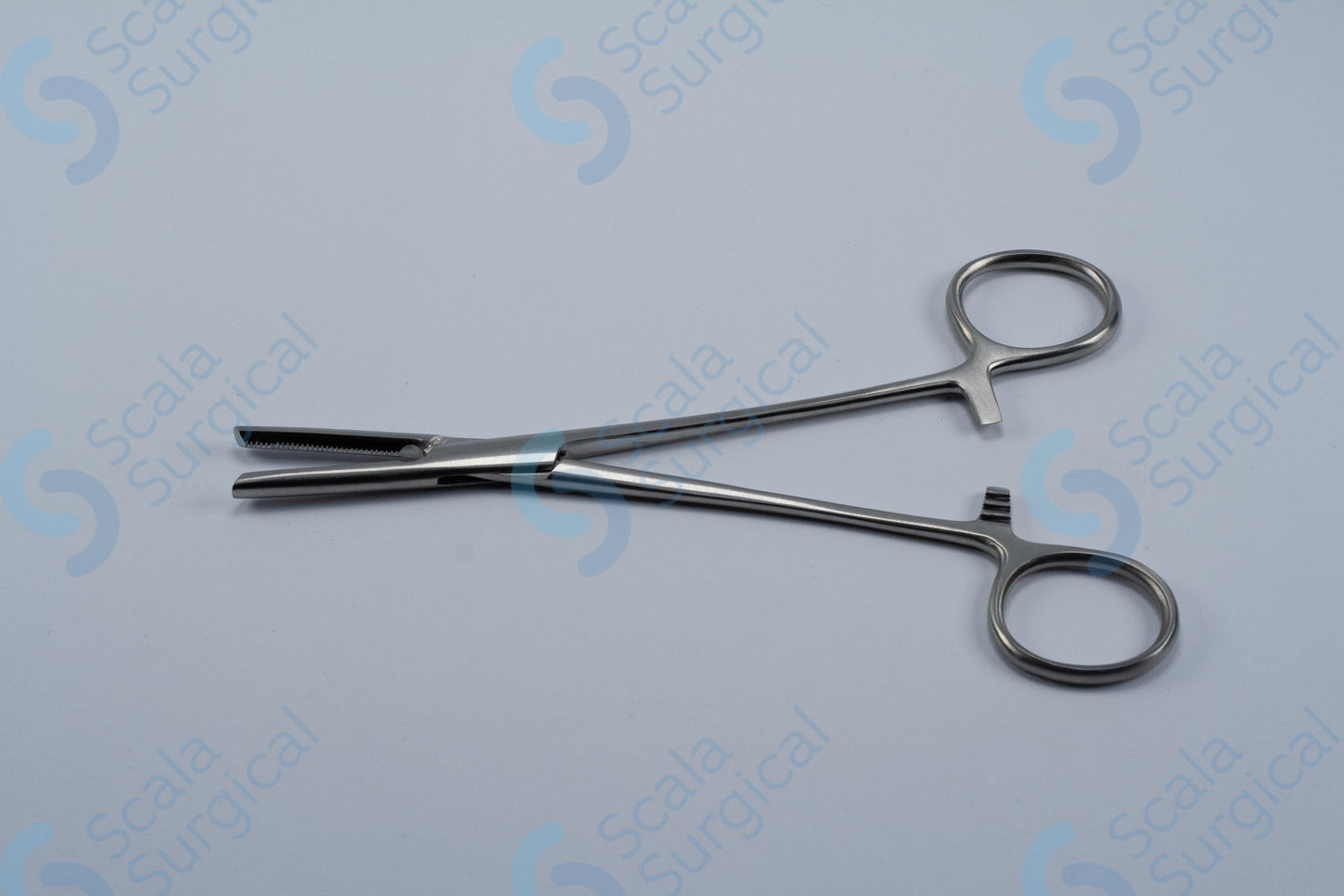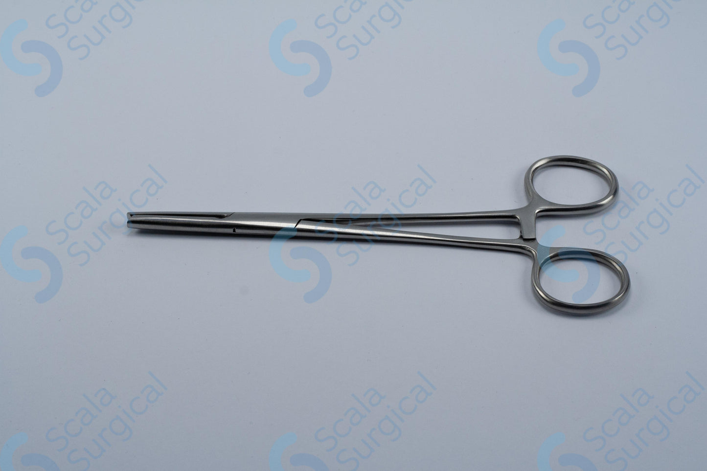 This tubing clamp is used to secure and seal tubing in a surgical setting. It is typically used for connecting two pieces of tubing, such as those used in medical devices, and helps to prevent leakage. The plain jaws are designed to fit securely and the box joint allows for a secure fit. The size of the clamp is 160mm (6?inch).
