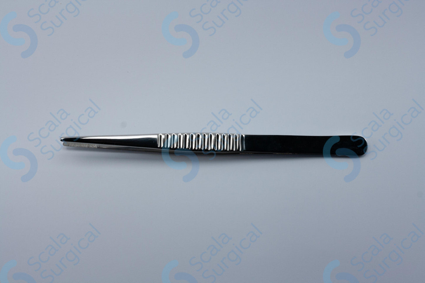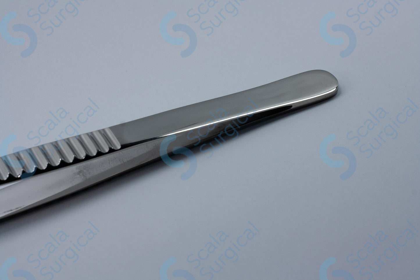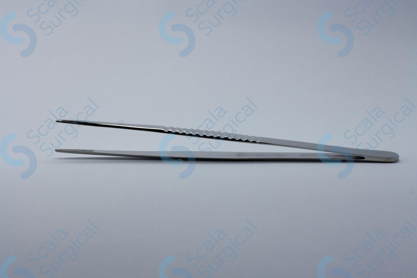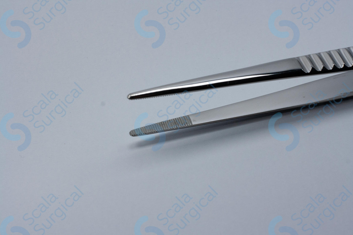 This is a surgical instrument used to grasp tissue during surgery. It has a horizontal serrated jaw and a medium-length handle. The jaws are 203.2 mm long.