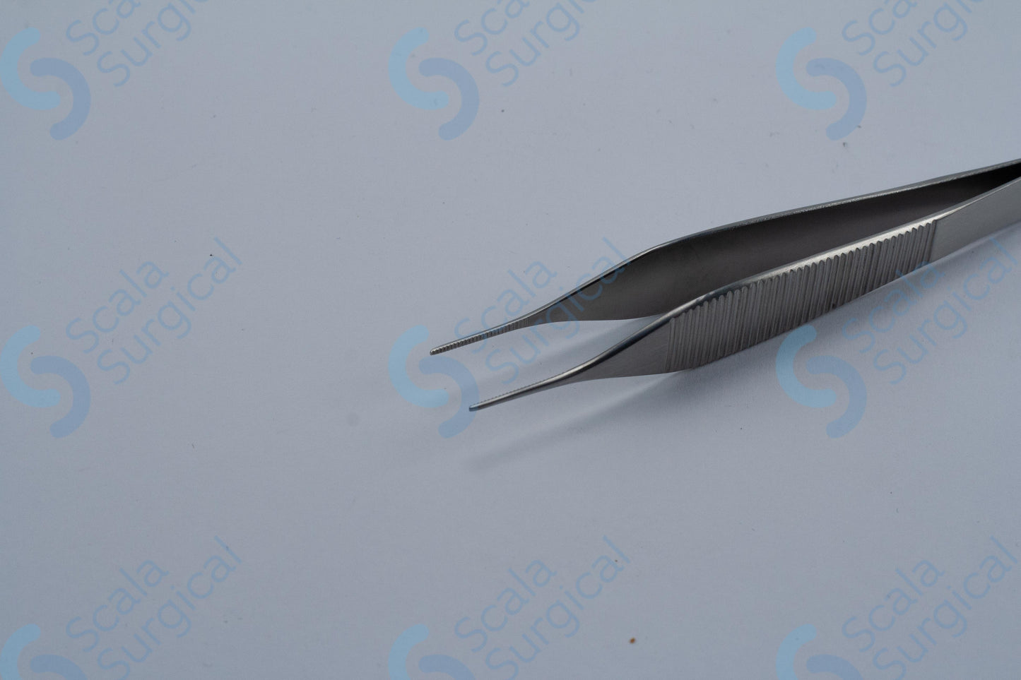 The Micro Adson Dissecting and Tissue Forceps Serrated Jaws Extra Fine Straight (127mm) (5 inch) is a medical instrument used in the surgical field to grasp, hold, and manipulate tissue during surgical procedures. It is designed to provide maximum control with minimal tissue trauma, and the serrated jaws help to grip tissue firmly.