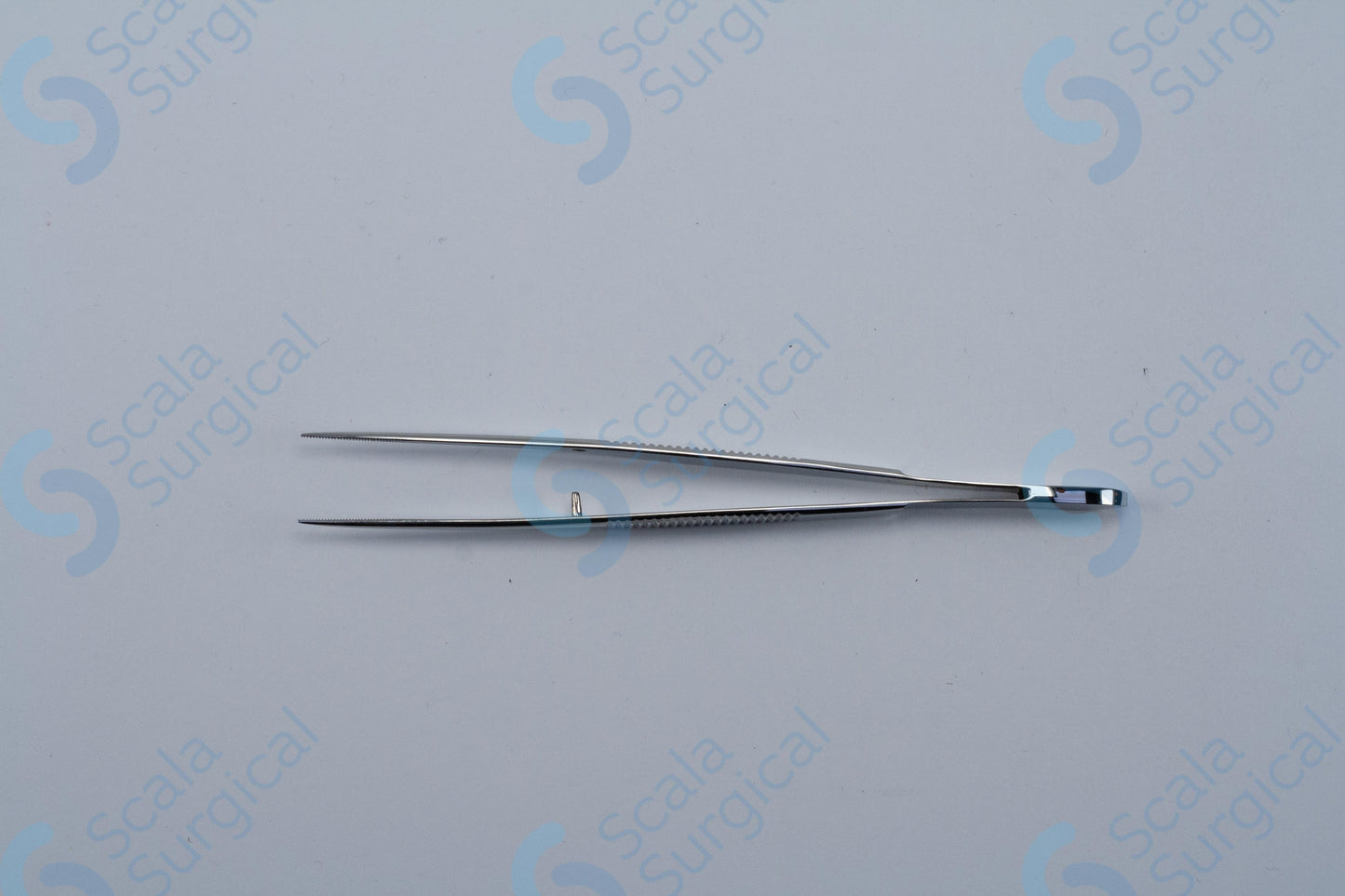 Dissecting and tissue forceps with a fine pointed straight end and guide pin are used in the surgical field to grasp and hold tissue during procedures. They are commonly used to hold tissue in place during suturing or to help with the manipulation of small tissue structures. The guide pin helps to ensure that the forceps remain in the correct position during use.