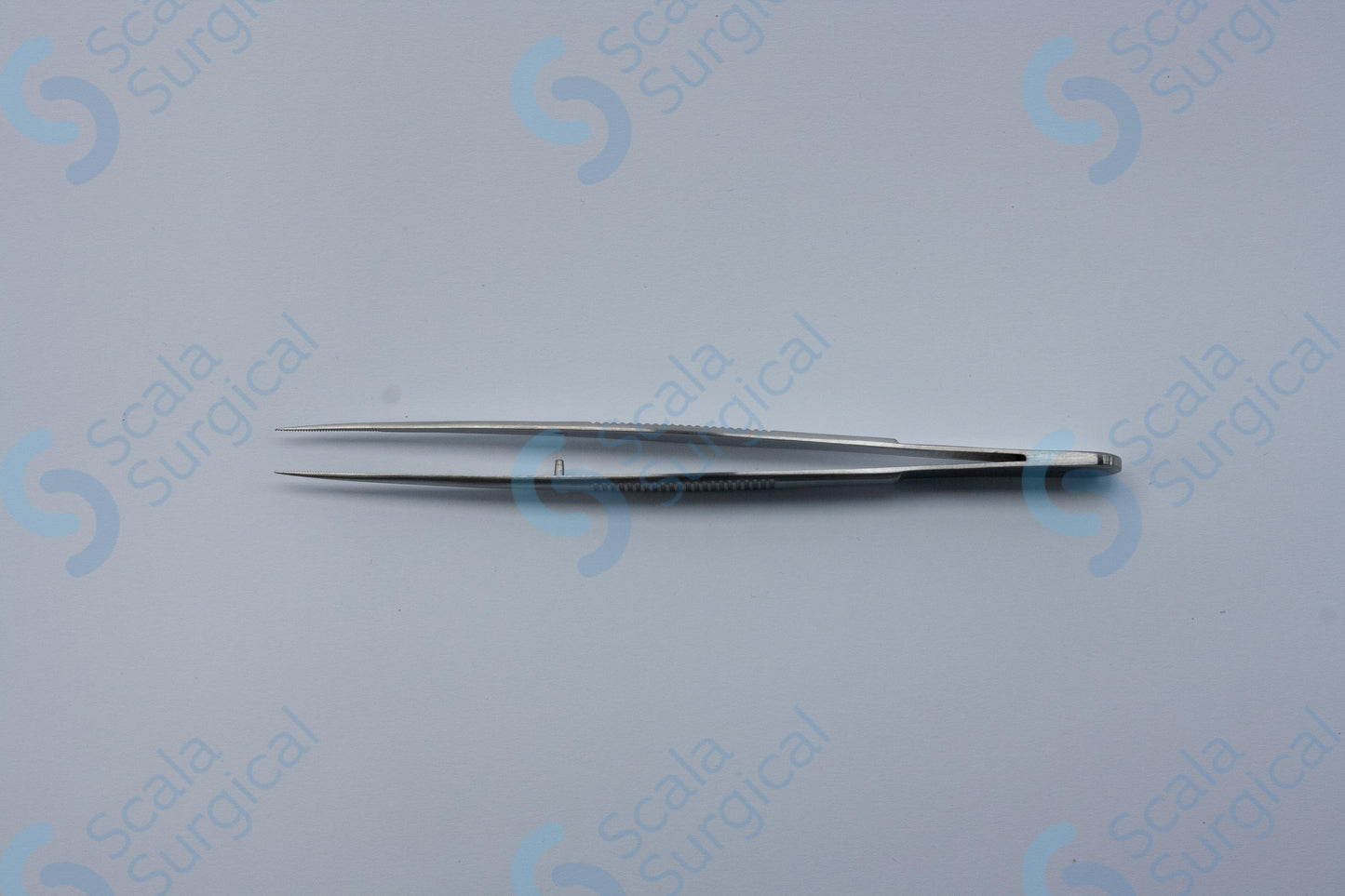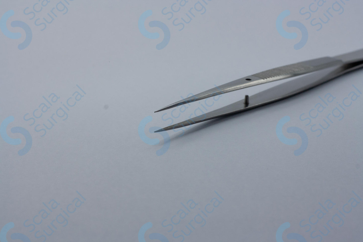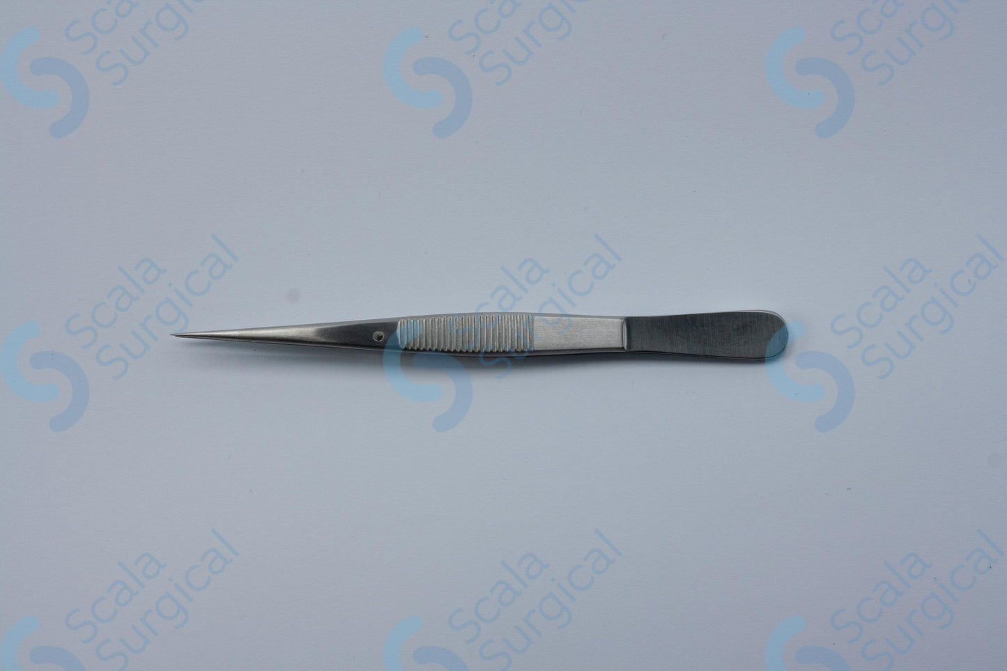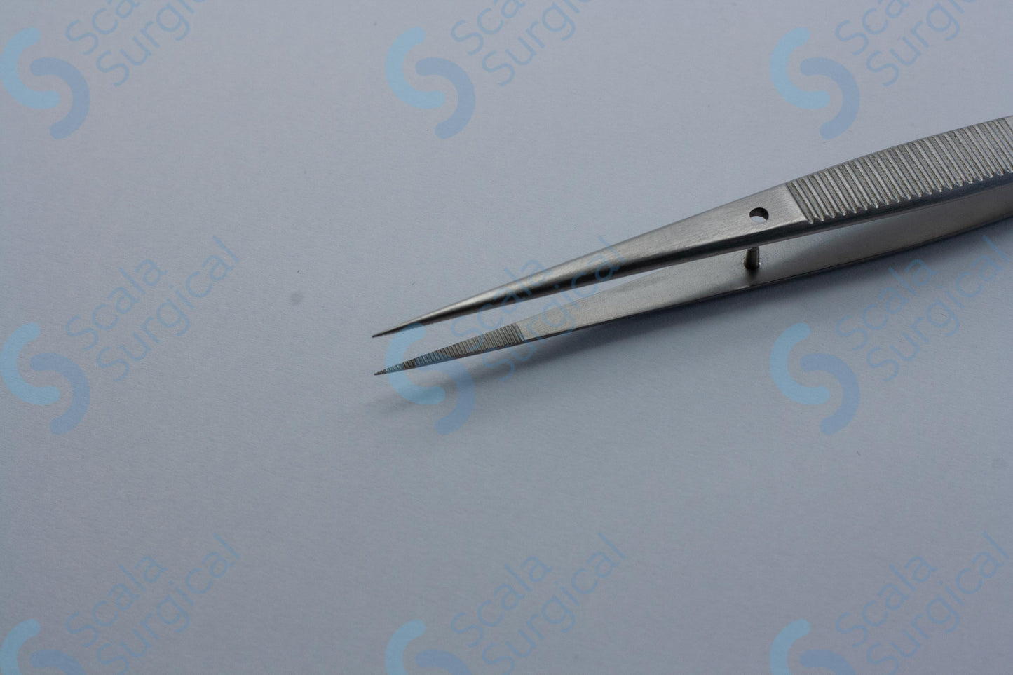 Dissecting and tissue forceps are used in the surgical field to pick up and hold small objects, such as tissue or sutures, during a procedure. The fine pointed straight with guide pin (127mm) (5 inch) forceps is designed to provide a secure grip on delicate tissue or sutures with precision.
