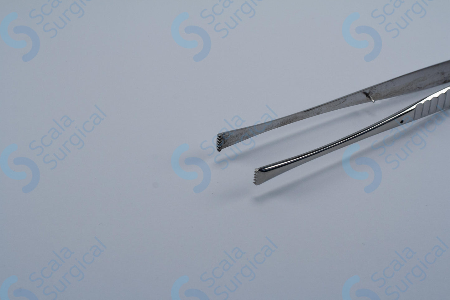 The Nelson Adhesion Dissecting and Tissue Forceps with toothed jaws and non-tearing design is a surgical instrument used to hold and manipulate tissue during surgery. It is commonly used to hold and separate tissue layers during surgery, allowing the surgeon to work with greater precision. The non-tearing design of the toothed jaws helps to reduce tissue damage.
