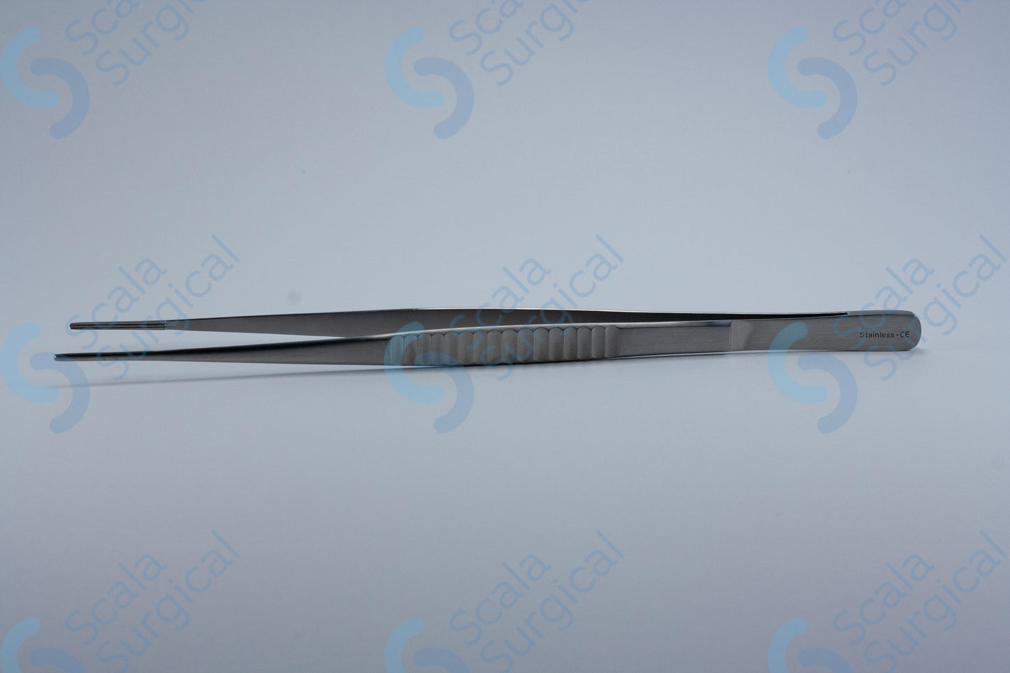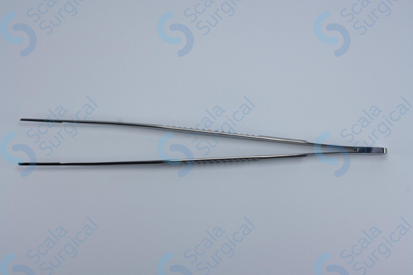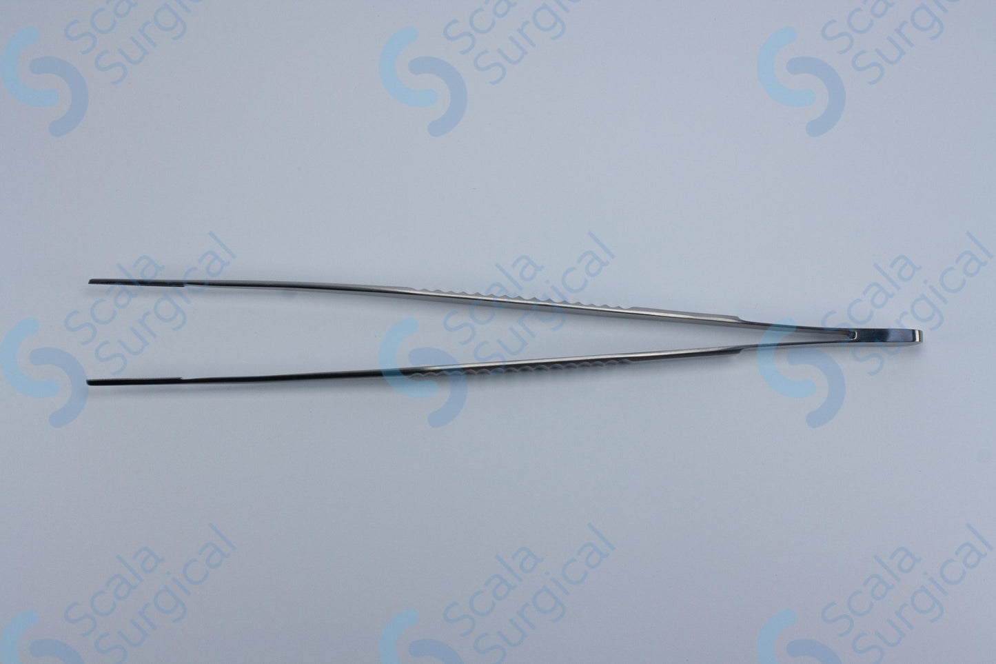 These forceps are designed to hold and manipulate tissue during surgery. They have long, curved jaws that are serrated to provide a secure grip on tissue, and they are designed to minimize tissue trauma during use.
