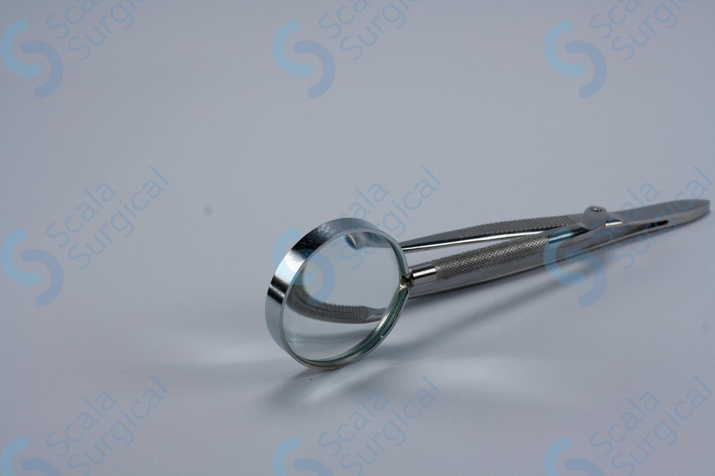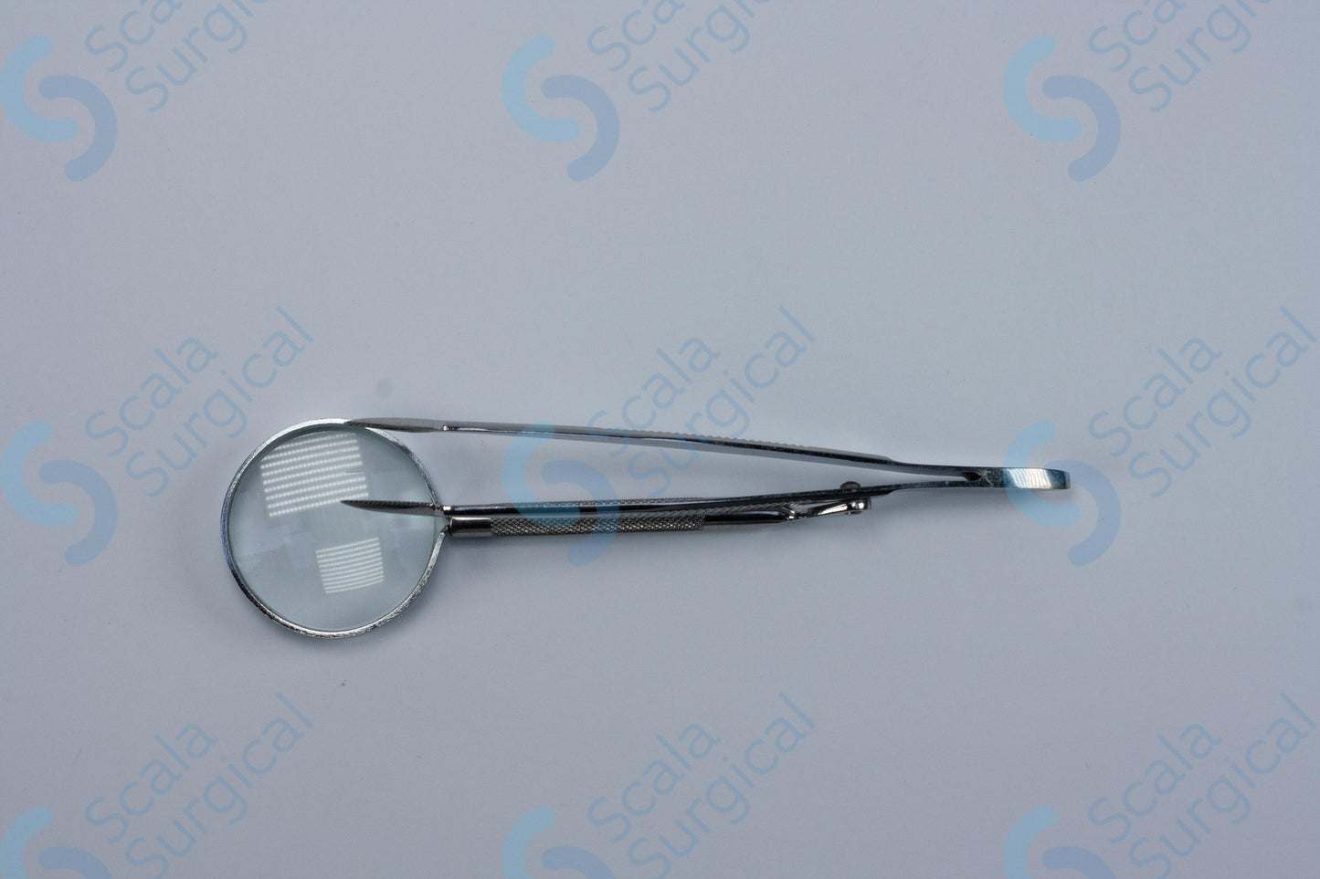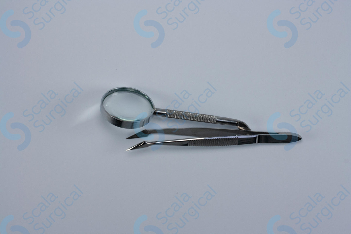 Splinter forceps with a magnifying glass are used in the surgical field to remove foreign objects, such as splinters, from the body. The magnifying glass allows for a more precise removal of the splinter, reducing the risk of infection or further injury.