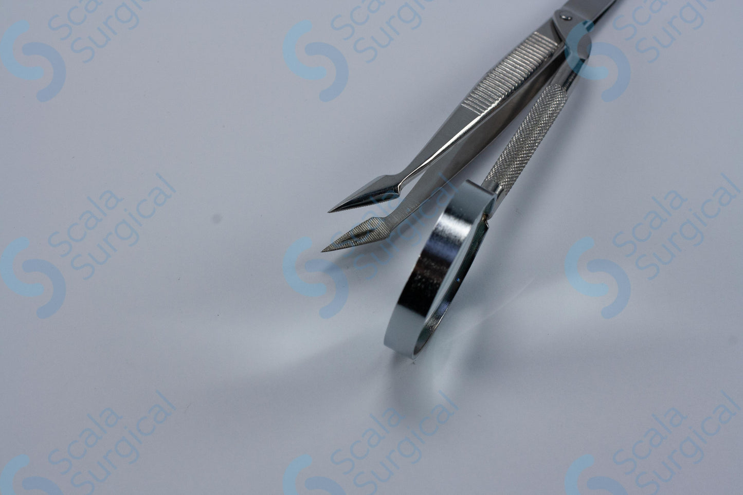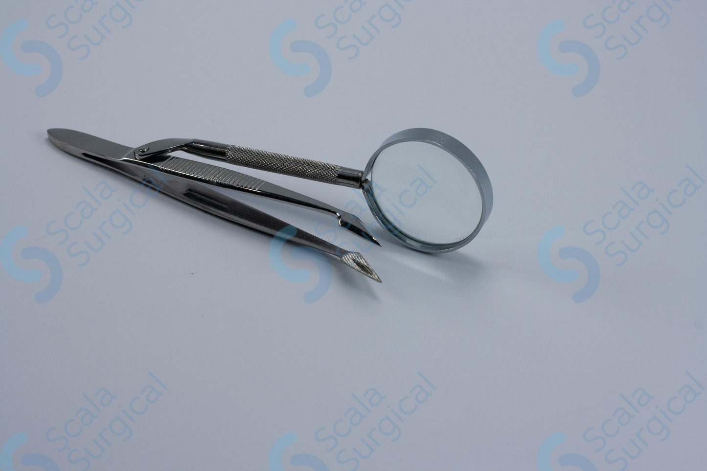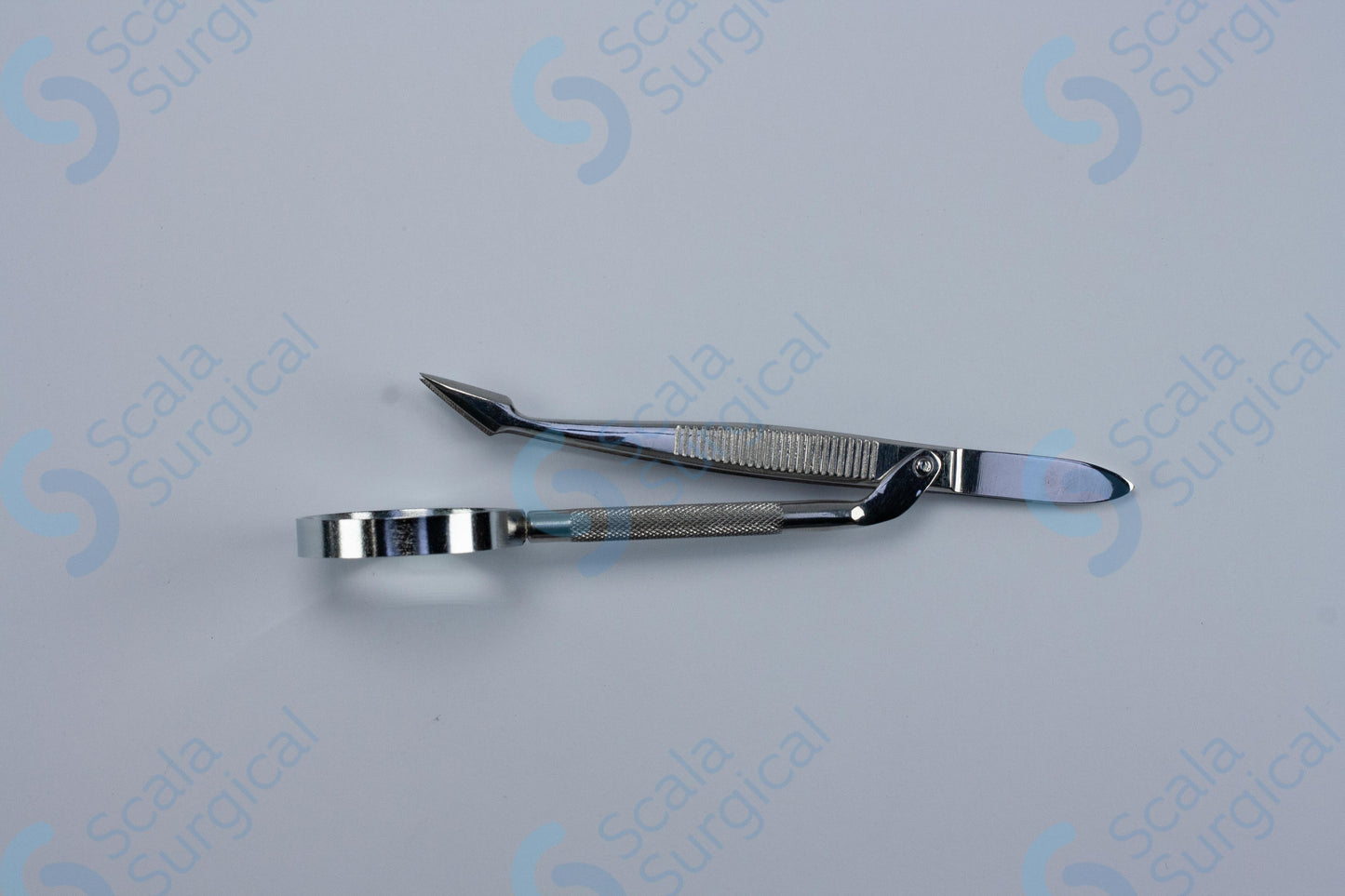 Splinter forceps with a magnifying glass are used in the surgical field to remove foreign objects, such as splinters, from the body. The magnifying glass allows for a more precise removal of the splinter, reducing the risk of infection or further injury.