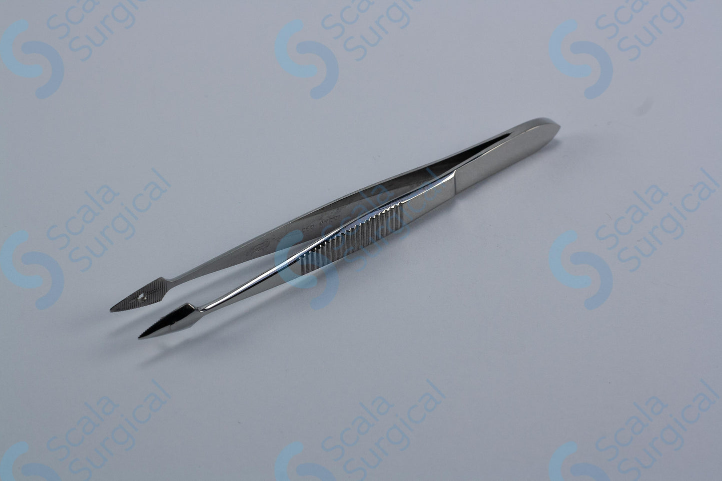 Hunters Splinter Forceps Straight (109mm) (4?inch) is a surgical tool used to remove splinters and other small foreign objects from the skin. It is a type of tweezers with a curved tip that helps to grip the object securely.