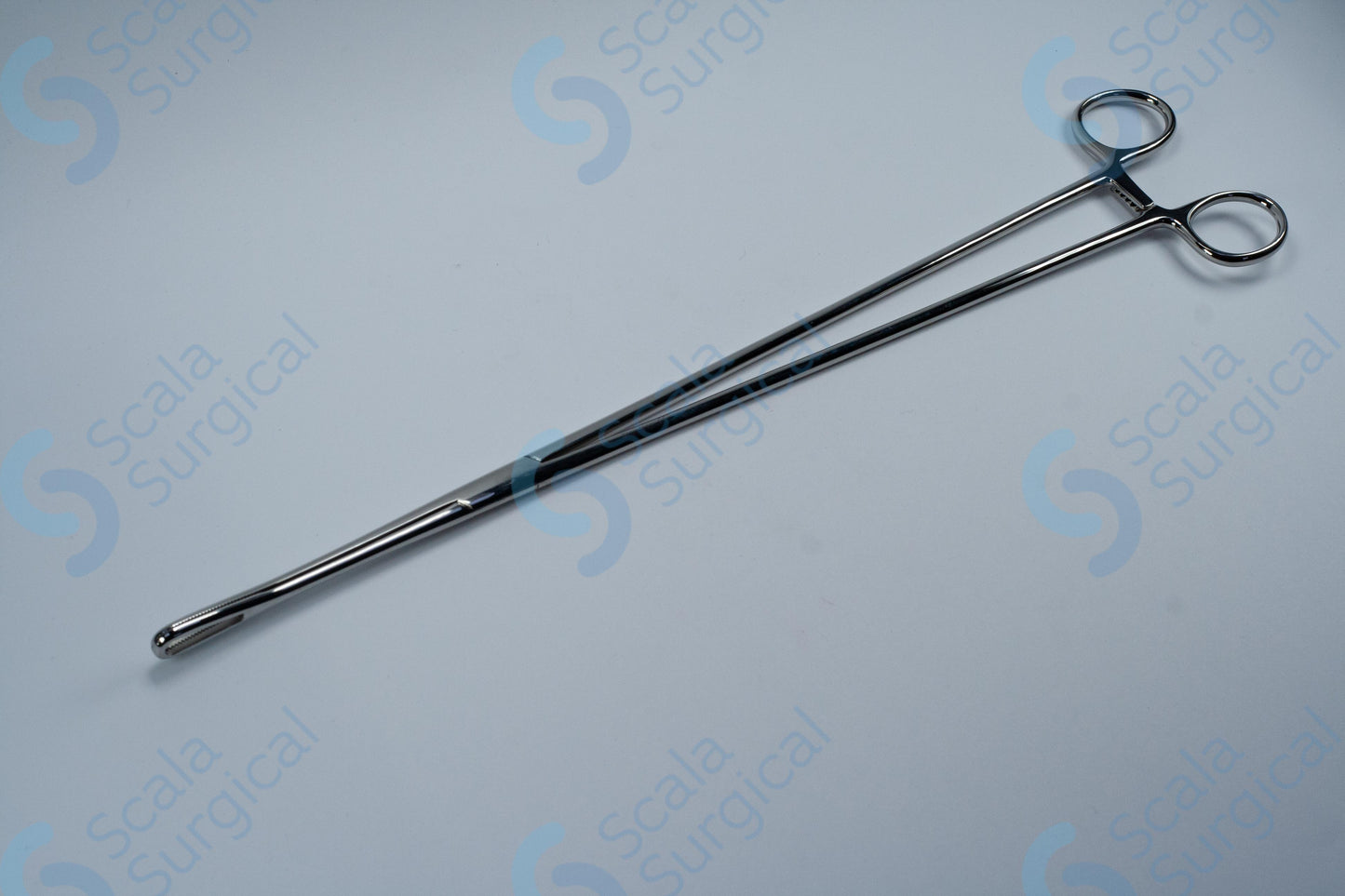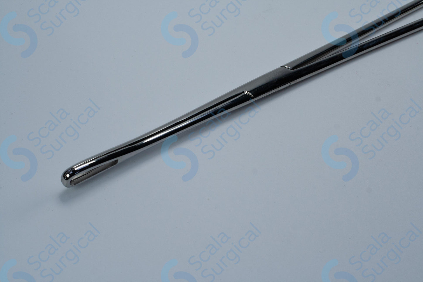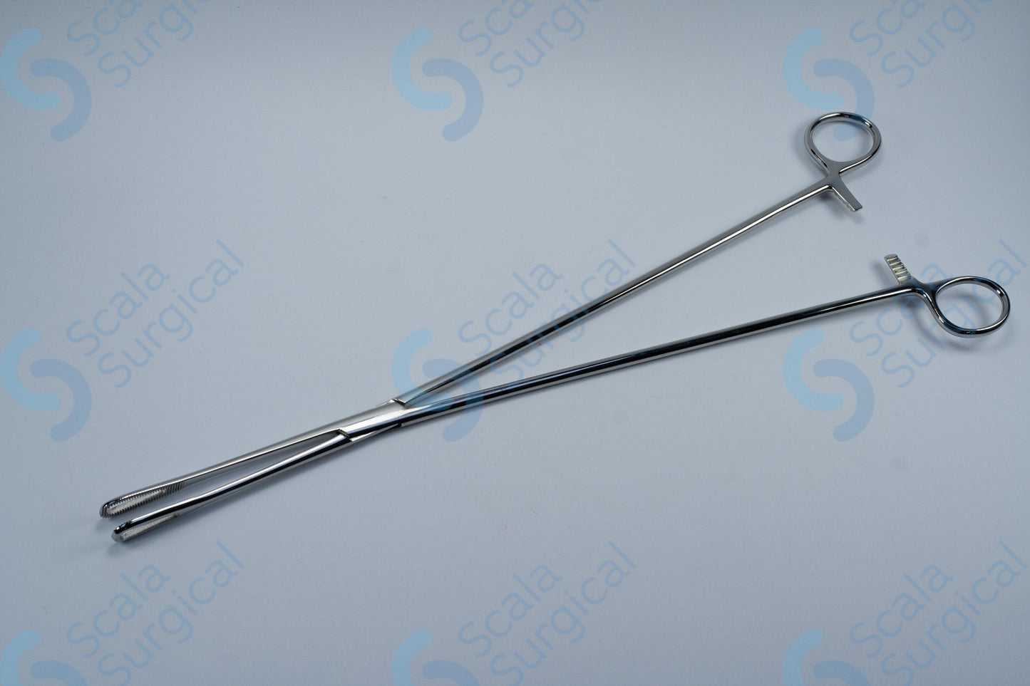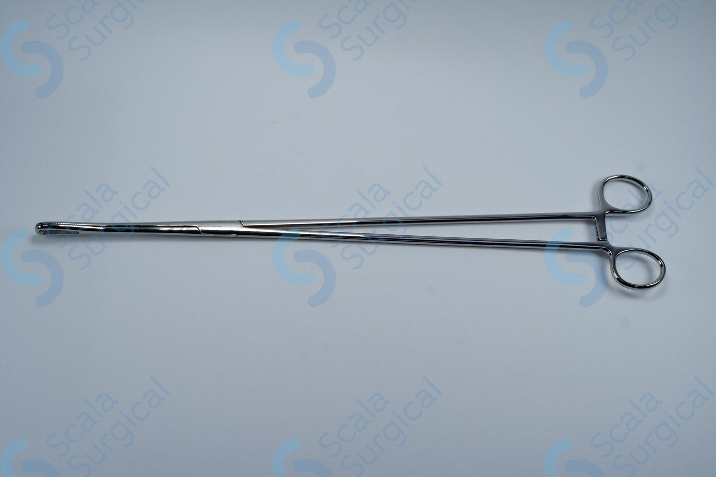 Rampley Sponge Holding Forceps Box Joint (381mm) (15 inch) is a surgical instrument used to hold and manipulate sponges, towels, or other materials during a surgical procedure. The box joint design provides a secure grip on the material being held and the long length of the forceps allows for greater reach and maneuverability during the procedure.