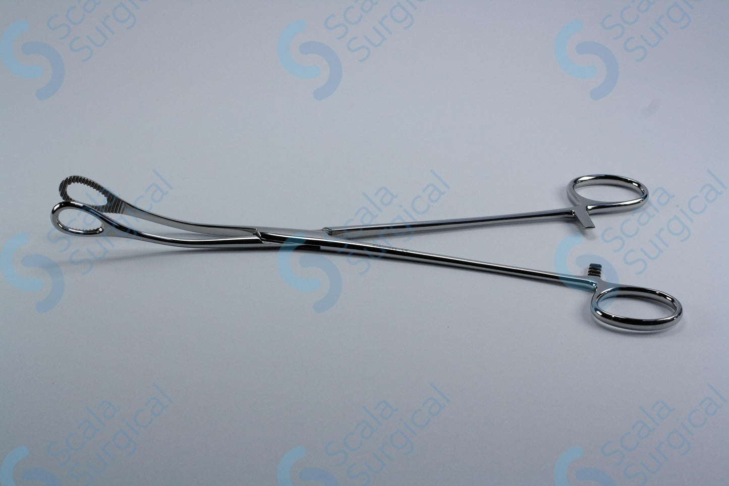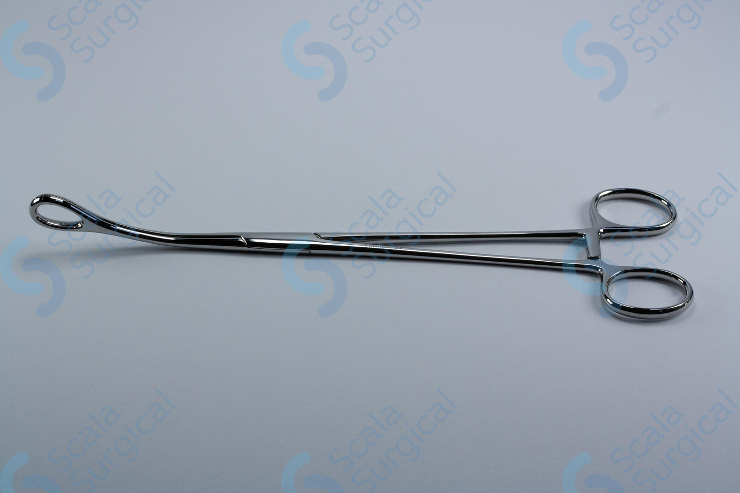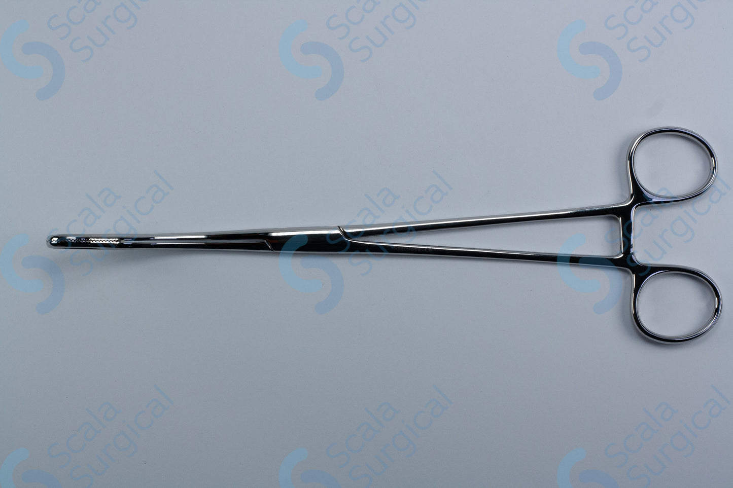 The Foerster Sponge Holding Forceps Serrated Jaws Curved Box Joint (241.3mm) (9? inch) is a surgical instrument used to hold and manipulate surgical sponges during a procedure. It has serrated jaws and a curved box joint for a secure grip.