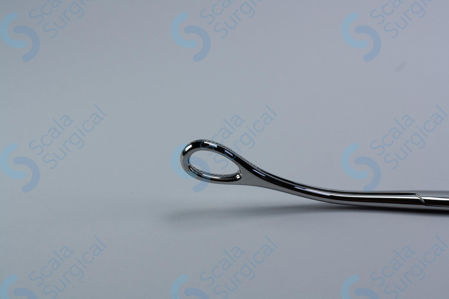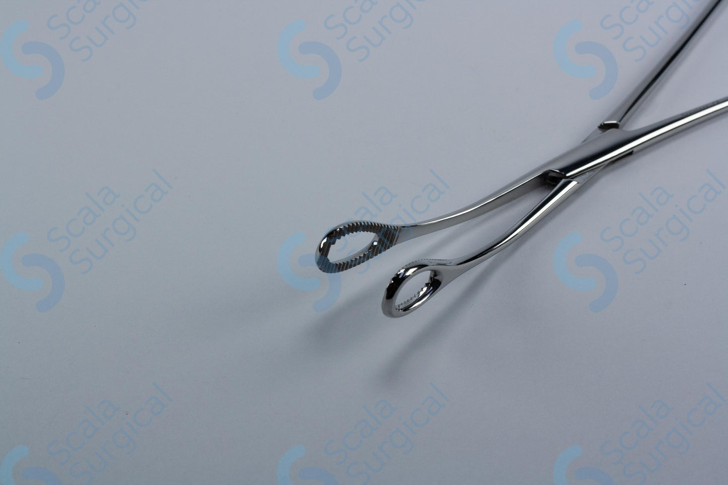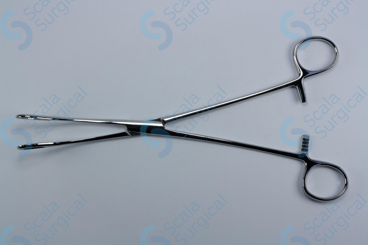The Foerster Sponge Holding Forceps Serrated Jaws Curved Box Joint (241.3mm) (9? inch) is a surgical instrument used to hold and manipulate surgical sponges during a procedure. It has serrated jaws and a curved box joint for a secure grip.