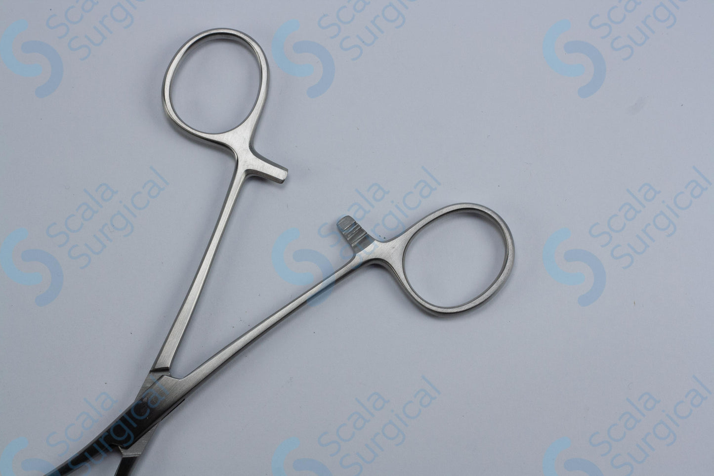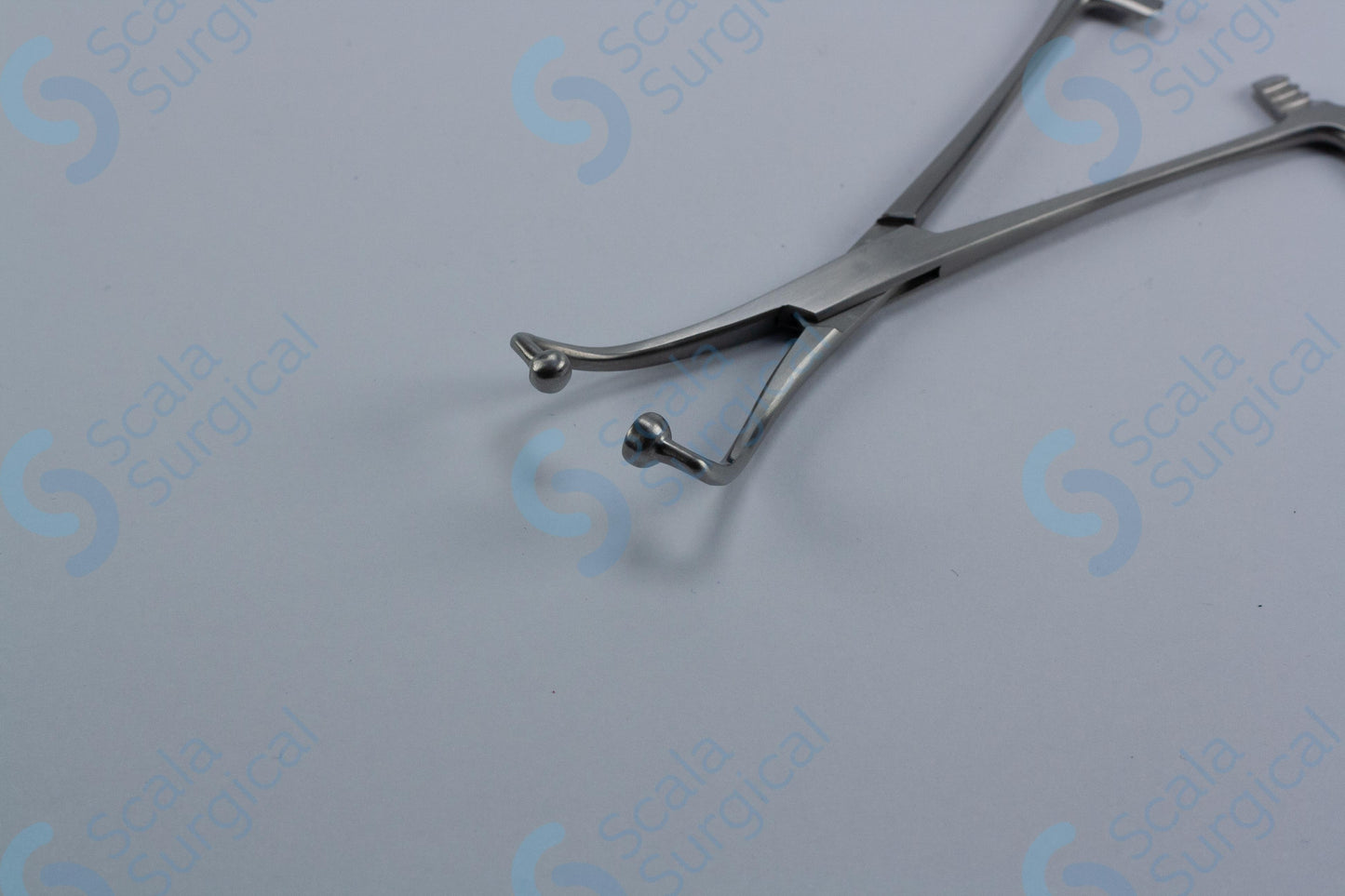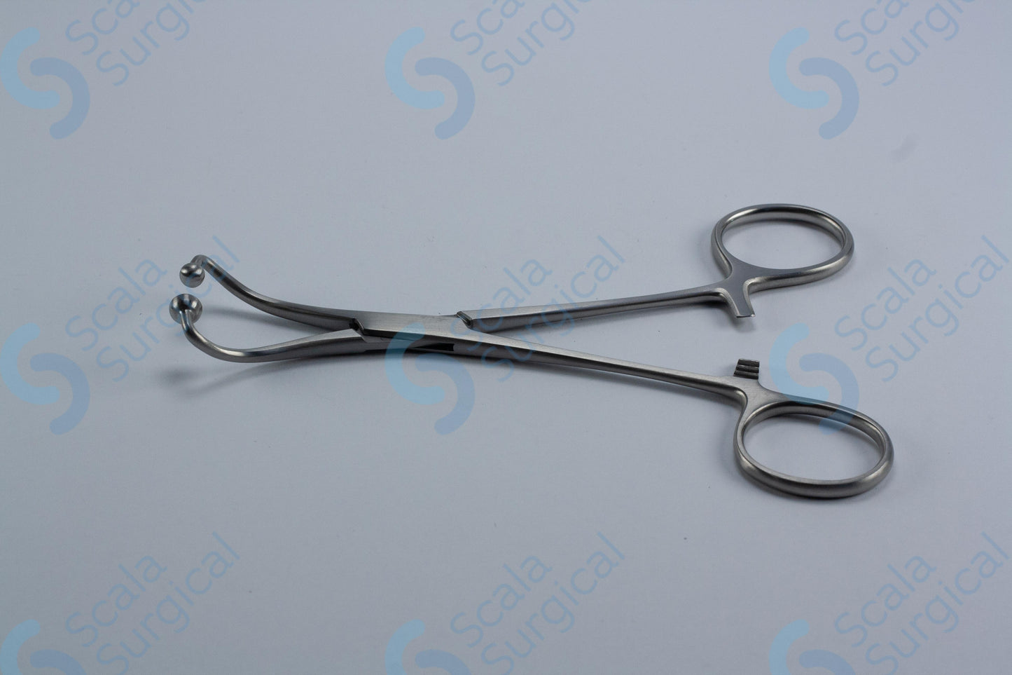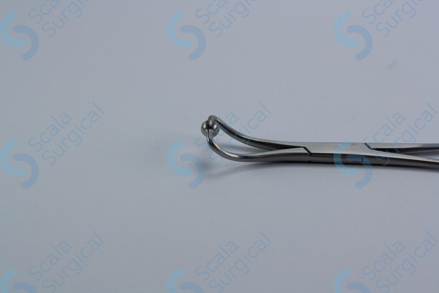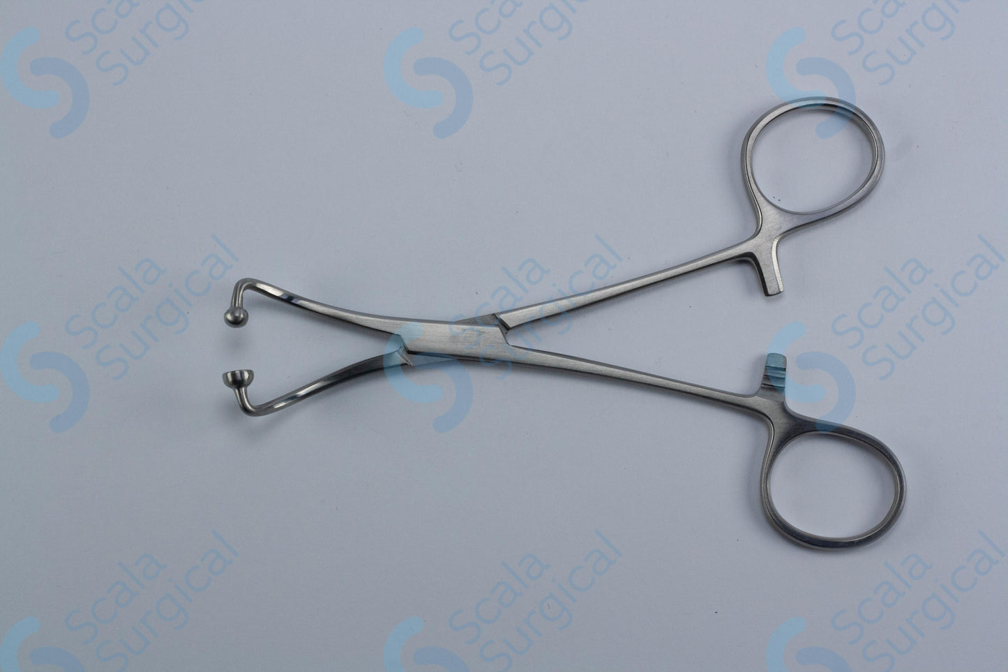 A towel clip ball and socket non tearing box joint (127mm) (5 inch) is used to secure towels and drapes to a patient during surgery. The ball and socket design helps prevent tearing of the fabric, while the box joint provides a secure connection.