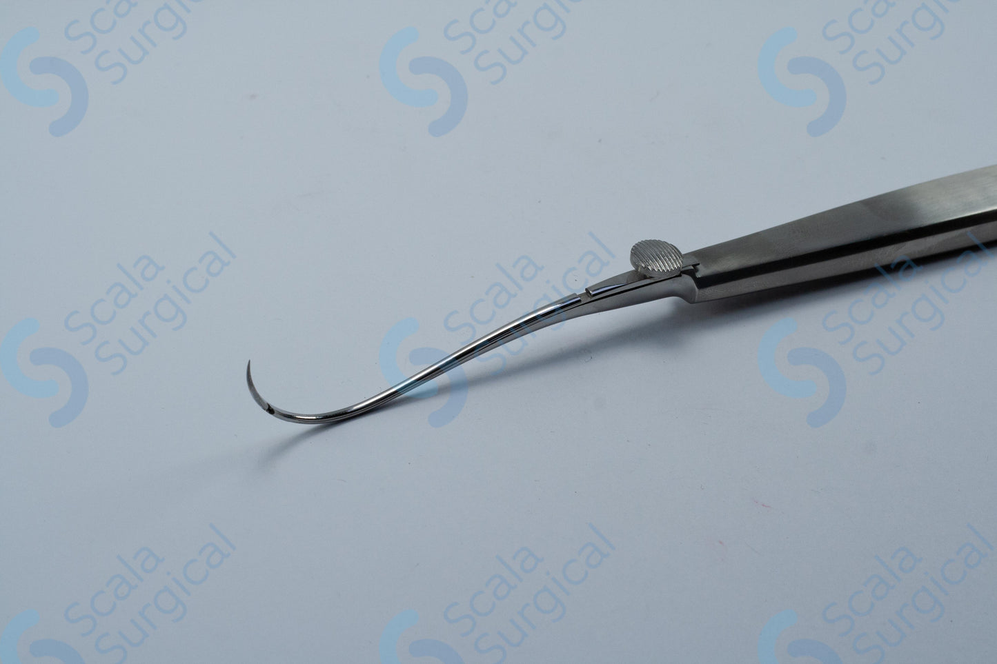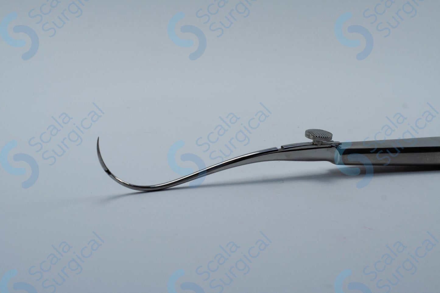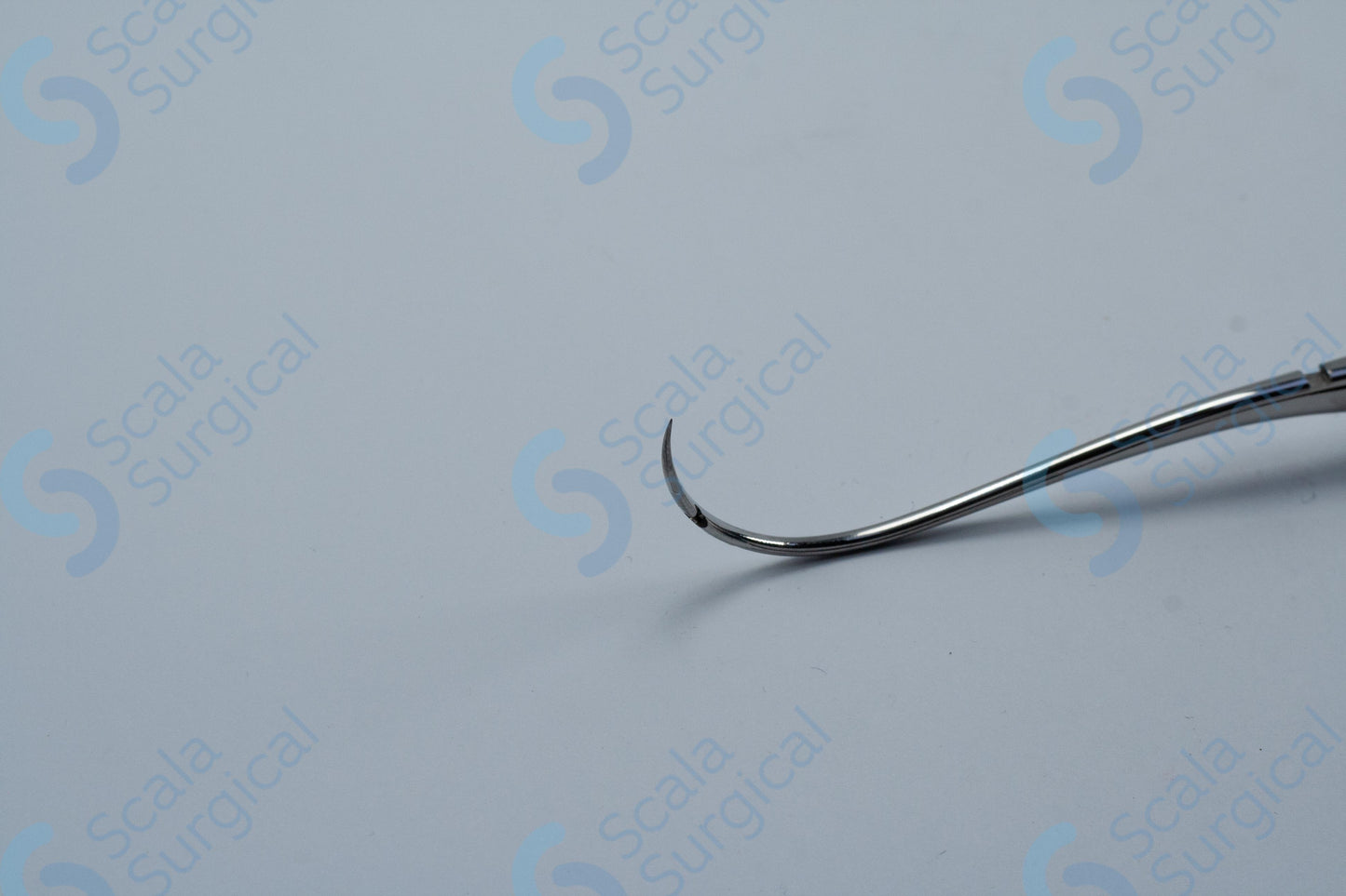 The Reverdin Needle Holder is a surgical instrument used to hold and manipulate needles during suturing procedures. It features a needle inside the handle, which is used to grip and pull the thread or suture material through the tissue. The needle holder is also used to tie knots in the suture.