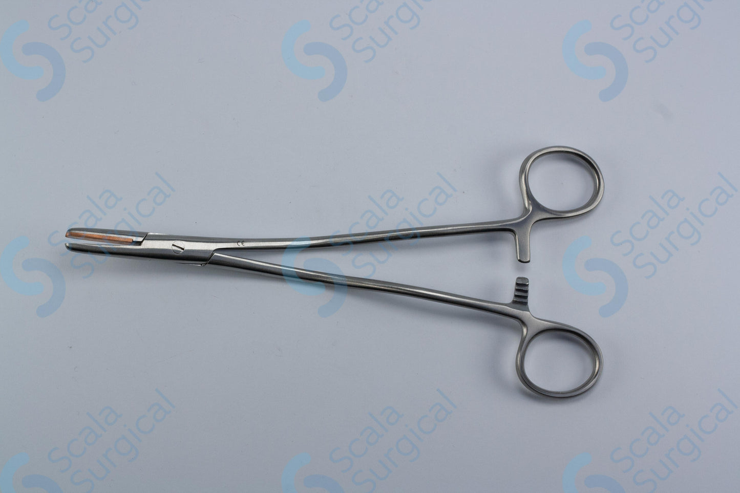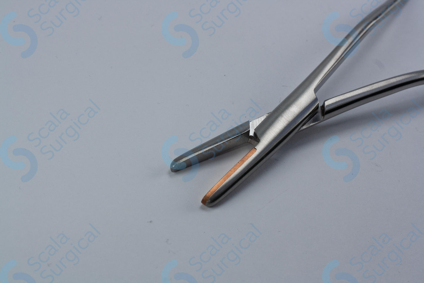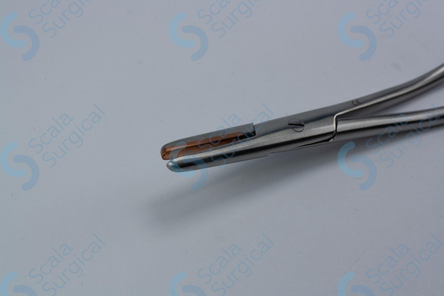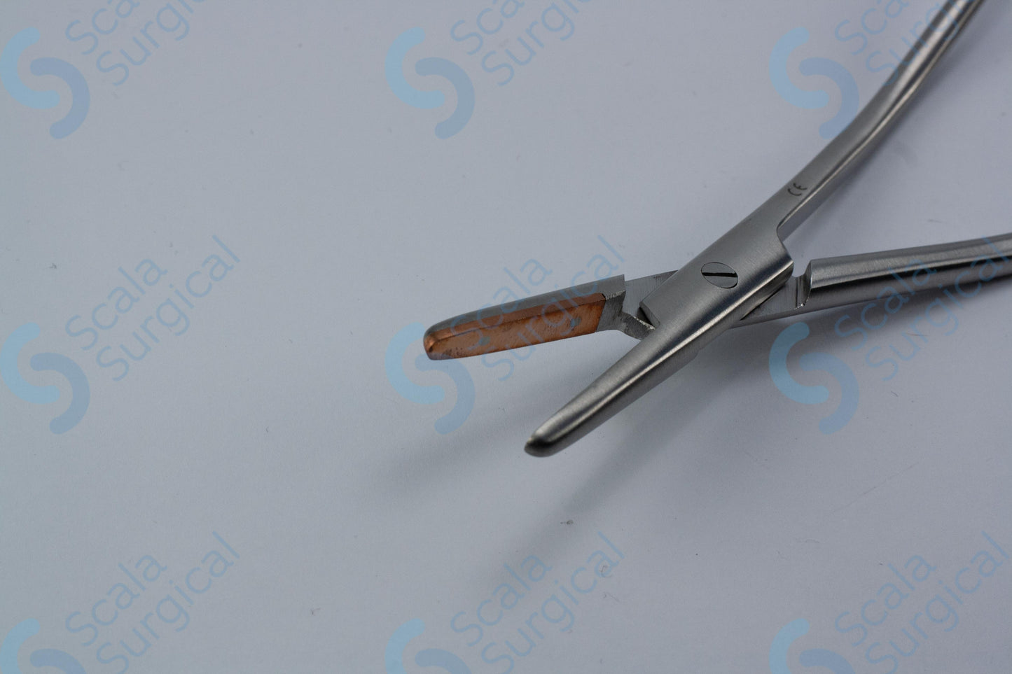 A Bozemann Needle Holder is a surgical instrument used for holding and manipulating needles during suturing and other procedures. It features copper-lined jaws that provide a secure grip, and a screw joint that allows for precise adjustment of the opening size.