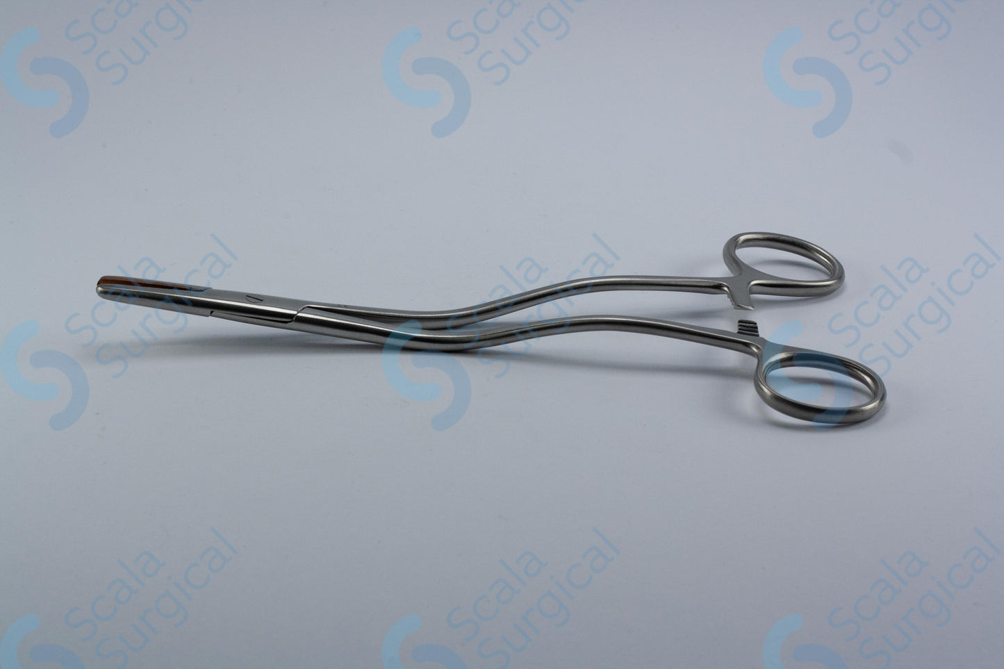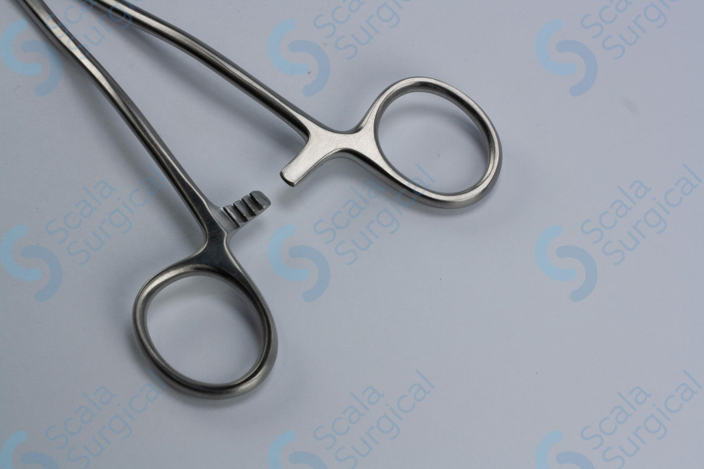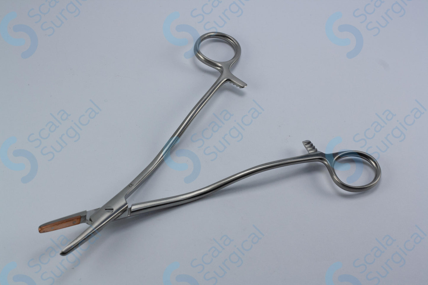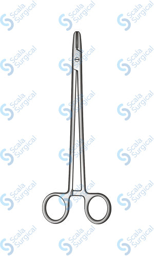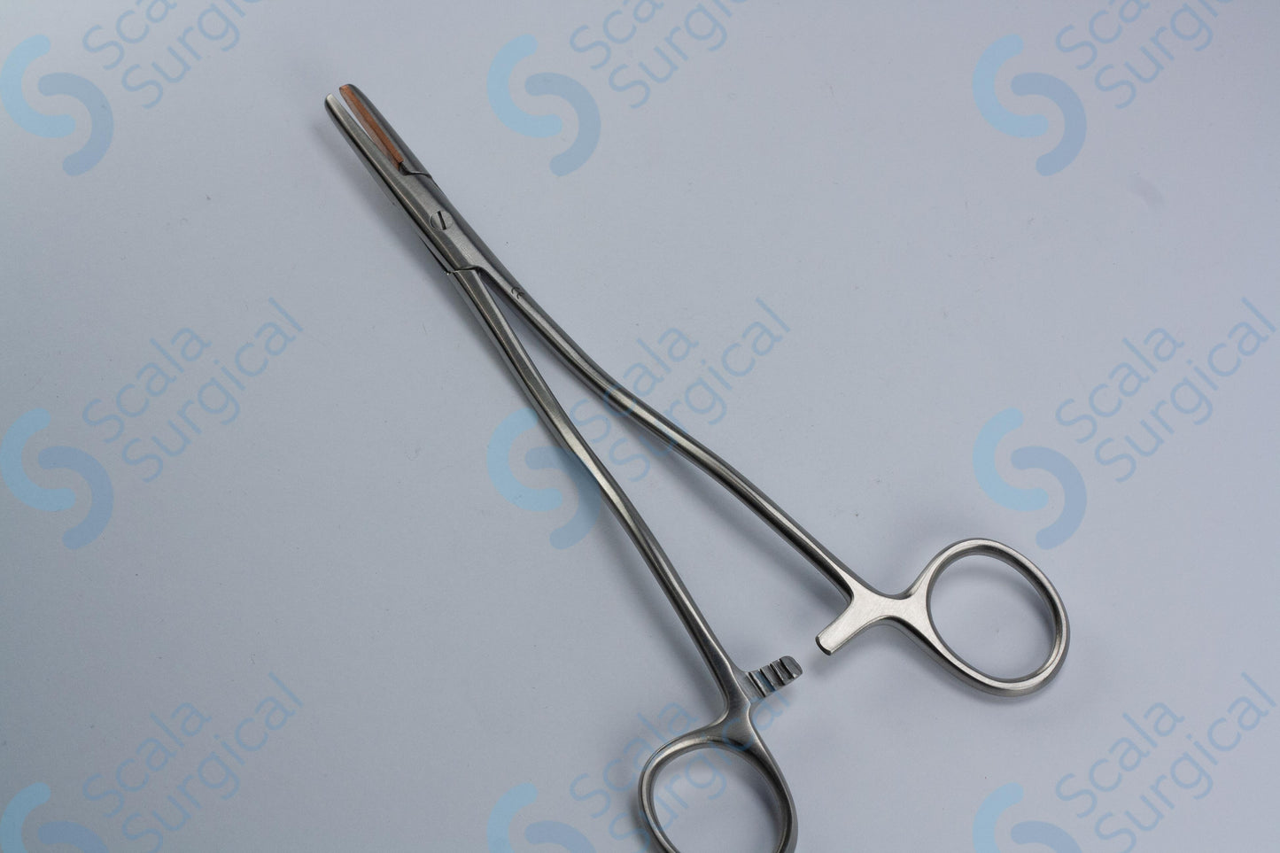 A Bozemann Needle Holder is a surgical instrument used for holding and manipulating needles during suturing and other procedures. It features copper-lined jaws that provide a secure grip, and a screw joint that allows for precise adjustment of the opening size.