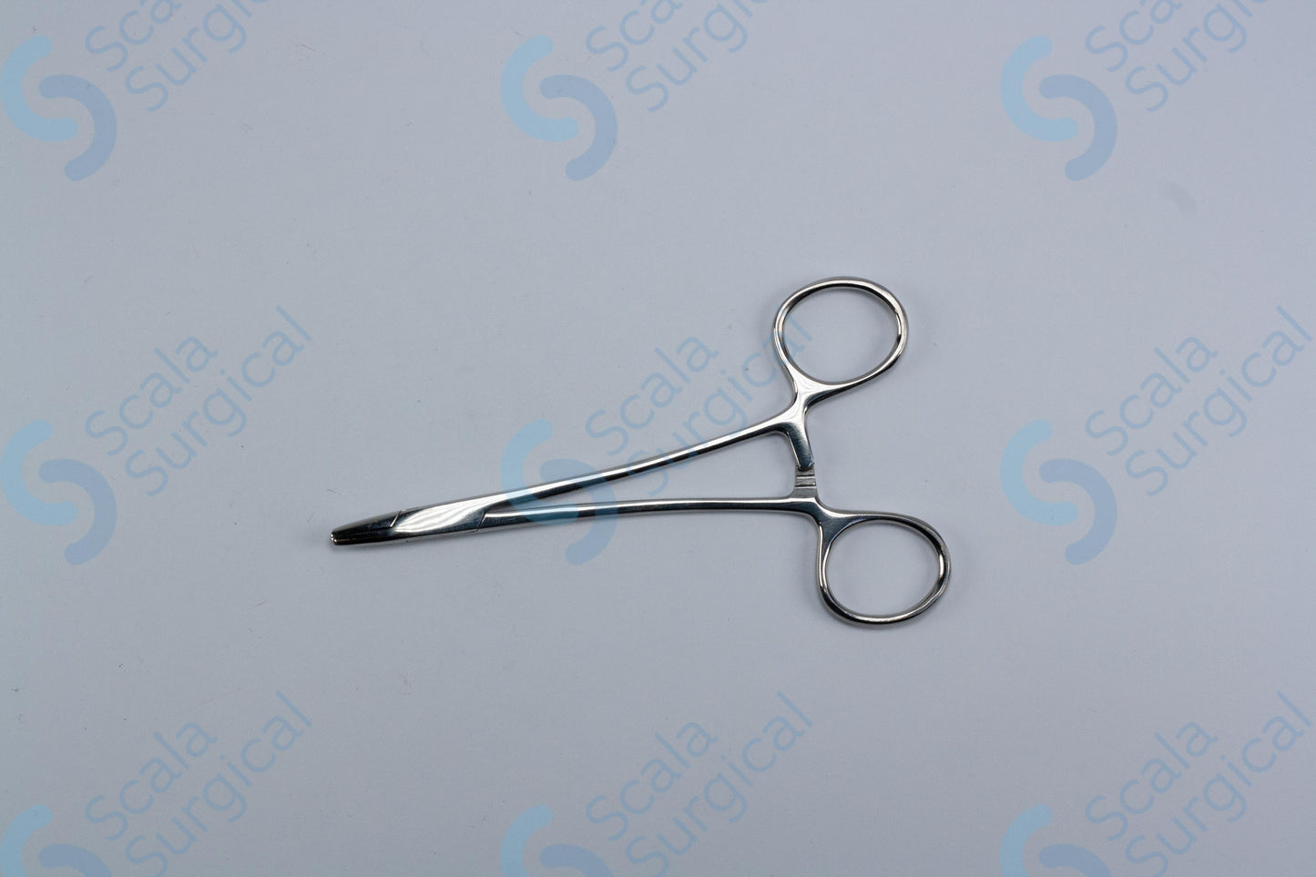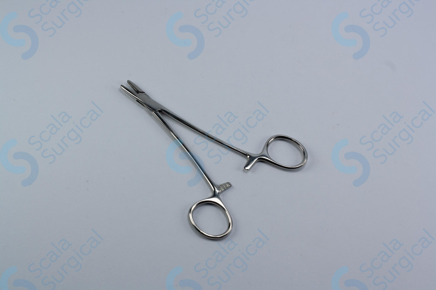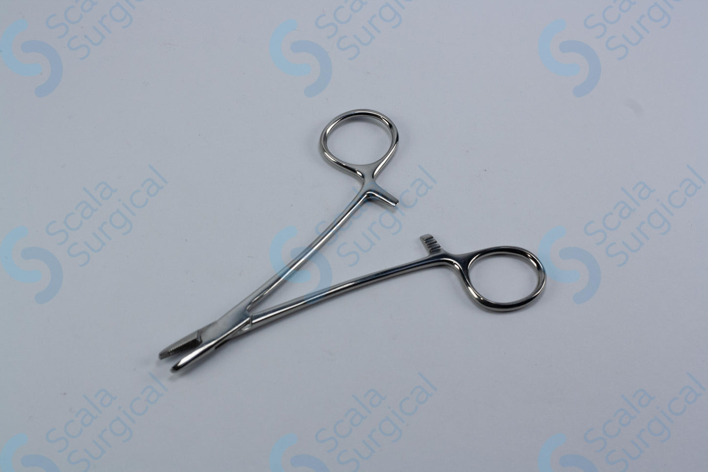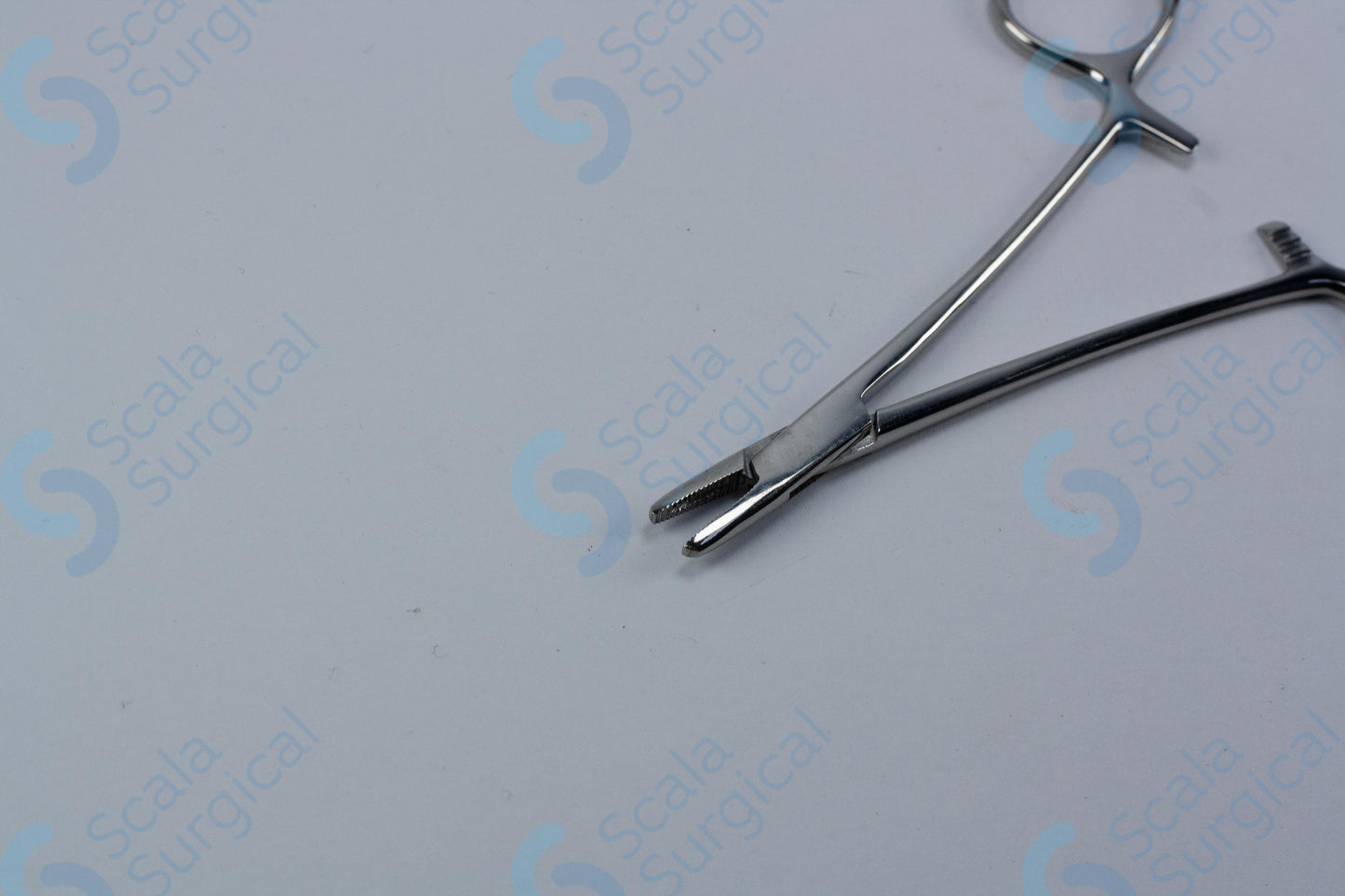 A Derf Needle Holder Box Joint is a type of surgical instrument used to hold and manipulate needles for suturing during surgery. It is a long, thin instrument with two handles and a box joint that allows for a secure grip on the needle. The instrument is typically made of stainless steel and comes in various sizes, such as the 120.65mm (4? inch) size referenced in the description.