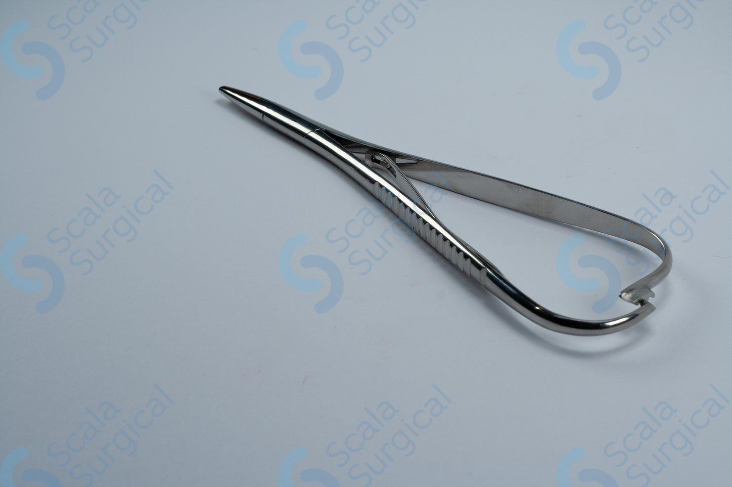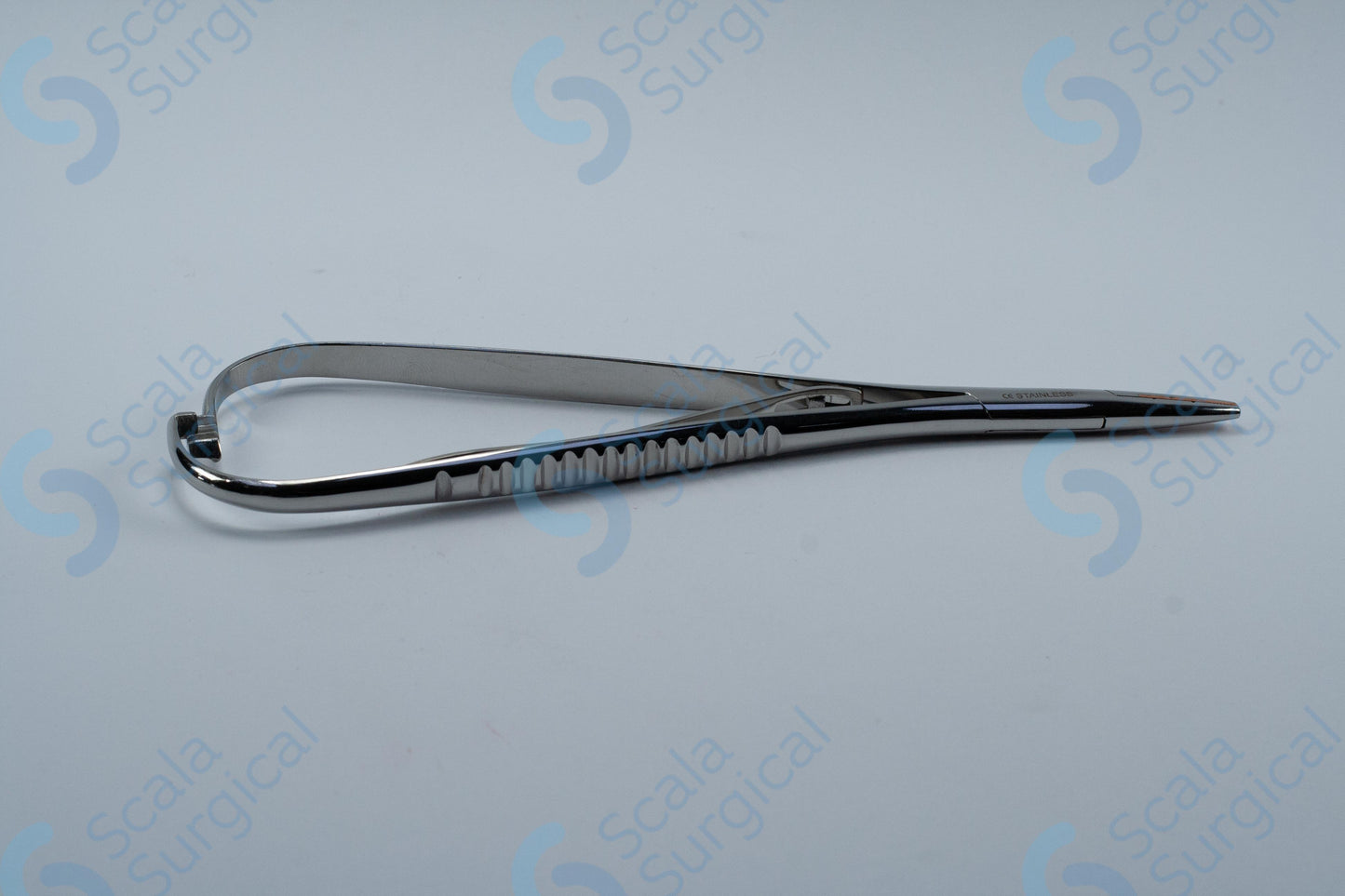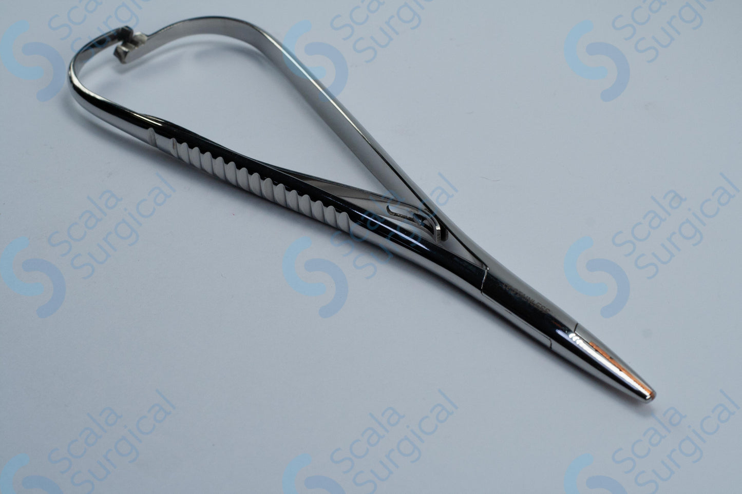 A Macphail Needle Holder is a surgical instrument used to hold needles and sutures during suturing and surgical procedures. The box joint design of this particular needle holder provides a secure grip and greater control when manipulating the needle. The copper lining on the jaws prevents needles from slipping and helps to reduce tissue trauma.