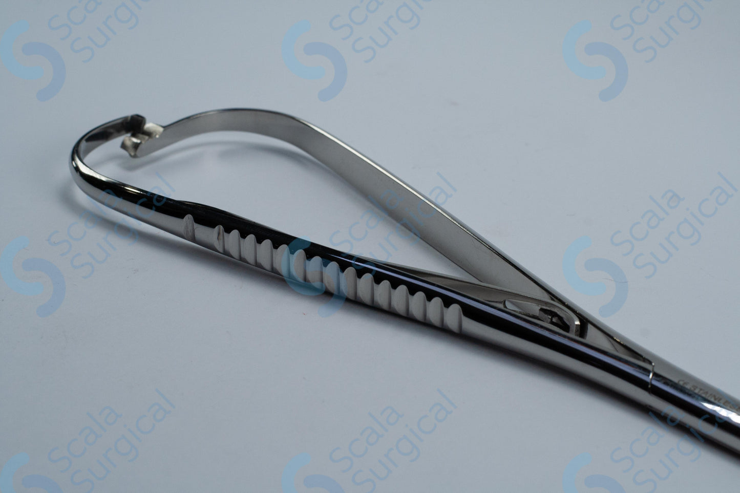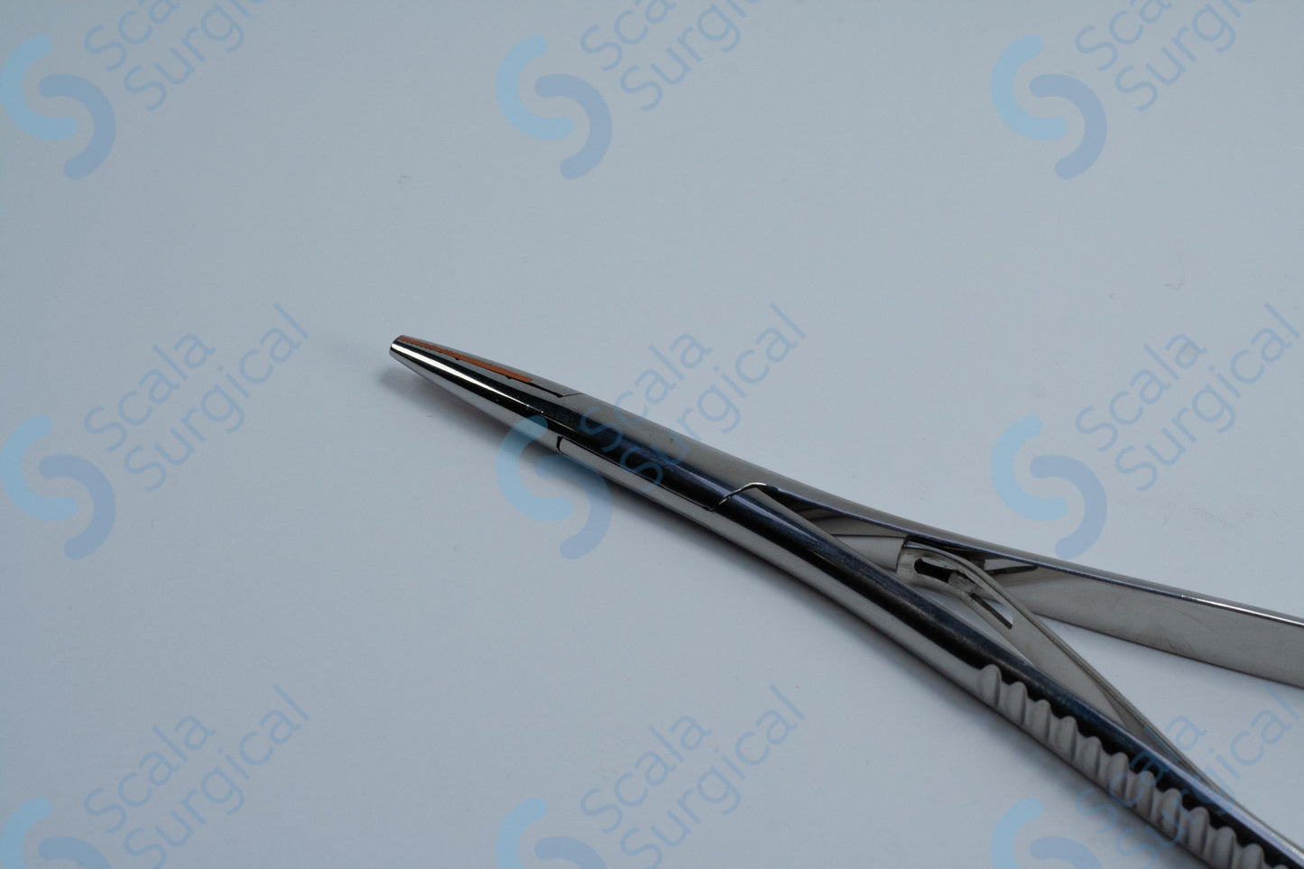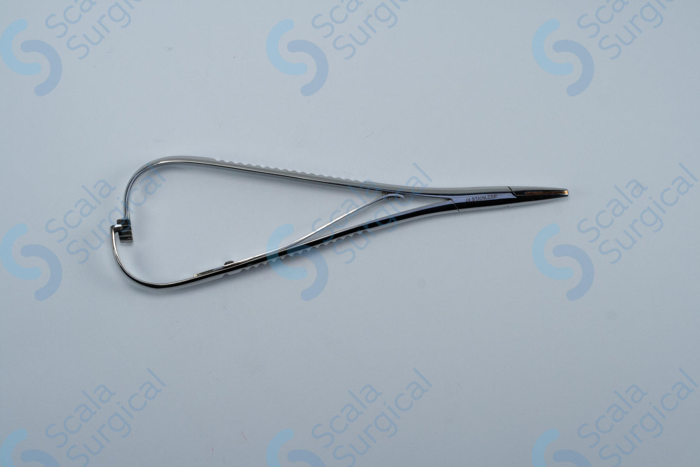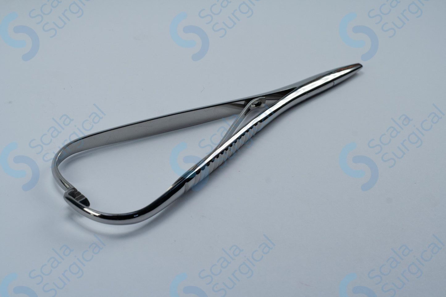 A Macphail Needle Holder is a surgical instrument used to hold needles and sutures during suturing and surgical procedures. The box joint design of this particular needle holder provides a secure grip and greater control when manipulating the needle. The copper lining on the jaws prevents needles from slipping and helps to reduce tissue trauma.