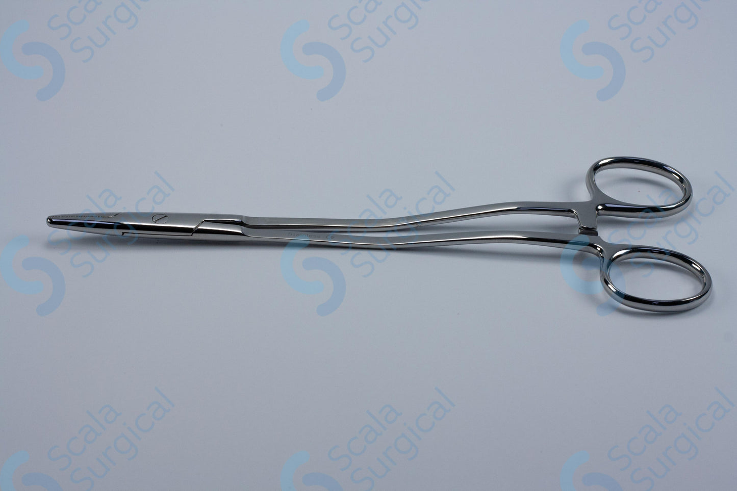 A Sims Needle Holder is a surgical instrument used to hold suturing needles for closing wounds. It has two blades that can be opened and closed with a screw joint, allowing the surgeon to securely grip the needle. The Straight Shanks Screw Joint version is 190.5mm (7? inch) long and is commonly used in general and orthopedic surgery.