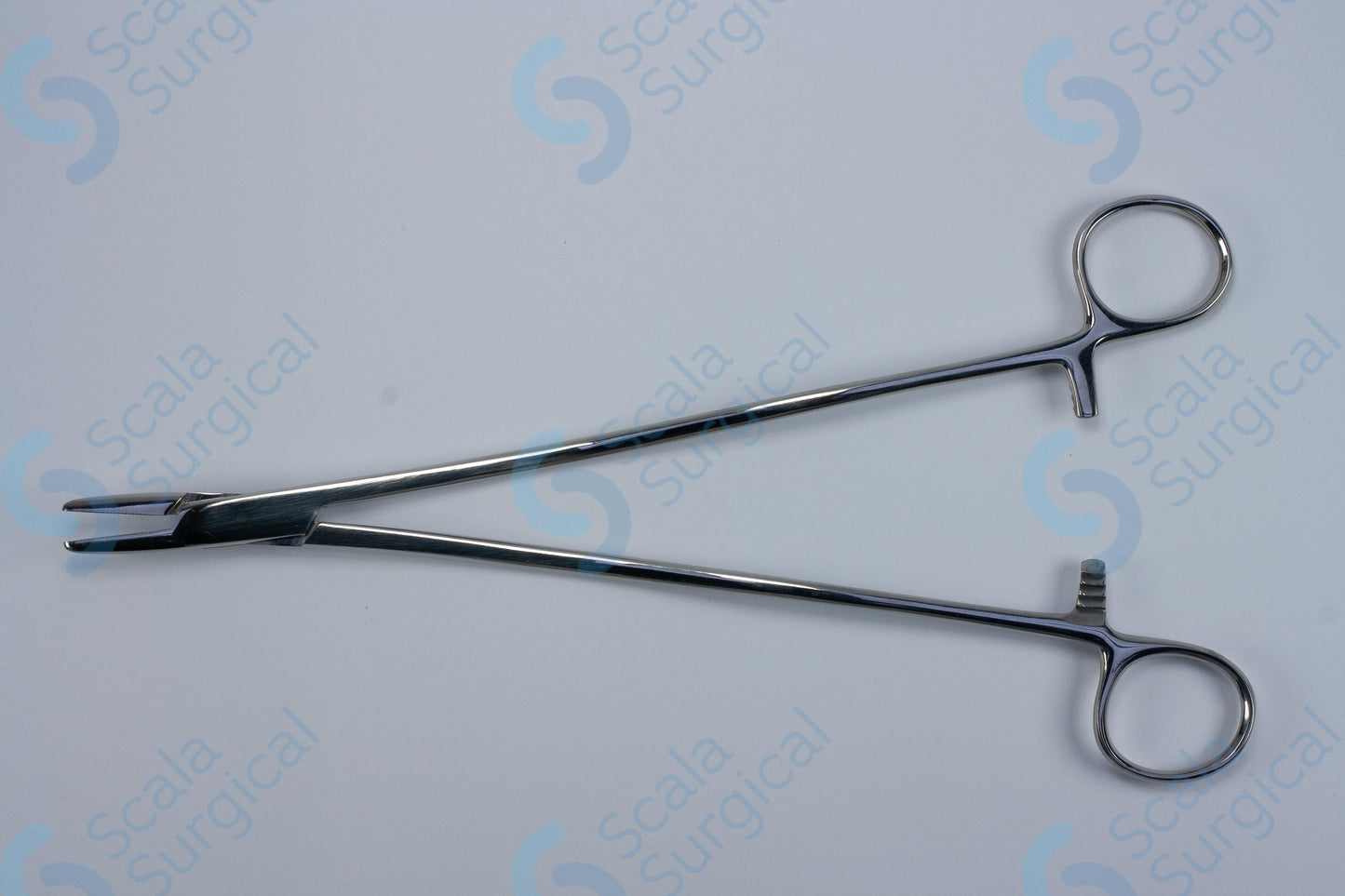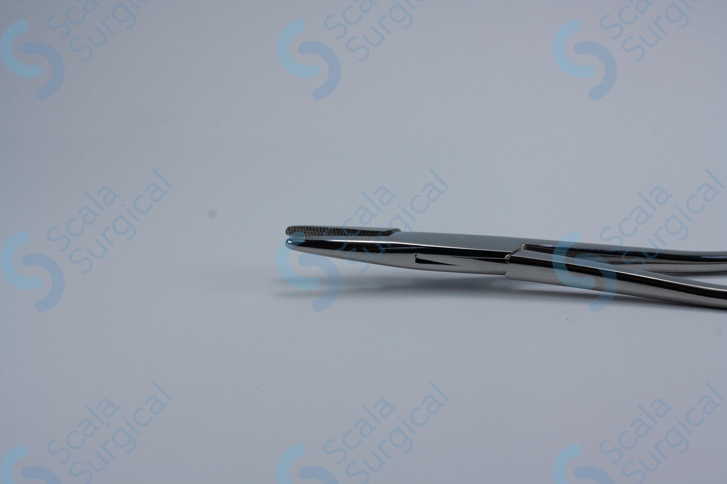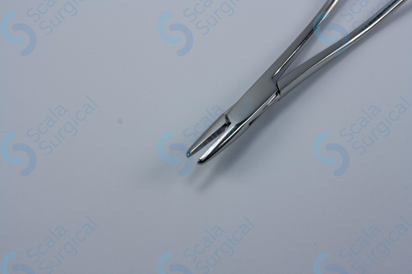 This is a surgical instrument used to hold and manipulate needles during suturing. It is usually made of stainless steel and has curved shanks and a box joint for a secure grip.