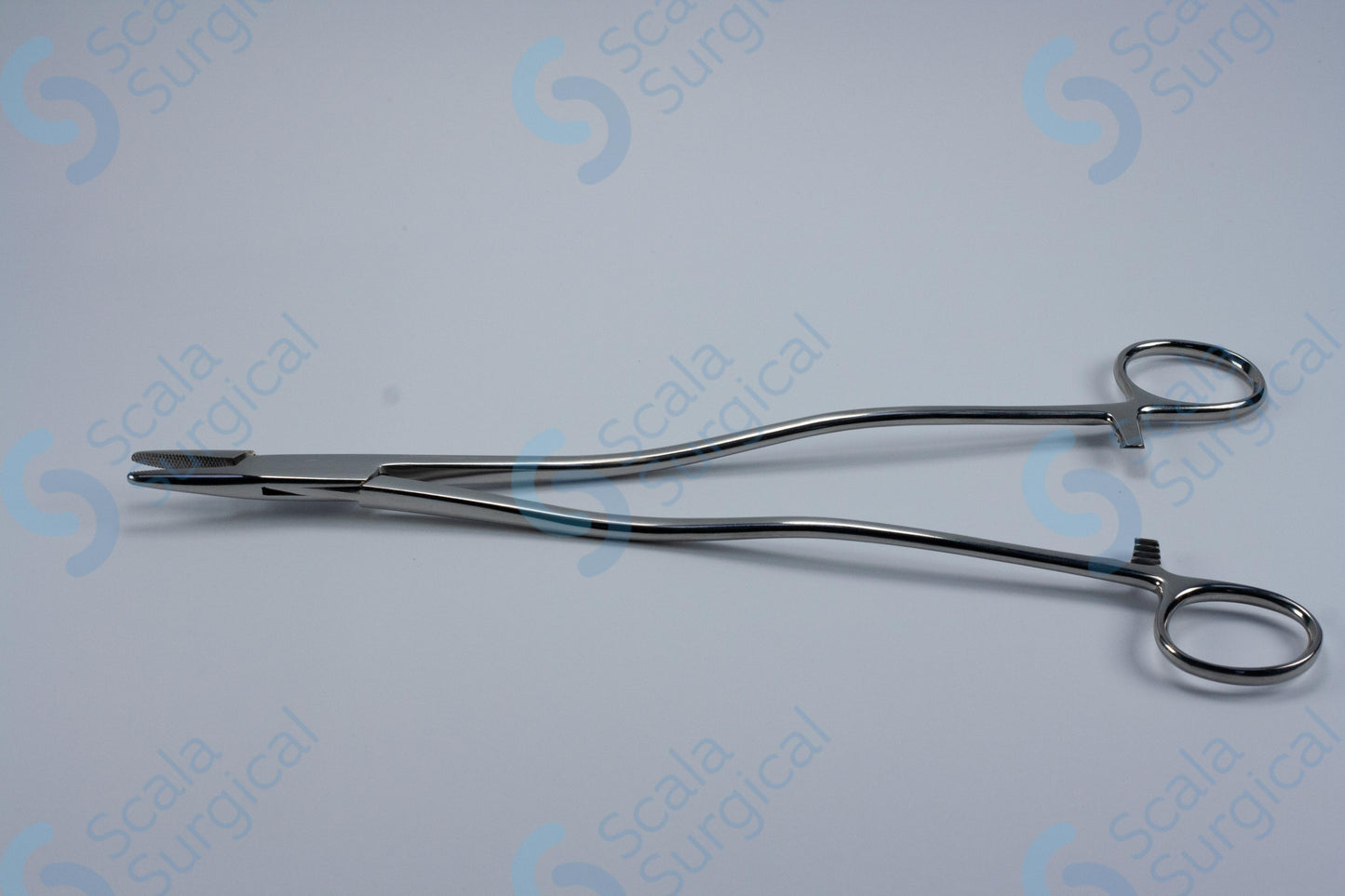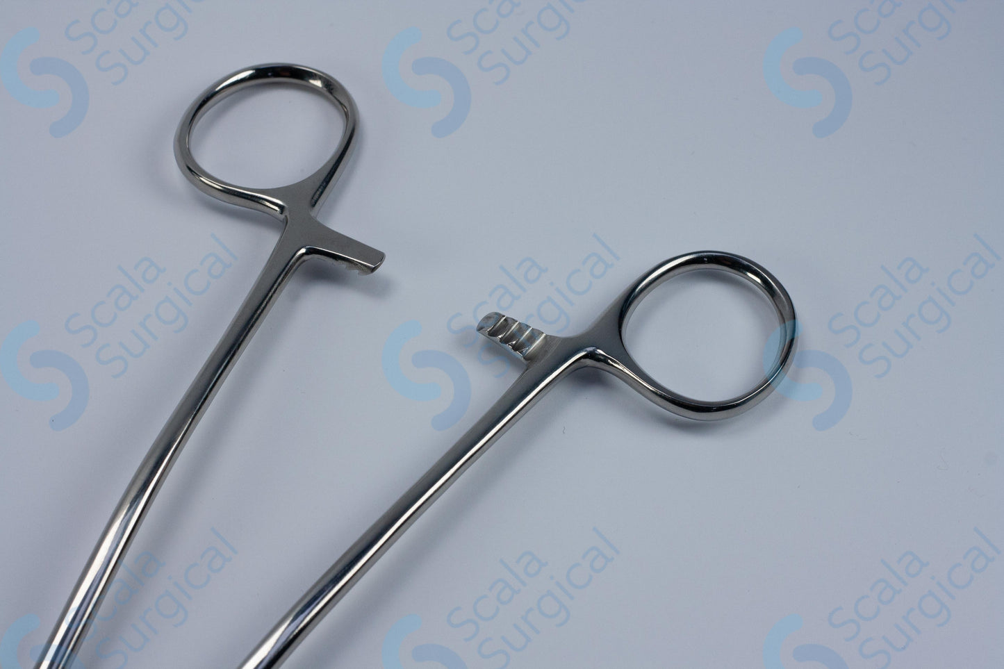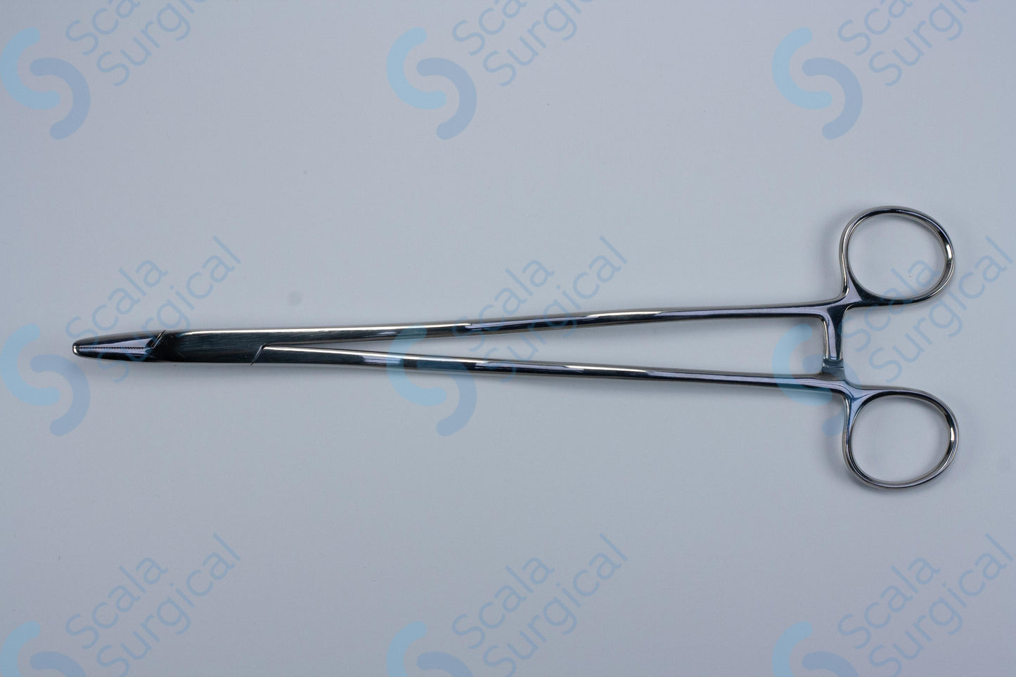This is a surgical instrument used to hold and manipulate needles during suturing. It is usually made of stainless steel and has curved shanks and a box joint for a secure grip.
