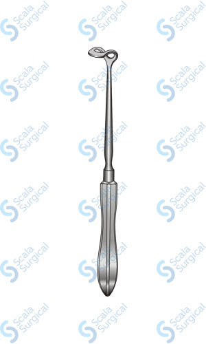 The Beckmann Adenoid Curette Hollow Handle is a surgical instrument used to remove adenoid tissue from the back of the nose. It is typically used during adenoidectomy surgery. The curette opening diameter is 16mm, and the overall length is 209.55mm (8? inch).