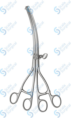 This is a surgical instrument used in abdominal surgery to clamp and hold the intestine in place during a procedure. It is specifically designed to be used during laparoscopic procedures.