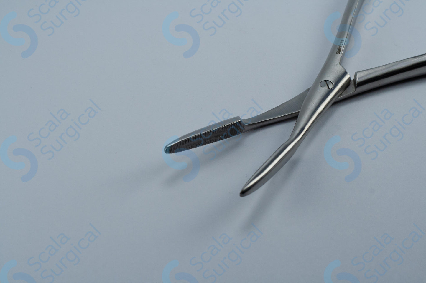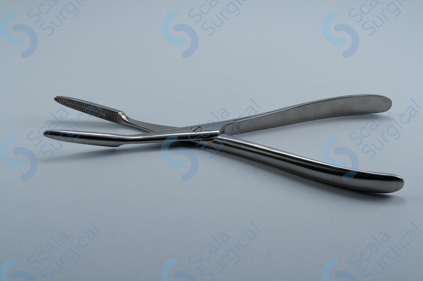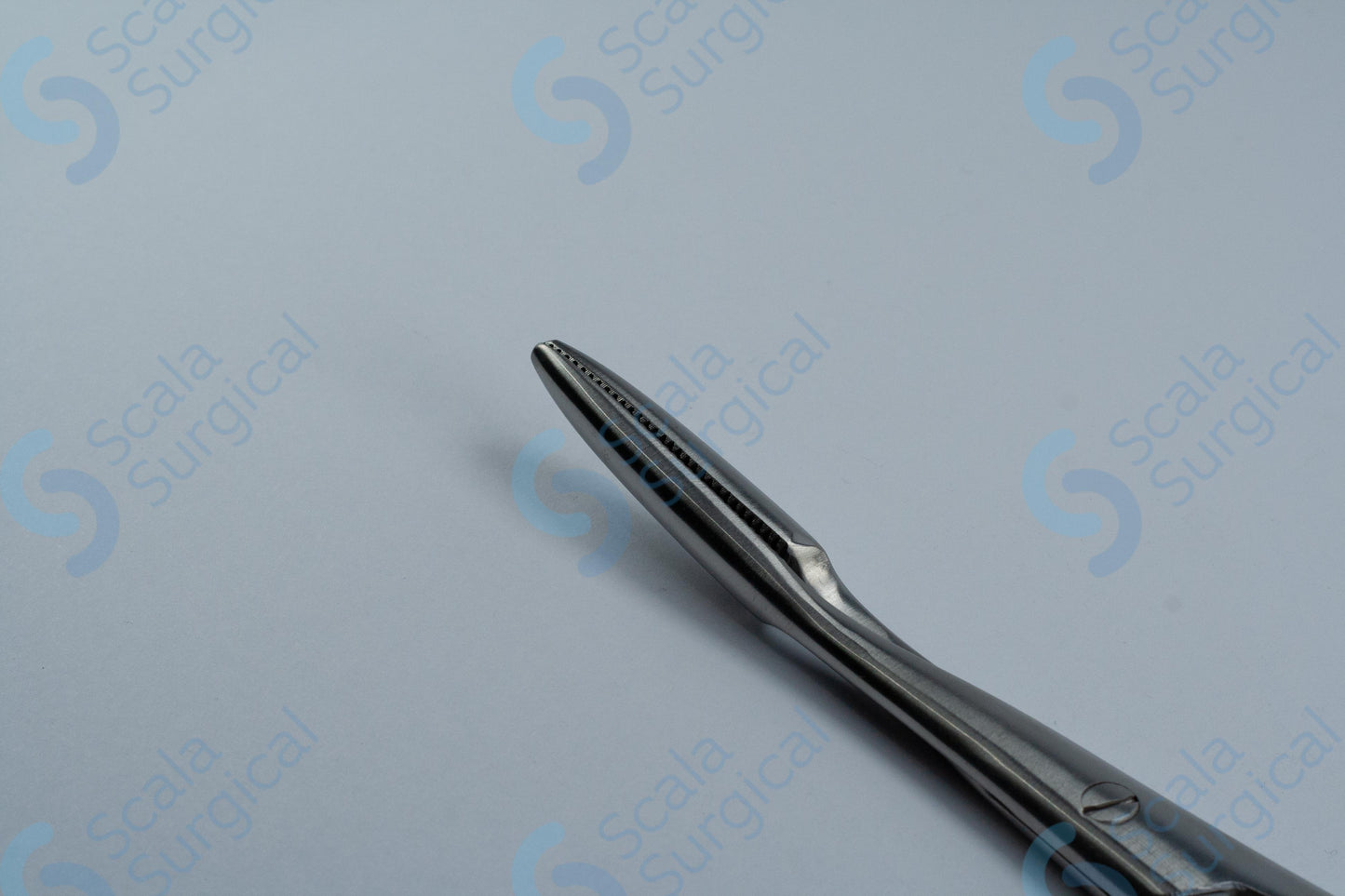 Sequestrum forceps are surgical instruments used to remove dead or non-viable tissue from a wound or surgical site. They are typically used to remove necrotic tissue, such as bone or cartilage, that is not able to be removed with other instruments. The forceps are slightly curved and have a jaw length of 38.1mm (203.2mm or 8 inches).