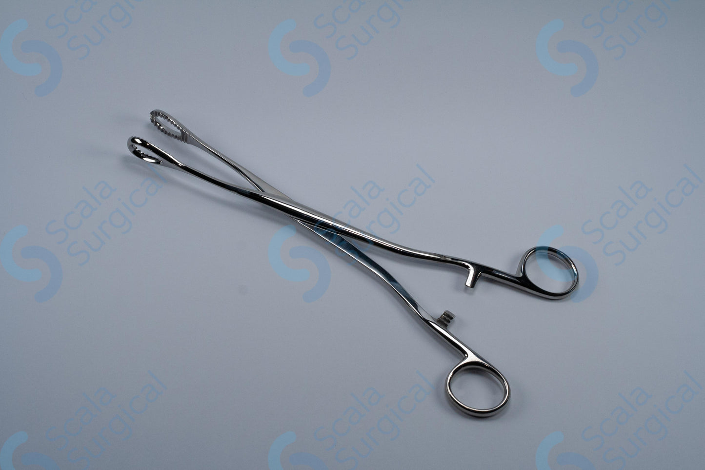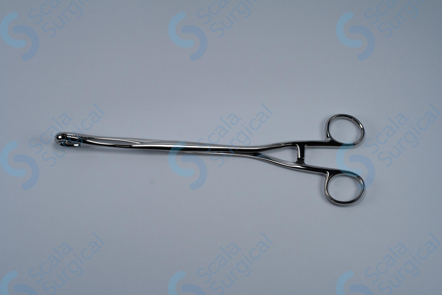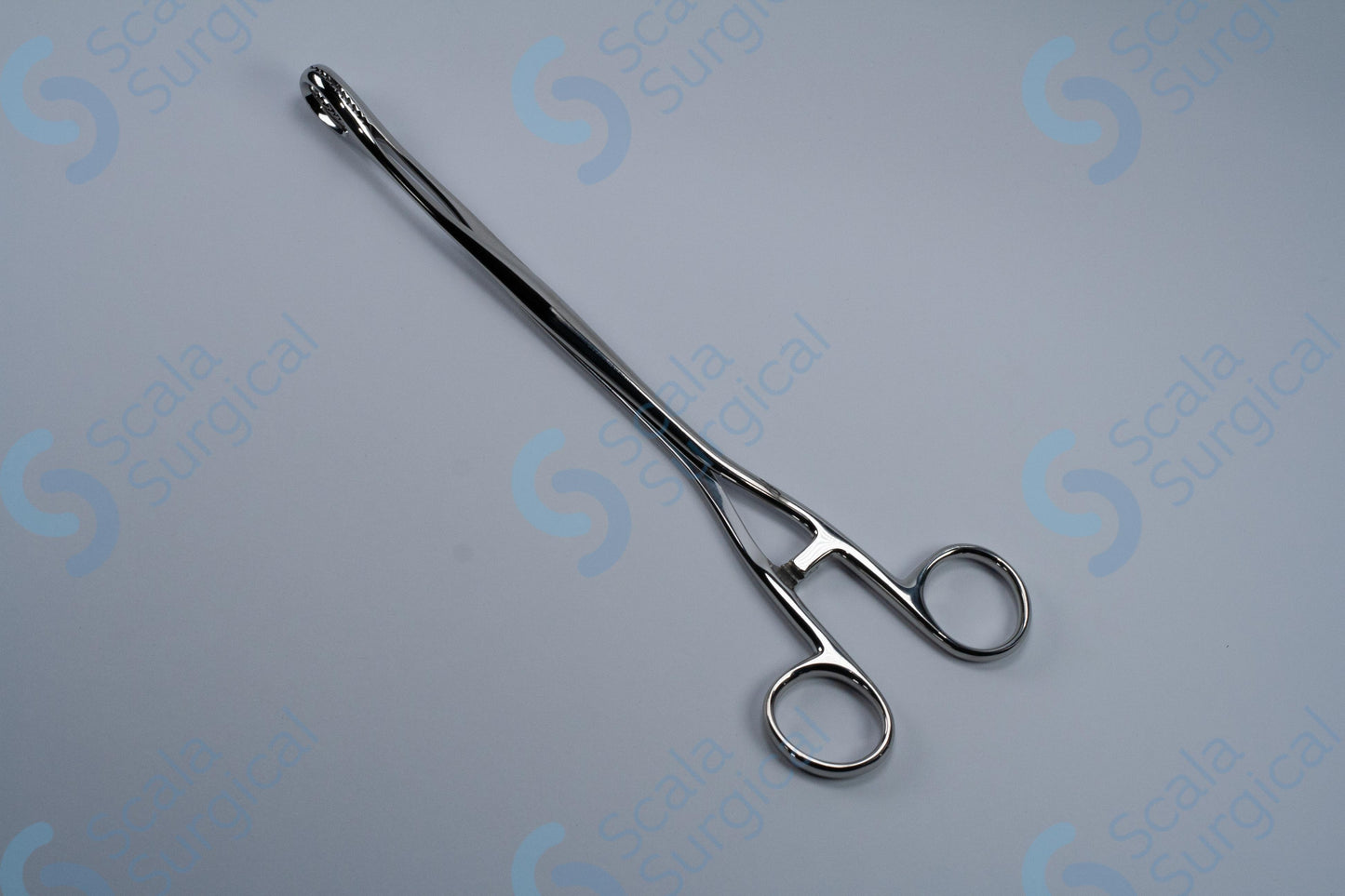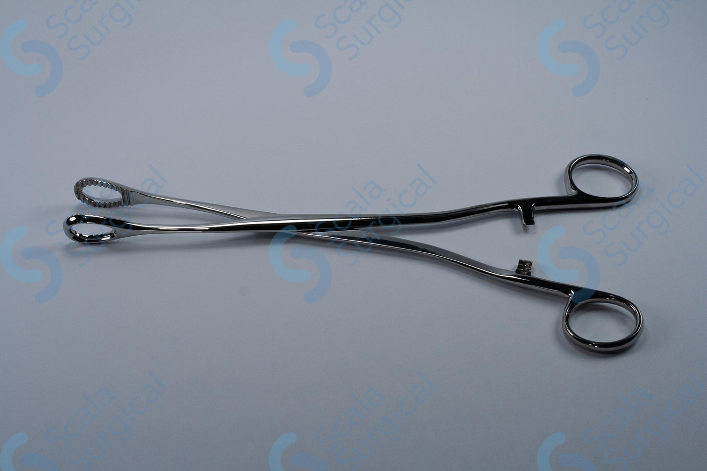 Heywood Ovum Forceps Round Jaws Screw Joint (254mm) (10 inch) is a surgical instrument used to grasp and hold objects, usually tissue or an ovum (egg). It is commonly used during gynecological procedures, such as tubal ligation, and for retrieval of specimens during laparoscopy.