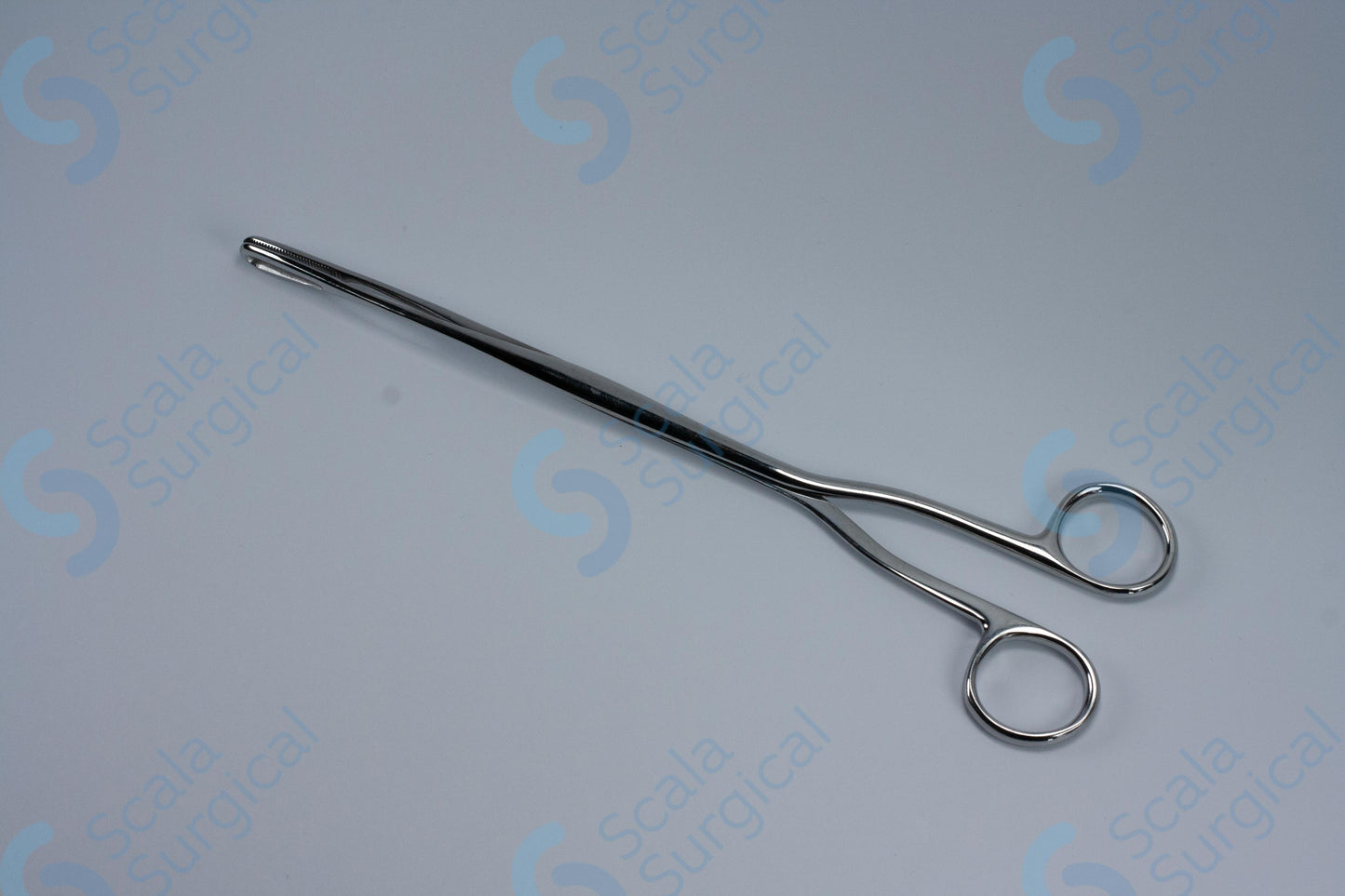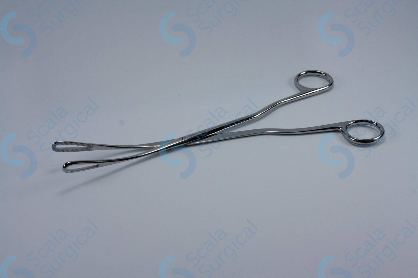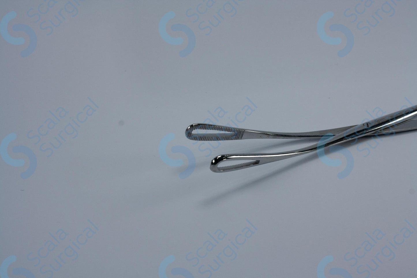 These forceps are used to grasp and hold small objects, such as eggs or embryos, during a surgical procedure. The curved design of the forceps allows them to fit into small spaces and the serrated jaws provide a secure grip. The fenestrated design also helps to reduce tissue trauma.