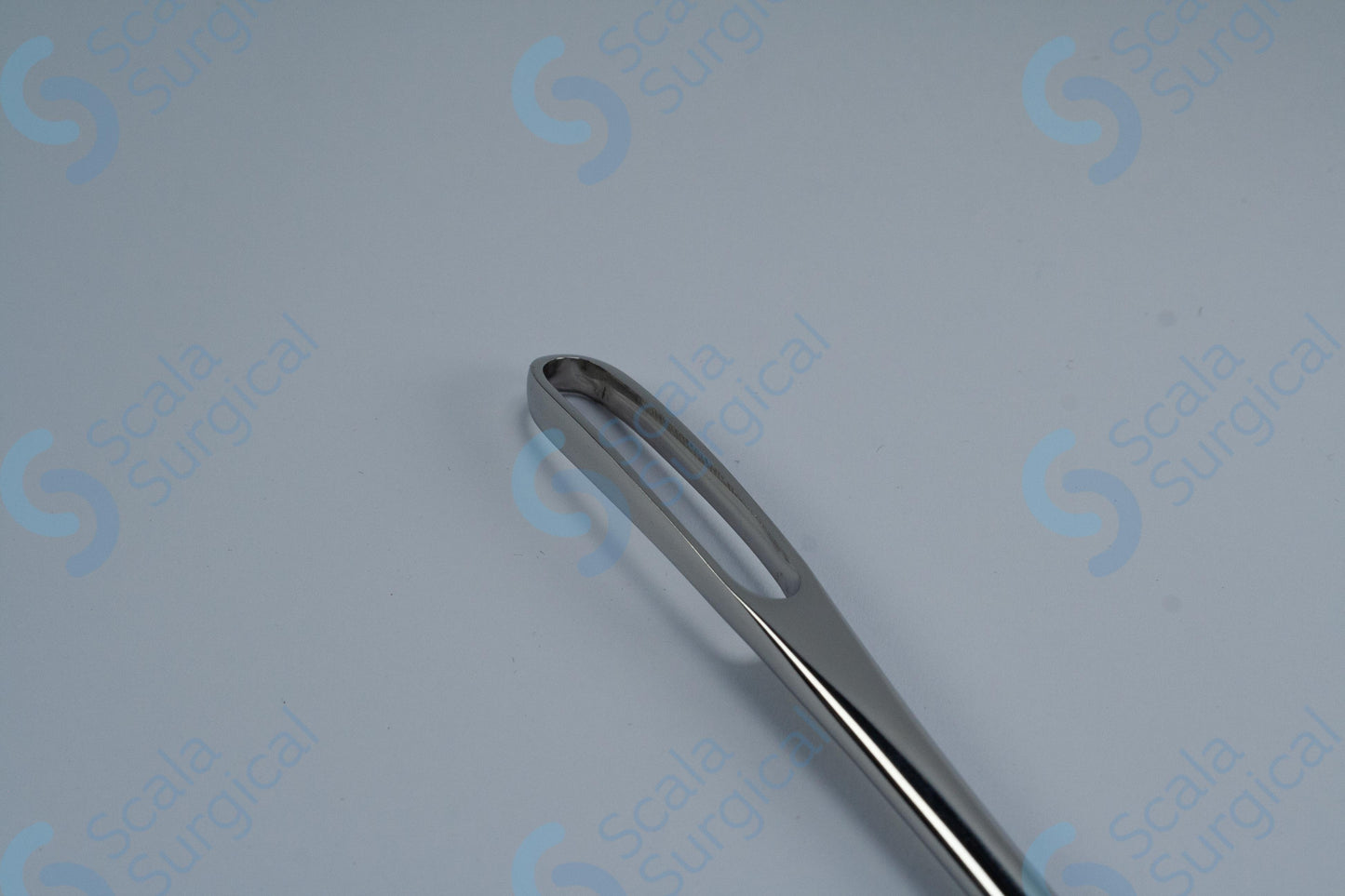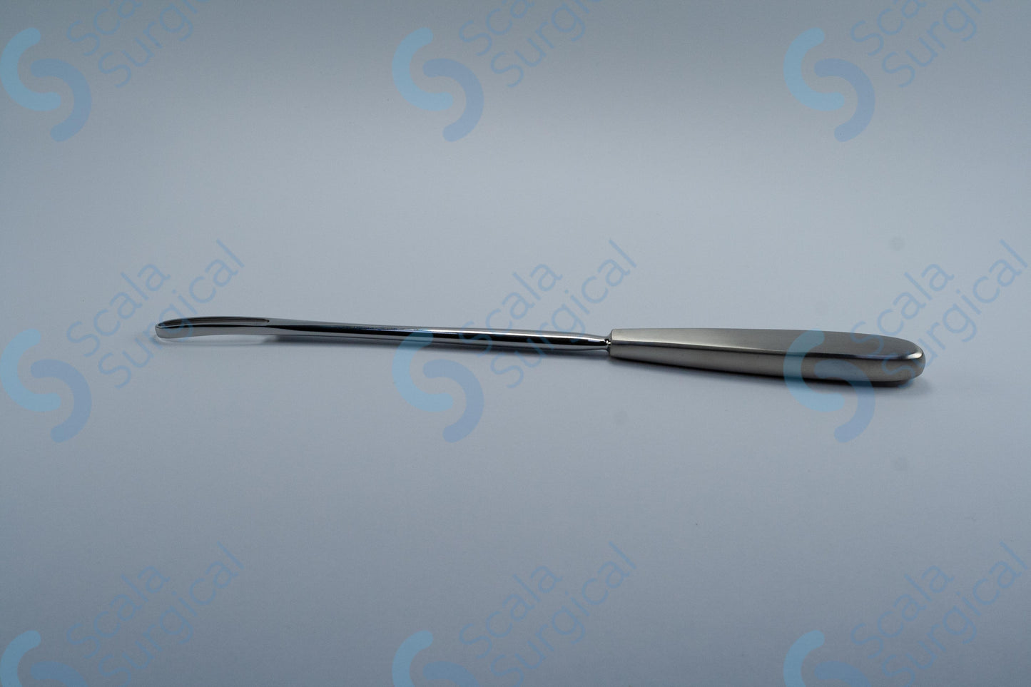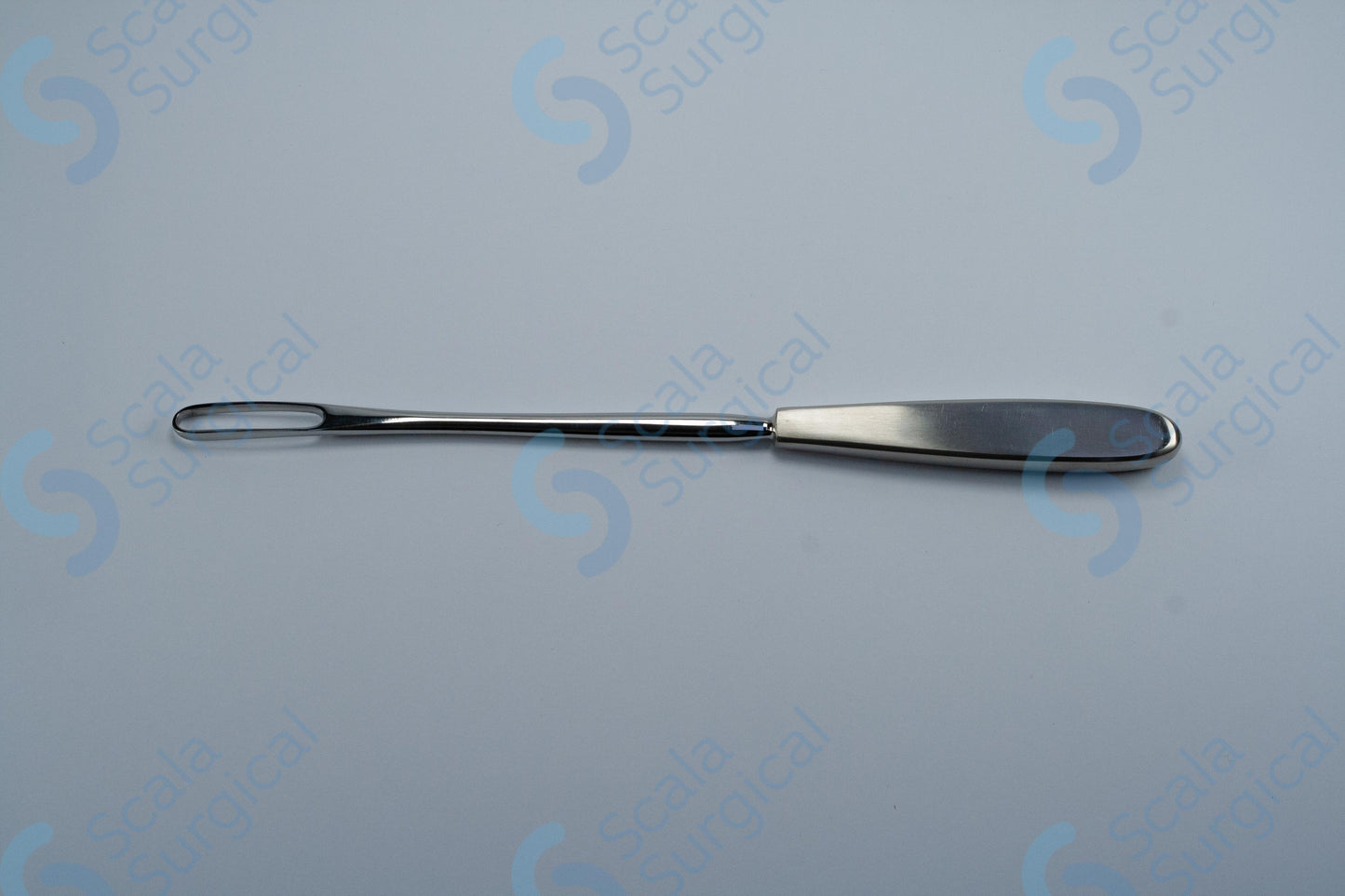 A Evans Uterine Curette Single Ended is a surgical instrument used to scrape the lining of the uterus during a procedure called a dilation and curettage (D&C). The width of the curette is 10mm and is used to scrape away any abnormal tissue.