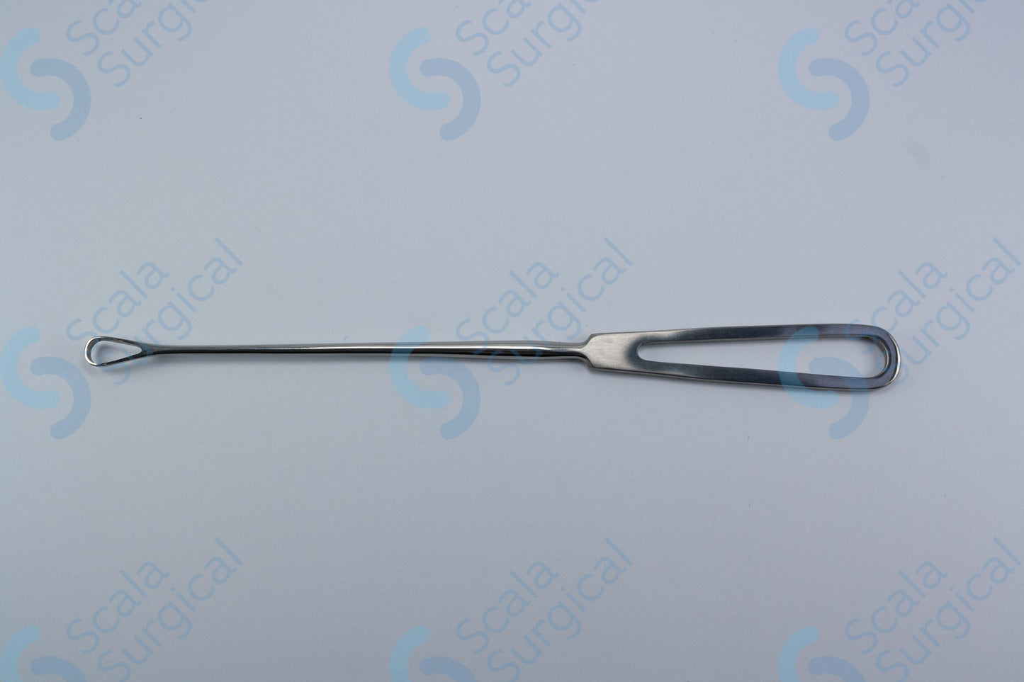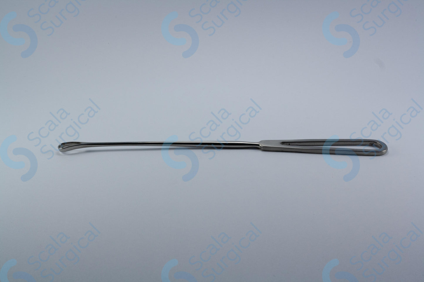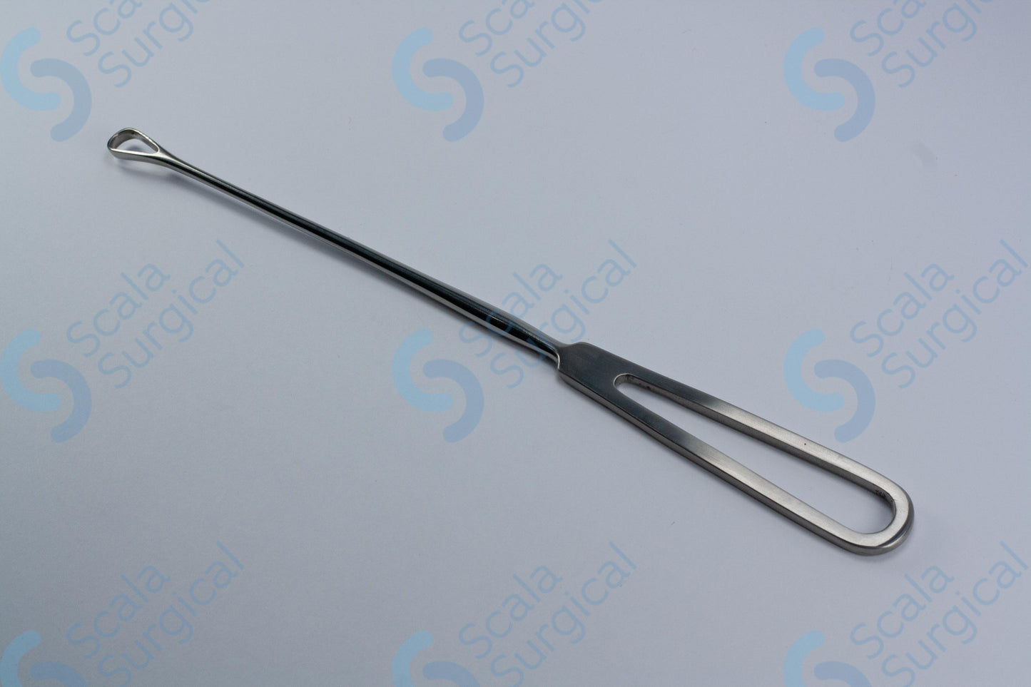 A Sims Uterine Curette is a surgical instrument used to scrape the endometrium (lining of the uterus) during a procedure known as a dilation and curettage (D&C). The sharp edge of the curette is used to scrape away the endometrium, while the ring handle is used to provide the surgeon with a secure grip.