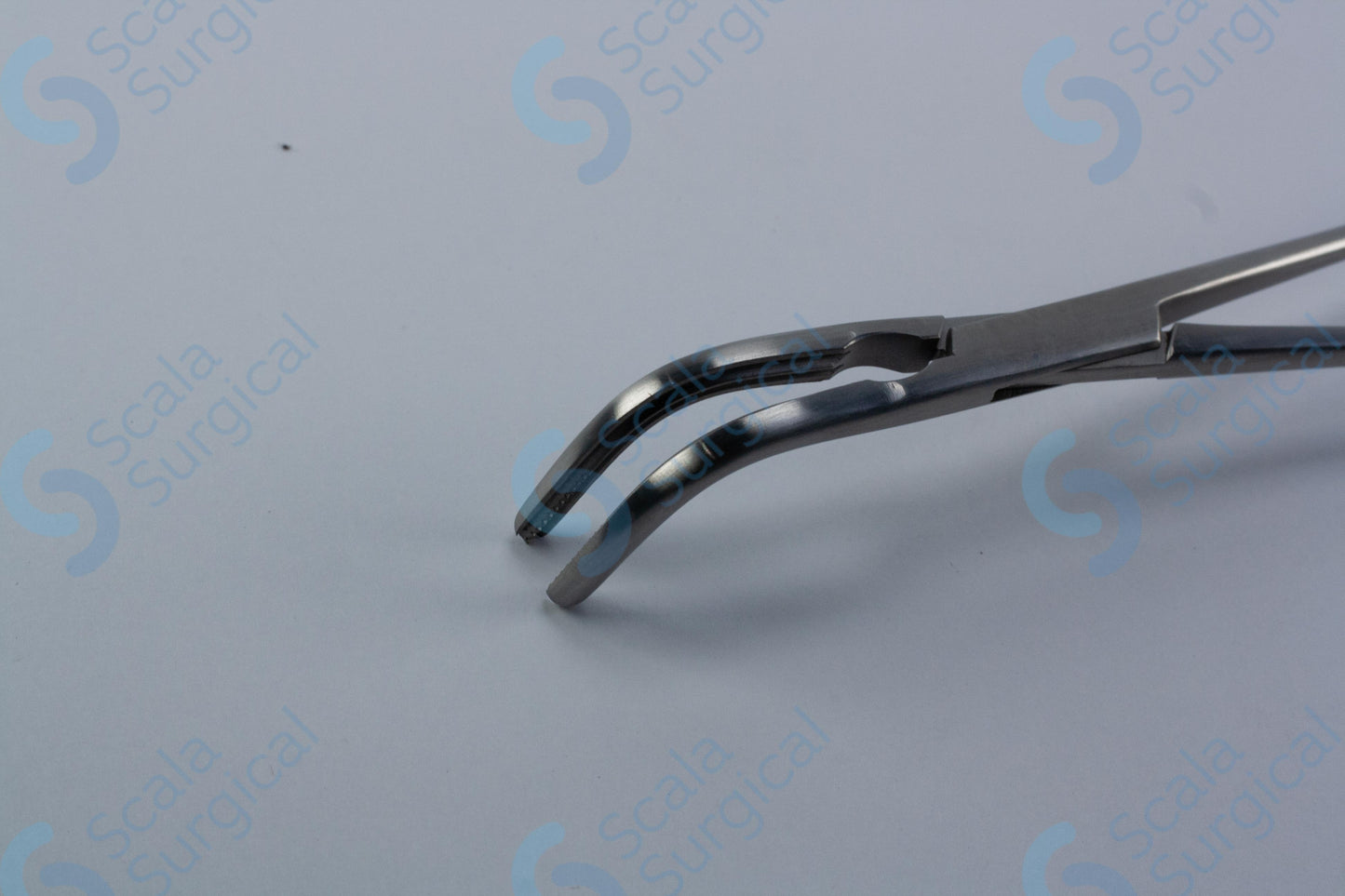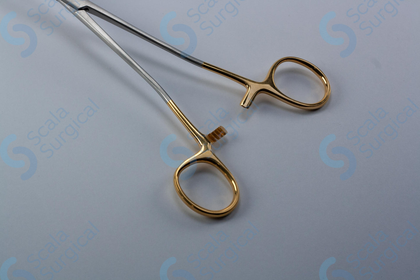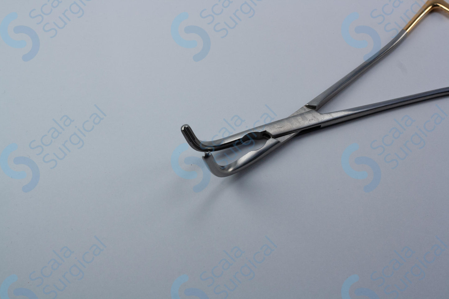 A hysterectomy clamp with gold bows angled (209.55mm) (8? inch) is a surgical instrument used in hysterectomy procedures. It is used to clamp the uterus and other tissue during the procedure. The angled design of the clamp allows for easier access to the uterus and other tissue. The gold bows on the clamp provide a secure grip on the tissue, ensuring that it is held securely during the procedure.