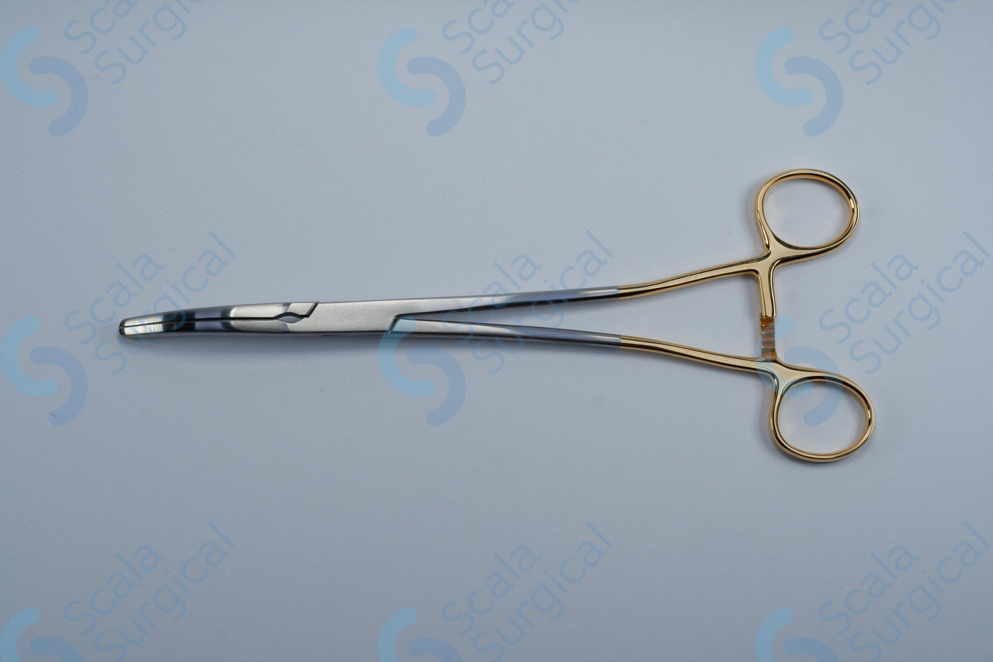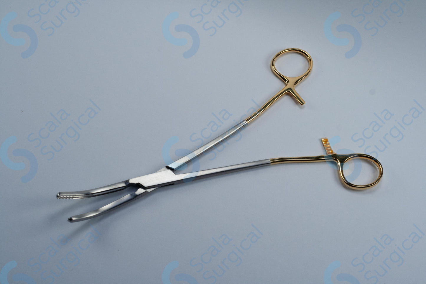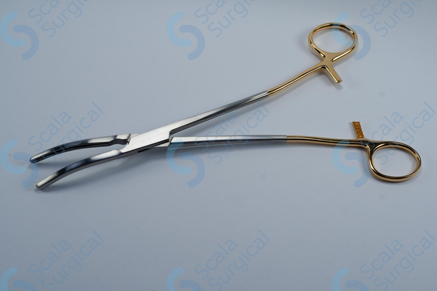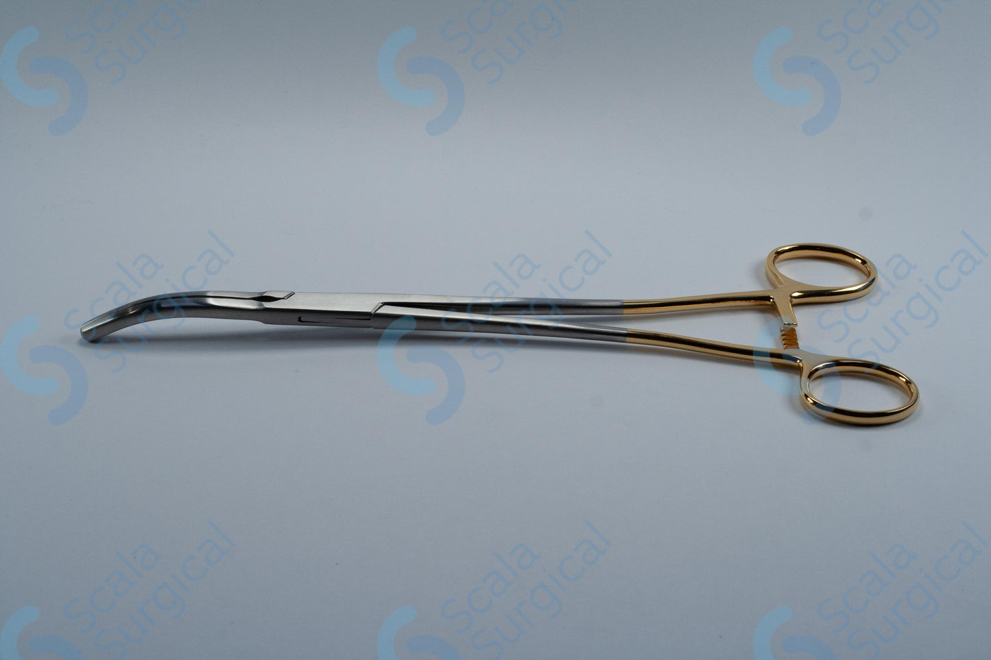 A hysterectomy clamp with gold bows curved (254mm 10 inch) is a medical instrument used to clamp and secure the uterus during a hysterectomy procedure. It is typically used to clamp and secure the uterus prior to its removal from the body.