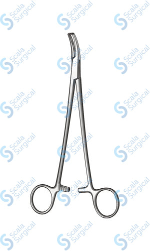 A Faure Hysterectomy Clamp is a surgical instrument used to aid in the removal of a uterus during a hysterectomy procedure. The clamp has 1 x 2 teeth that are deep and curved to help grip the tissue and has a box joint to provide a secure hold. The clamp measures 203.2mm (8 inch) in length.