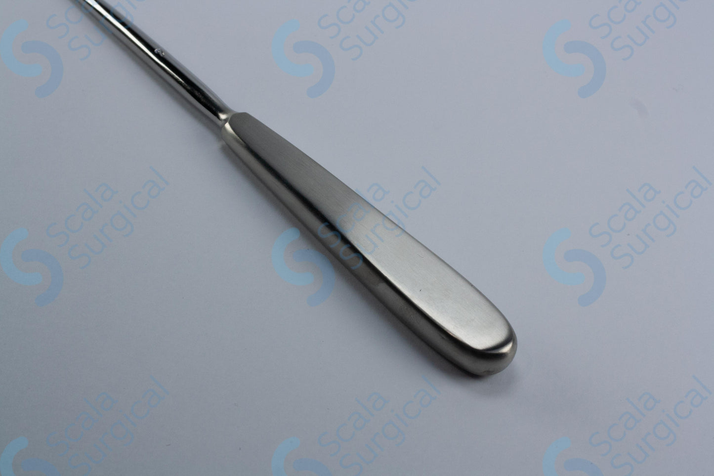 A Sims Uterine Curette is a surgical instrument used to scrape the lining of the uterus during a procedure called a dilation and curettage (D&C). The sharp edges of the curette allow it to remove any abnormal tissue from the uterus. The single-ended rigid shaft helps to provide stability and control while the curette is being used.