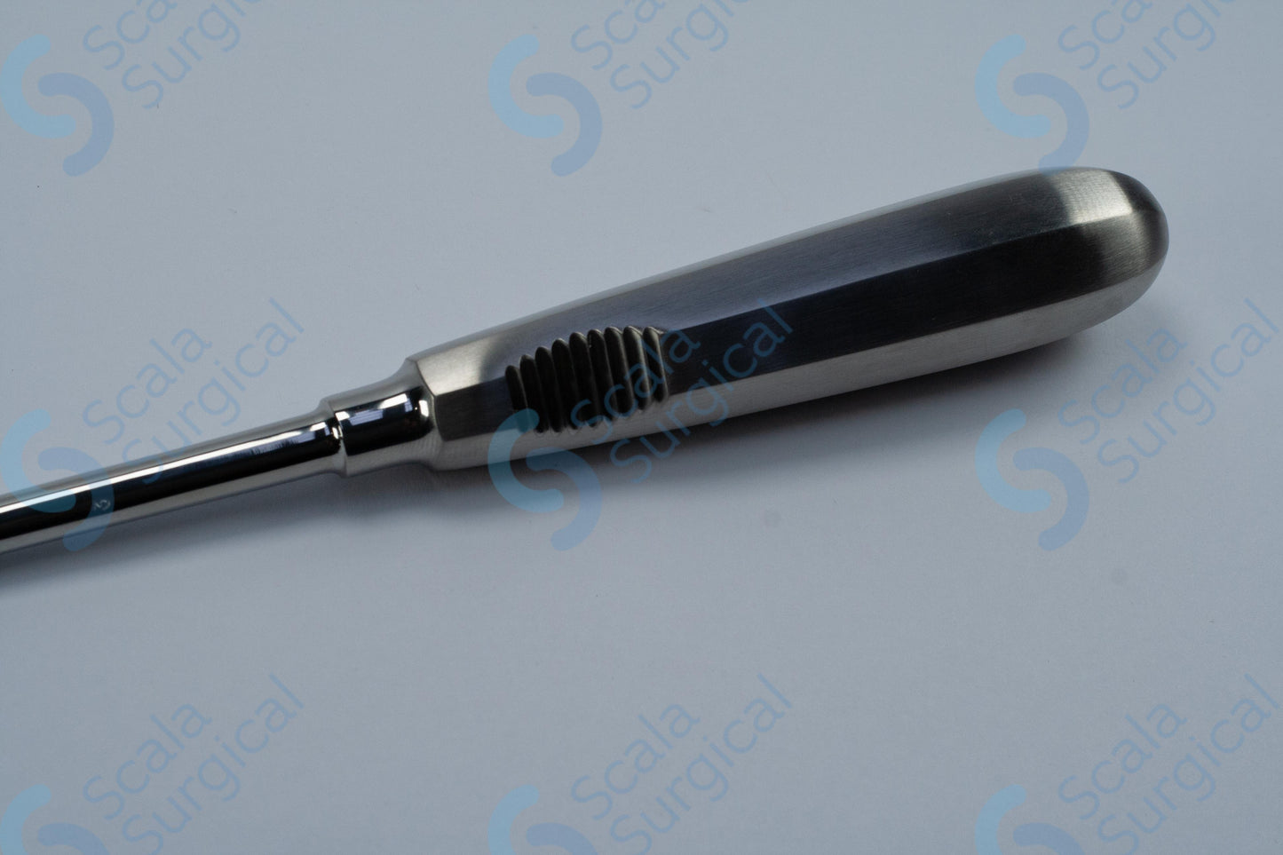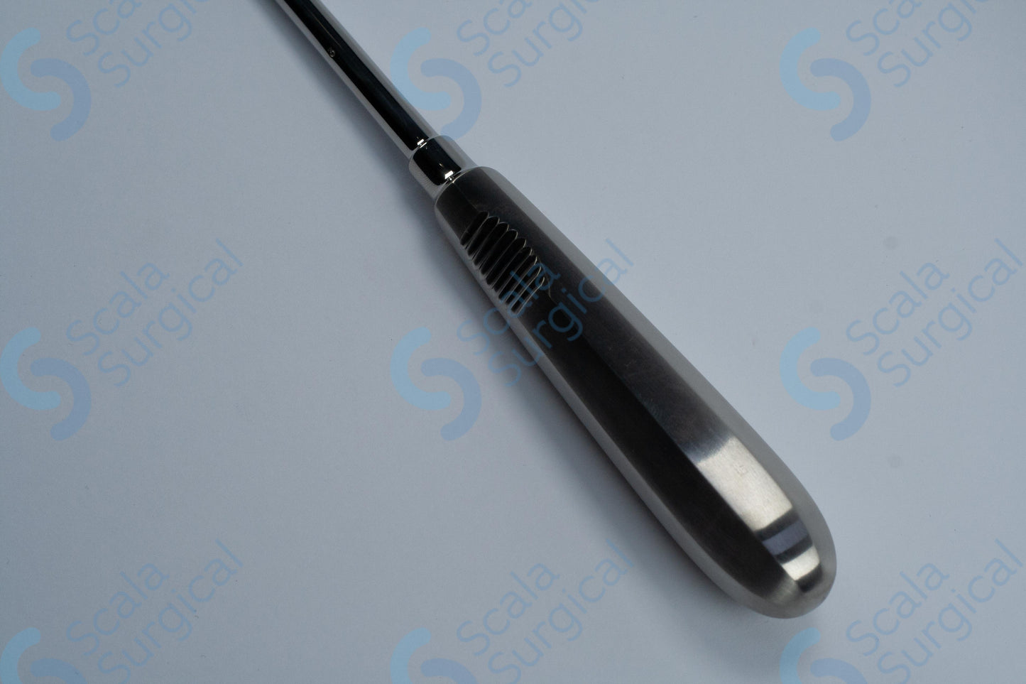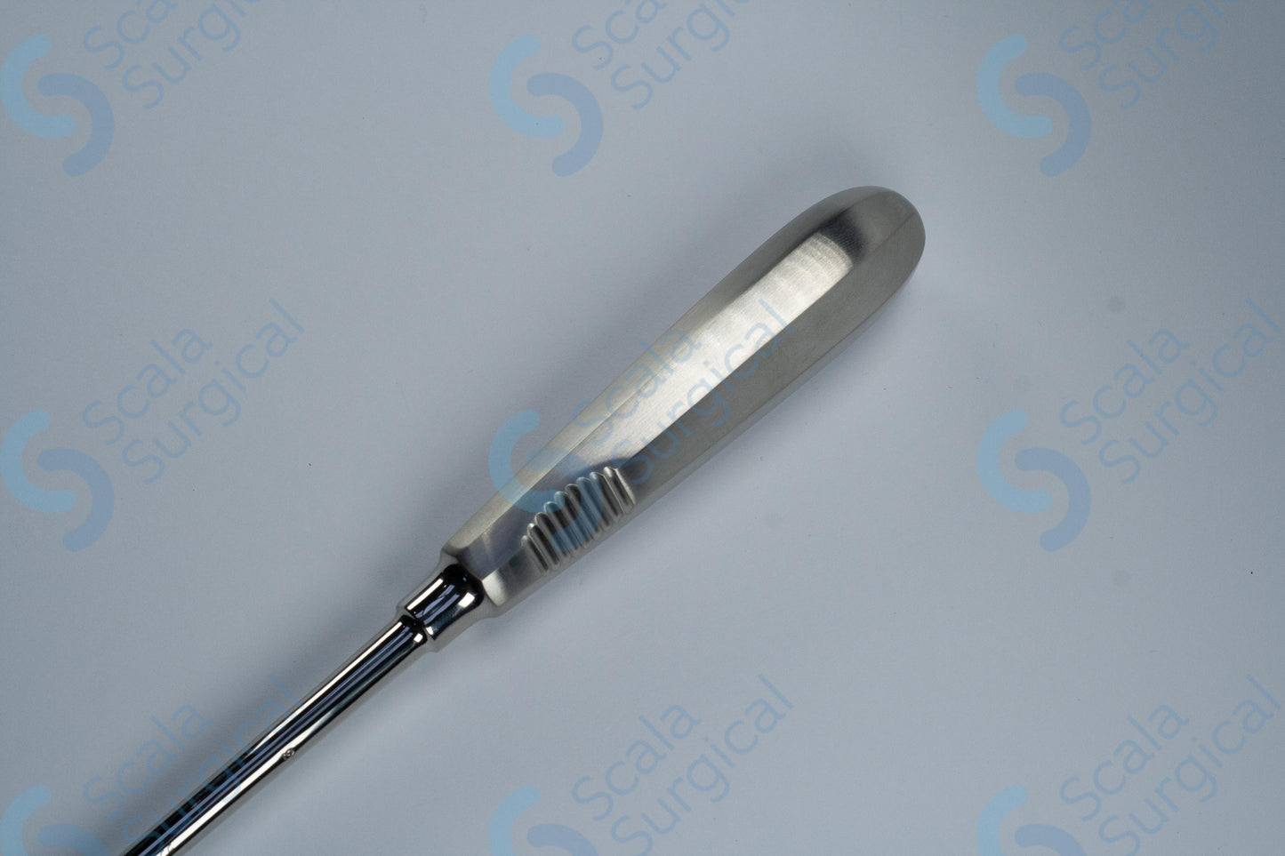A Recamier Uterine Curette Sharp is a surgical instrument used to scrape the inner walls of the uterus during a procedure called a curettage. It is typically used to remove tissue or abnormal growths, such as fibroids or polyps. The instrument has a sharp, curved tip that allows it to easily reach the inner walls of the uterus. The width of the curette is 9mm and the length is 317.5mm.
