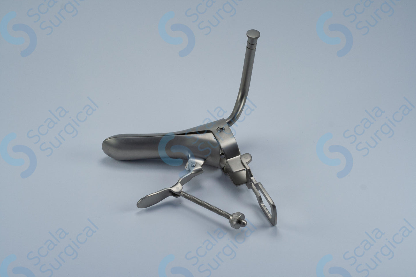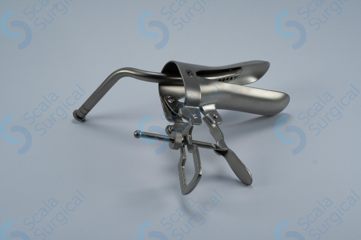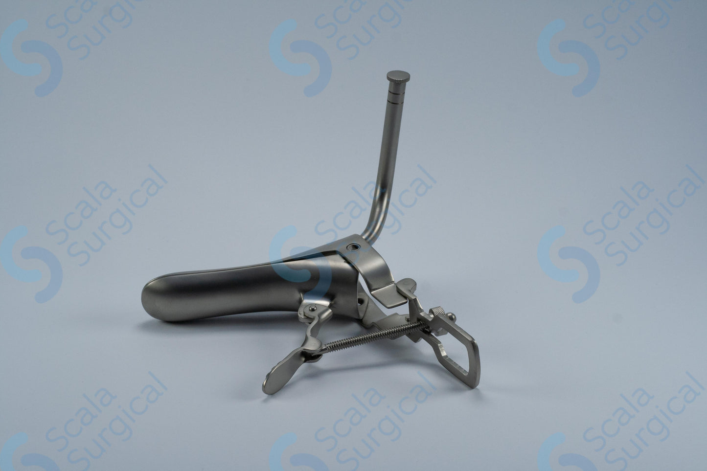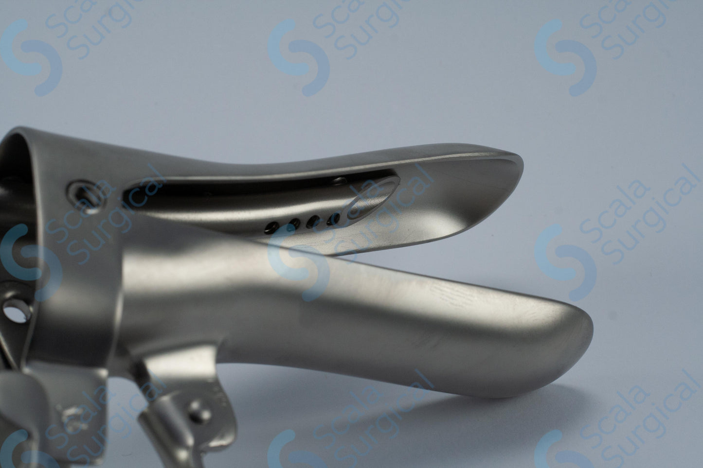 A Vaginal Cusco Speculum Bead Finish With Smoke Tube Small Angled (95 x 25mm) is a medical device used by gynecologists during pelvic examinations. It is inserted into the vagina to hold the walls of the vagina open so the doctor can inspect the vagina and cervix. The smoke tube allows the doctor to introduce smoke into the vagina to help visualize the cervix.