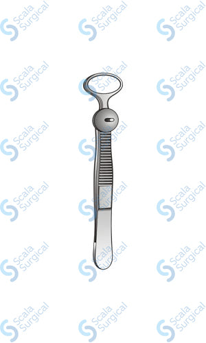 This forceps is used to remove a tarsal cyst, which is a type of benign growth that can form on the eyelid. The forceps are designed to fit around the cyst and gently remove it without causing damage to the surrounding tissue.