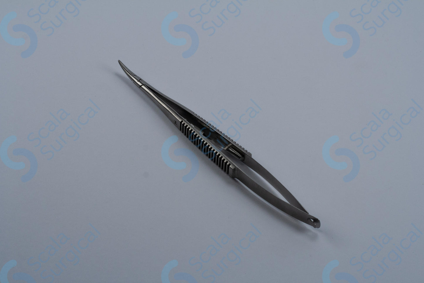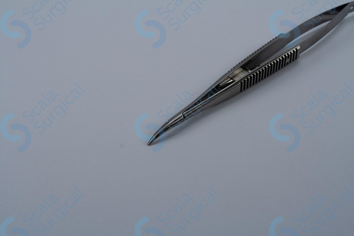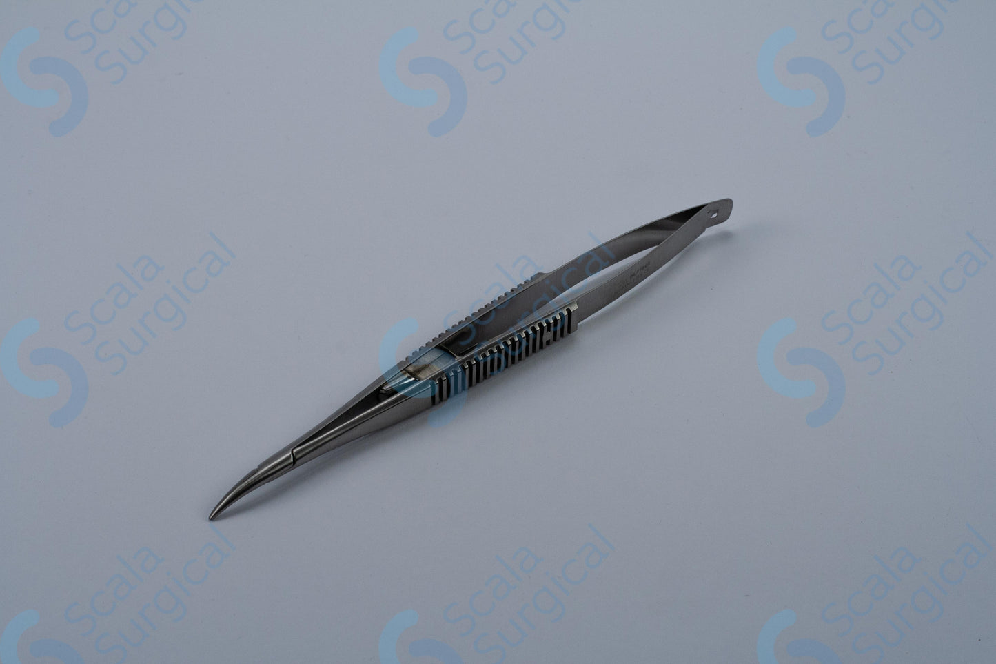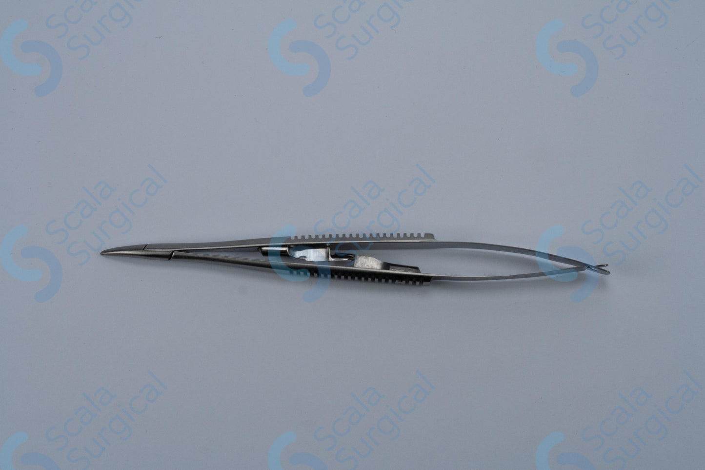 This item is used to hold a needle during ophthalmic surgery. It has a curved handle with a catch to help secure the needle, and is 139.7mm (5? inch) in length.
