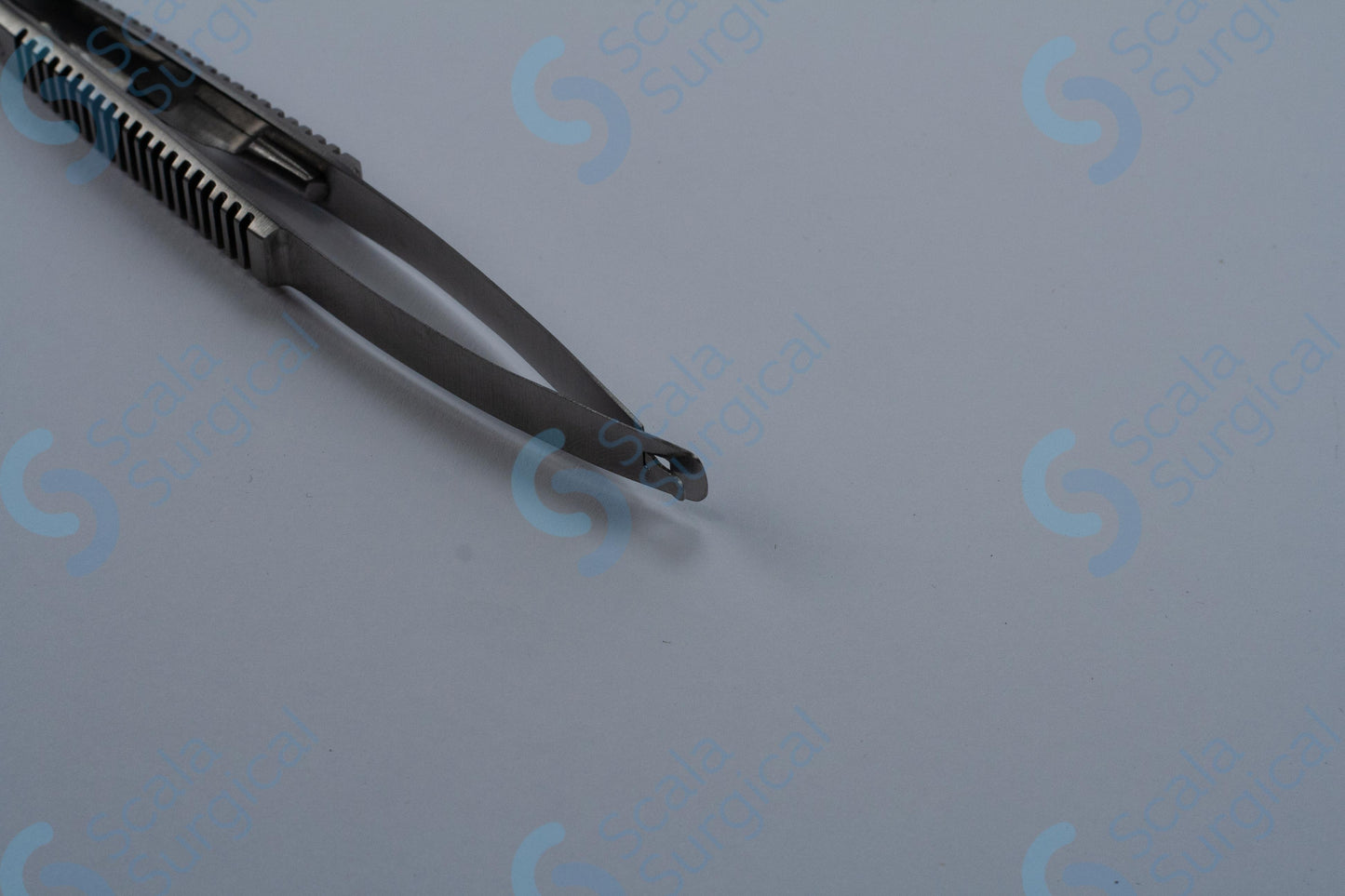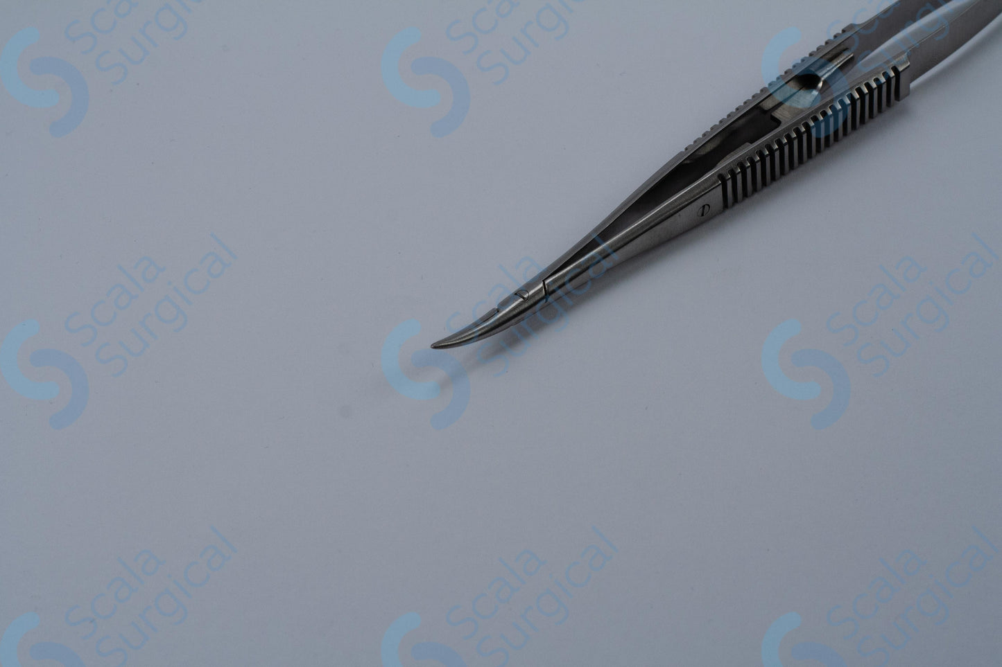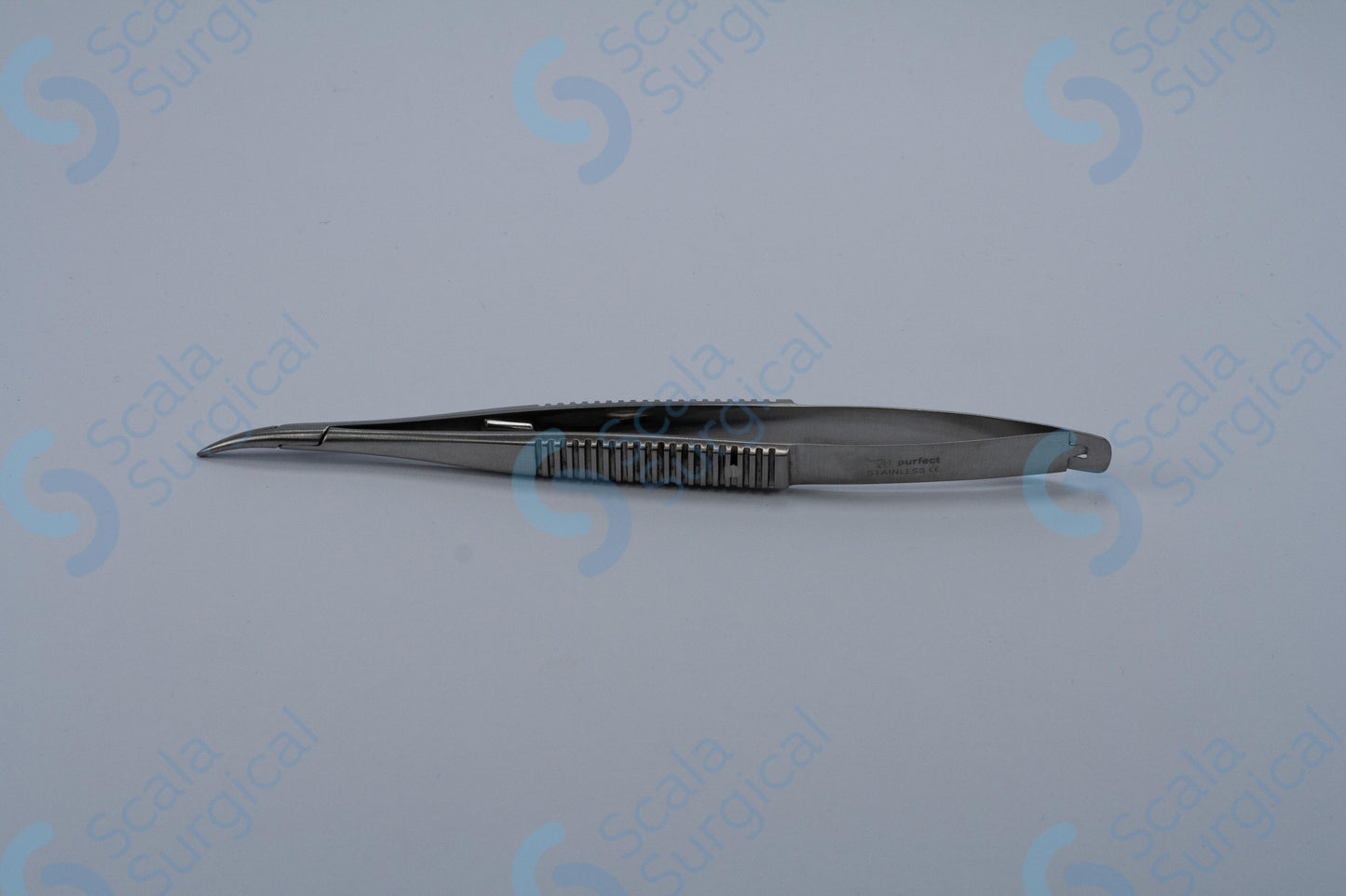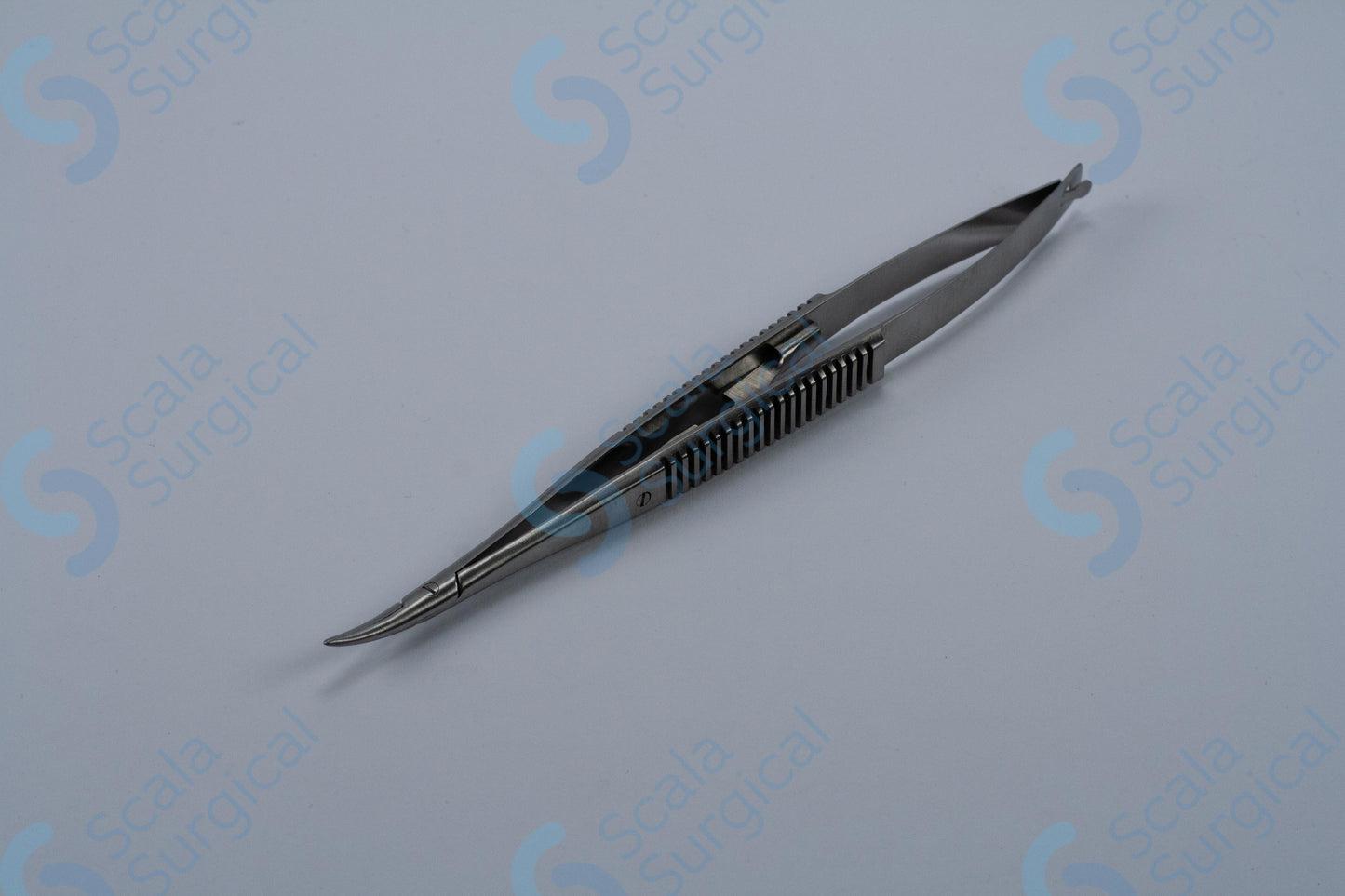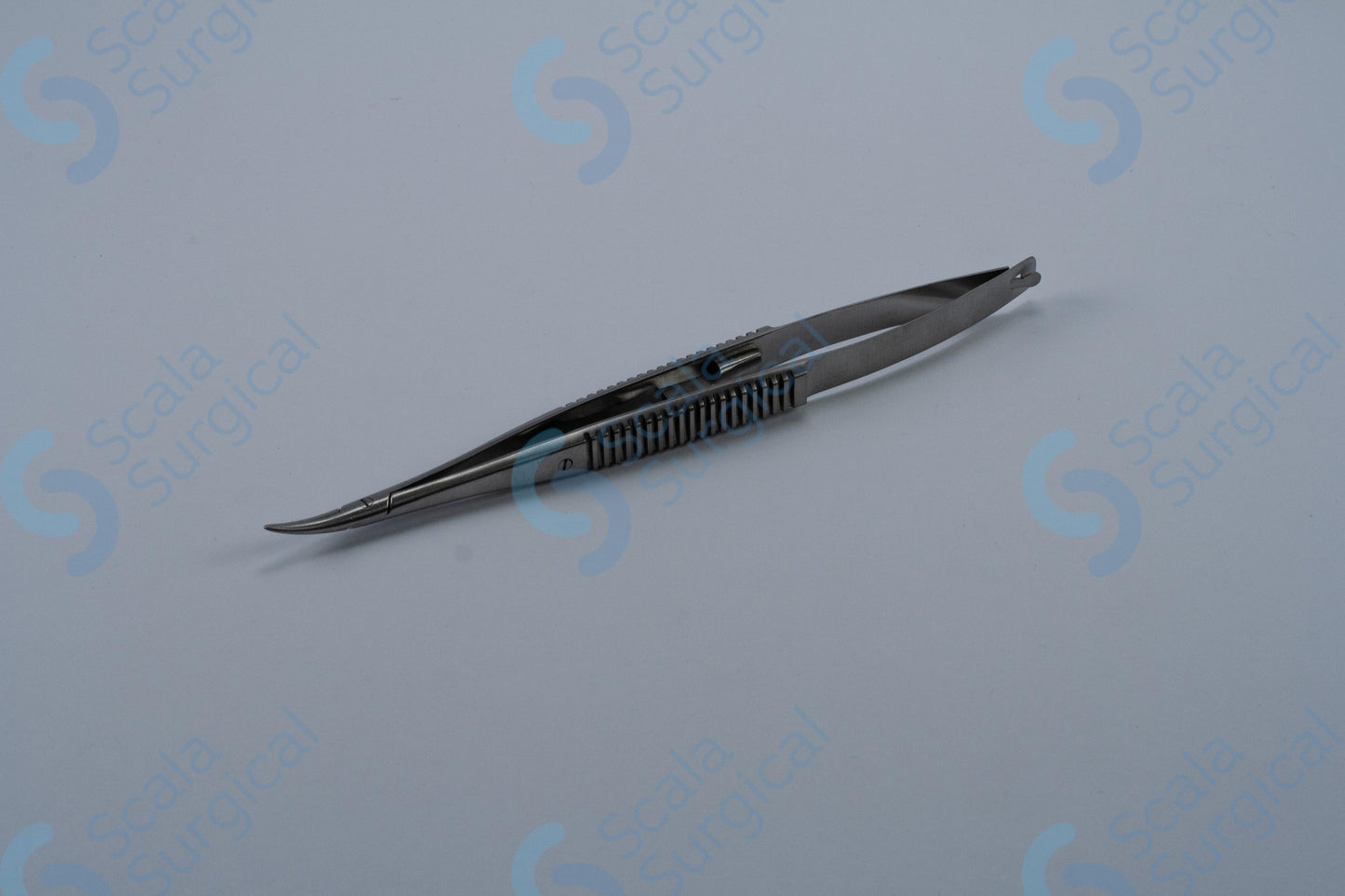 This item is used to hold a needle during ophthalmic surgery. It has a curved handle with a catch to help secure the needle, and is 139.7mm (5? inch) in length.