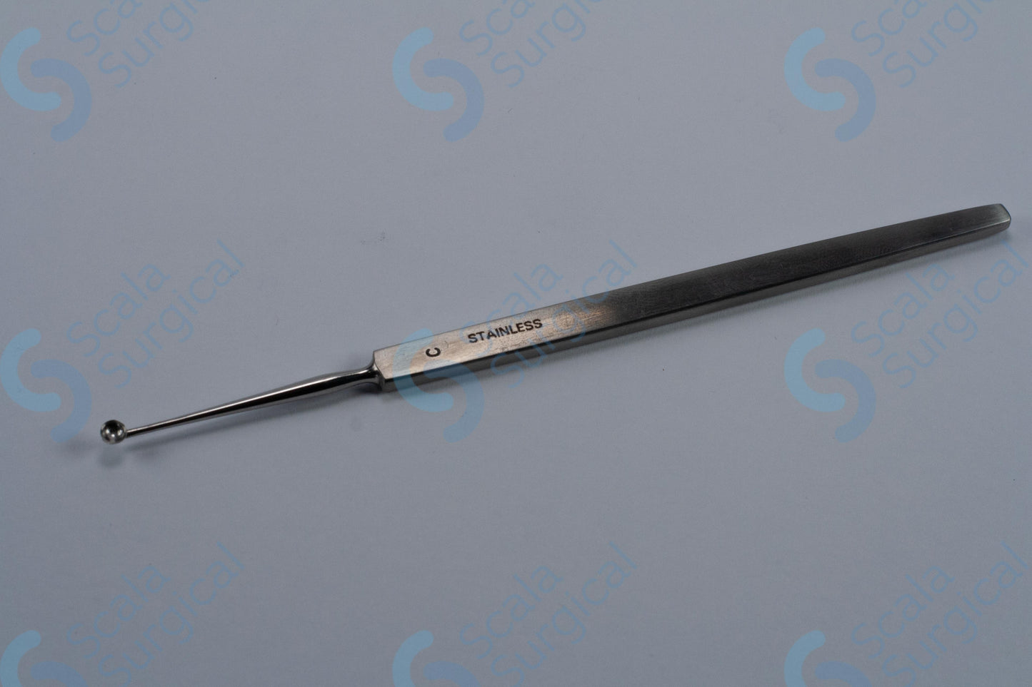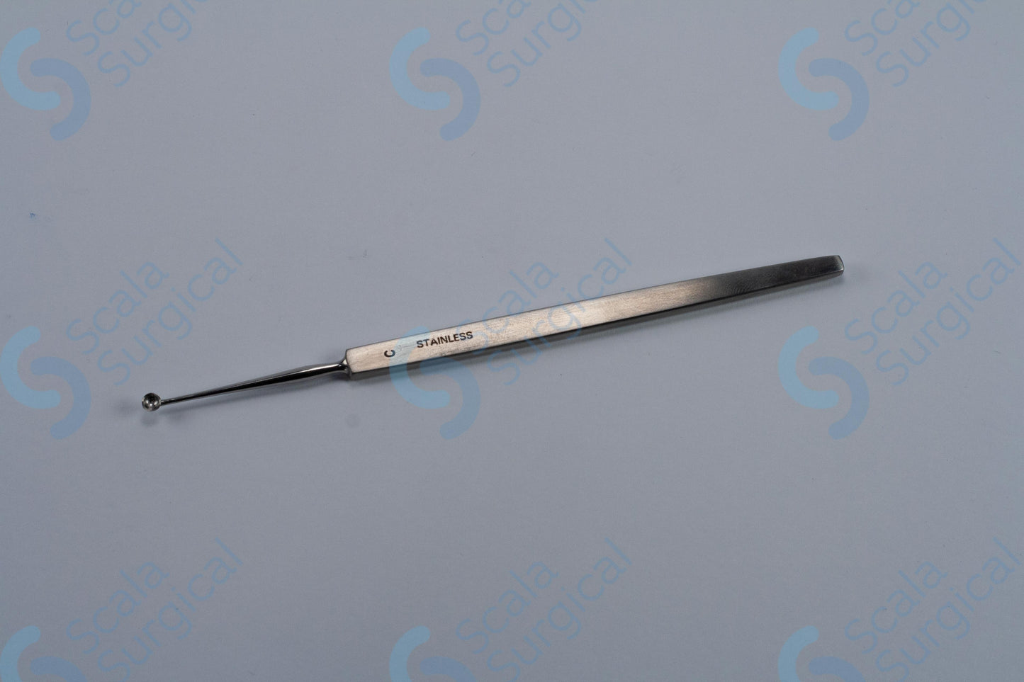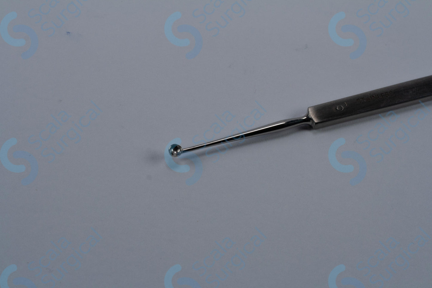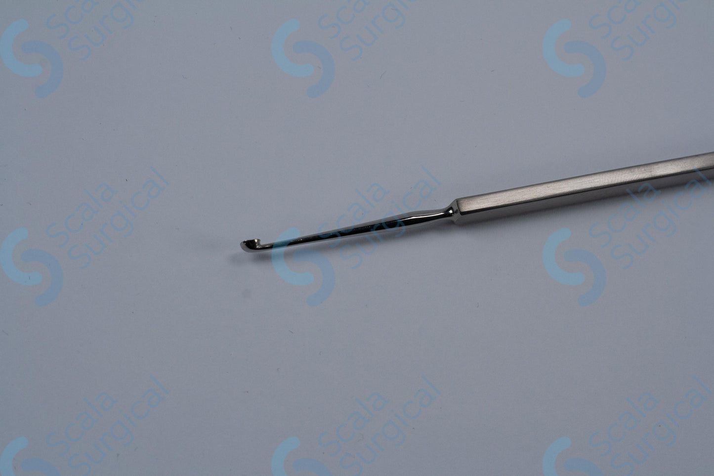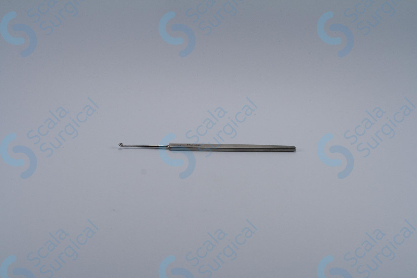 A Meyhoffer Eye Curette Size C is a surgical instrument used for scraping and removing debris from the eye. It is used in ophthalmic surgery to remove corneal deposits, exfoliate the cornea, and prepare the eye for suturing.