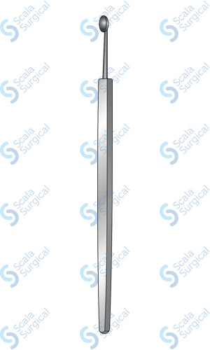 A Meyhoffer Eye Curette is a medical instrument used in ophthalmology to remove foreign bodies from the eye. It is a small, curved, stainless steel tool that is used to scrape away debris or foreign matter from the surface of the eye.