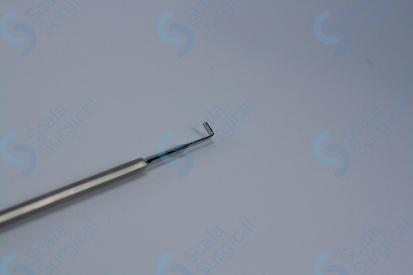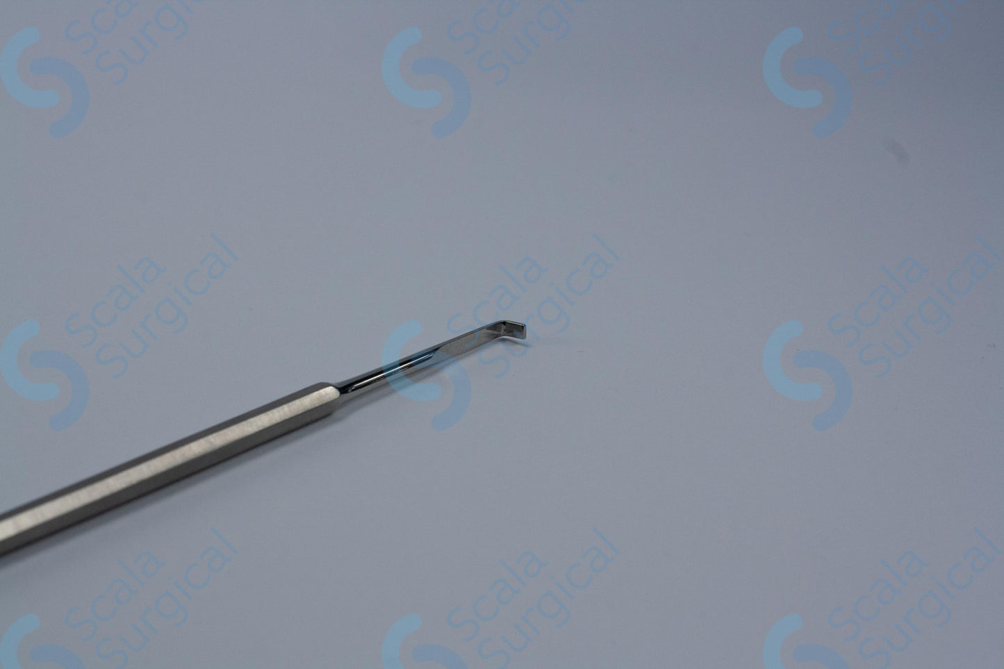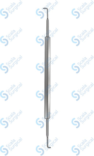 A Traquair Periosteal Elevator is a surgical instrument used to lift and separate tissue layers during a surgical procedure. It is commonly used during orthopedic and plastic surgery procedures. It is used to separate the periosteum (a thin layer of tissue that covers the bone) from the underlying bone in order to gain access to the bone and perform procedures such as bone grafting.