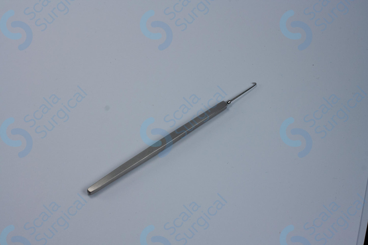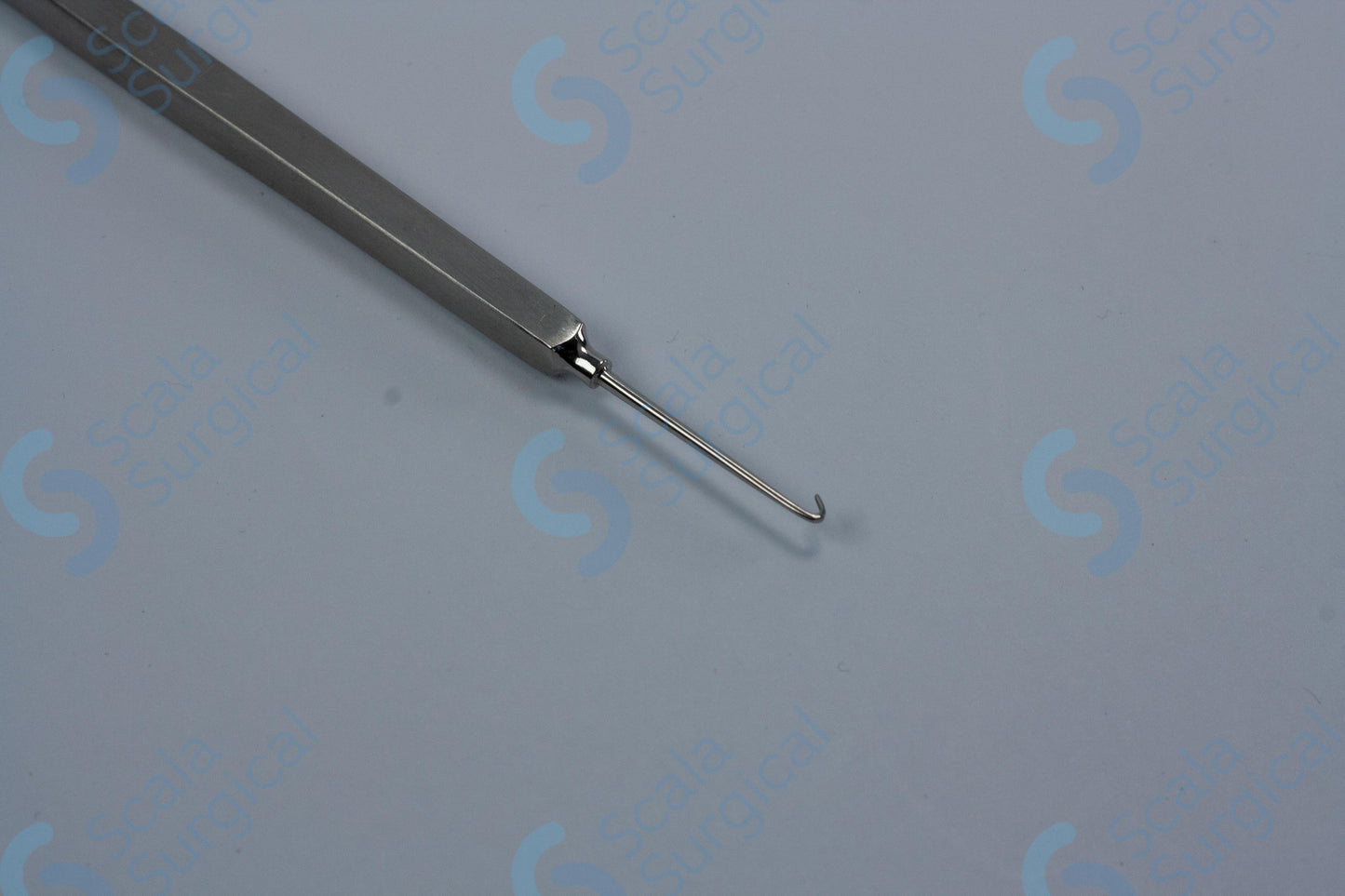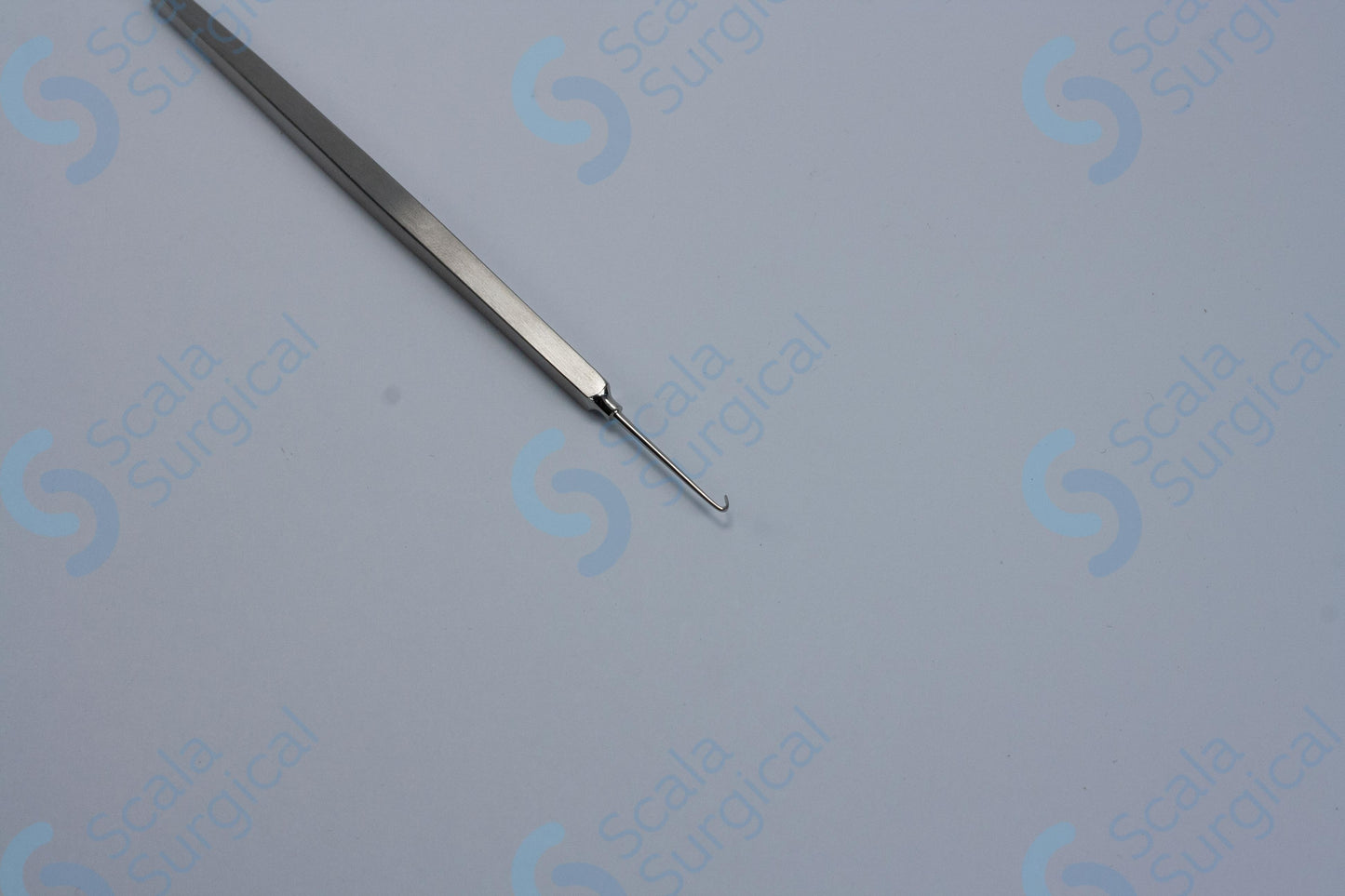 A Stallard Scleral Hook Sharp is a surgical instrument used to help with scleral dissection, which is the process of separating the sclera from the underlying tissue. This instrument is designed with a sharp hook at the end to aid in the separation of the sclera from the underlying tissue.