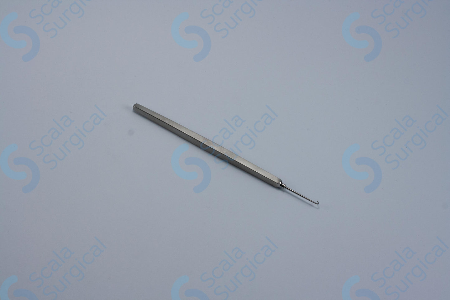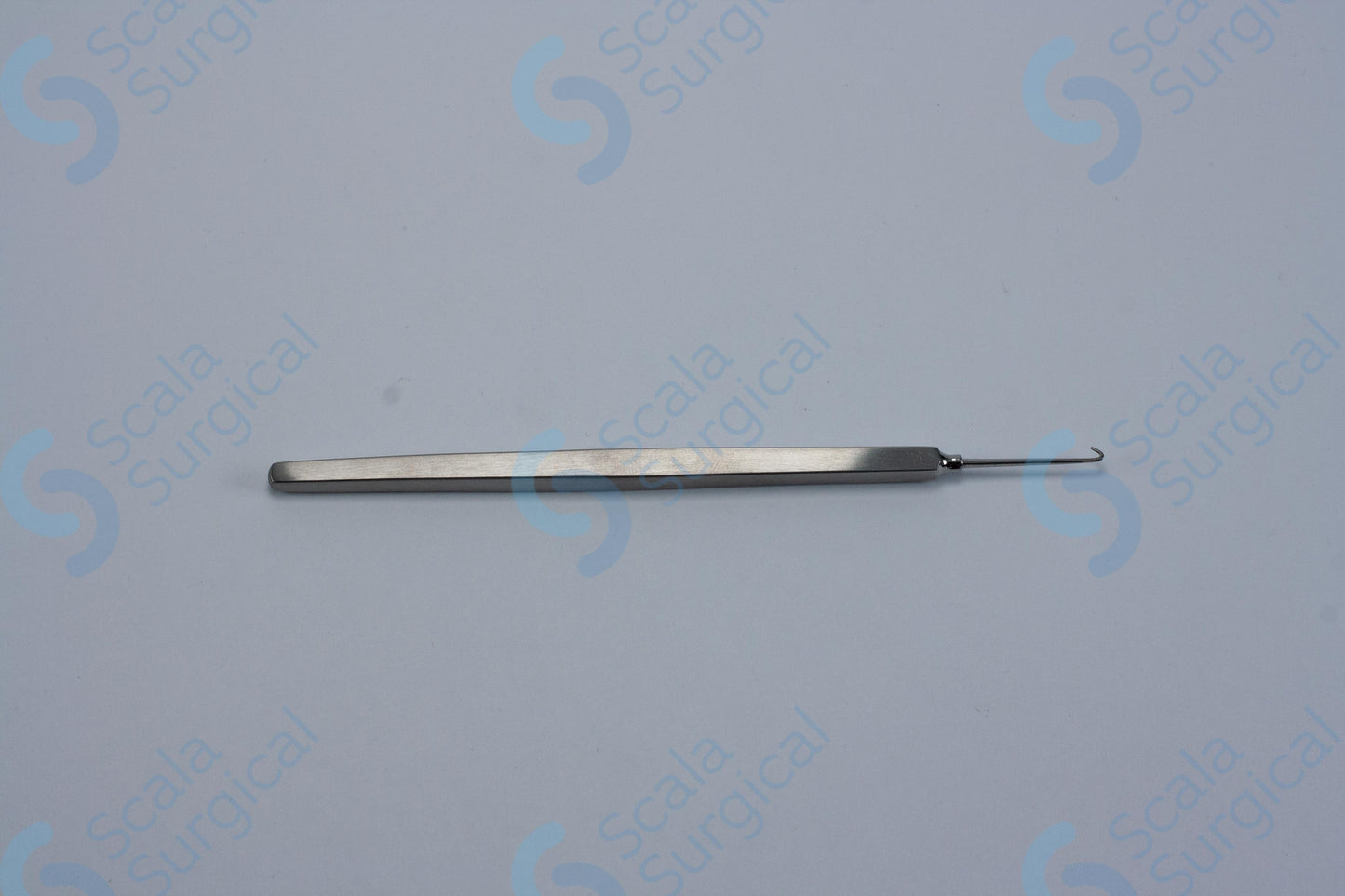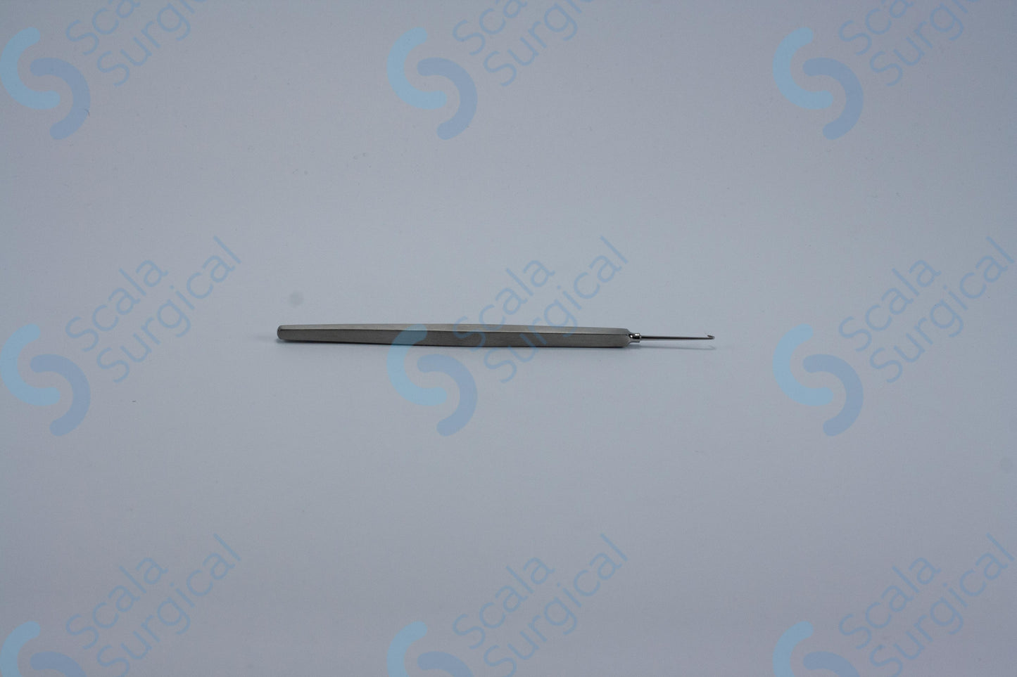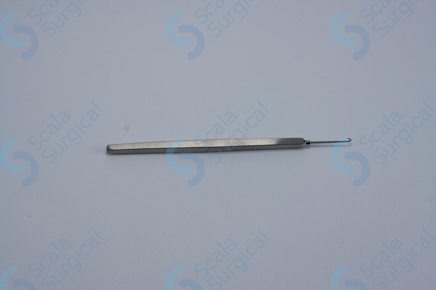 A Stallard Scleral Hook Sharp is a surgical instrument used to help with scleral dissection, which is the process of separating the sclera from the underlying tissue. This instrument is designed with a sharp hook at the end to aid in the separation of the sclera from the underlying tissue.