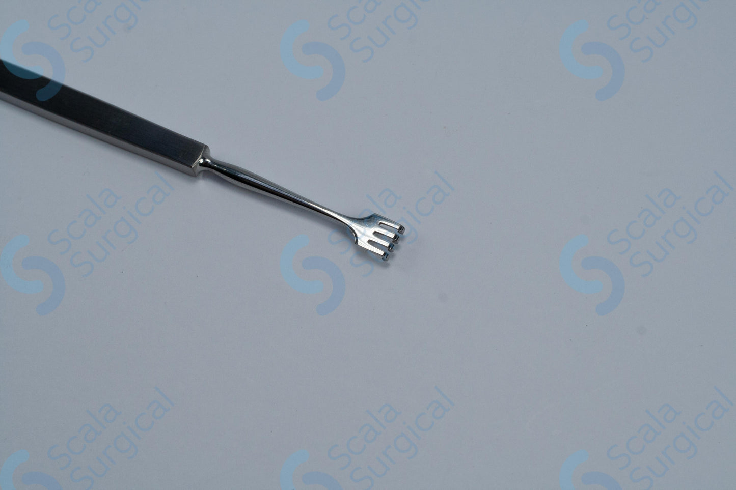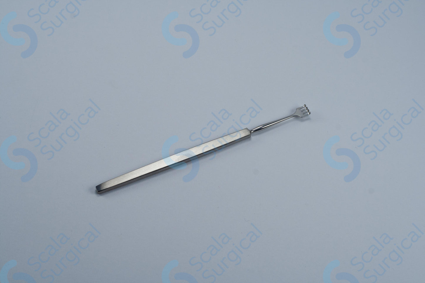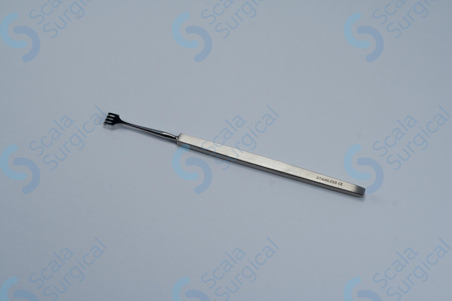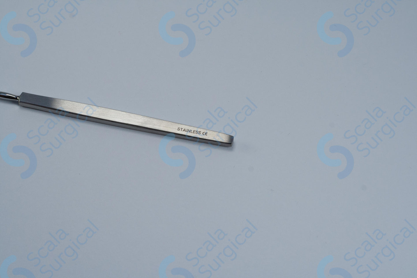 This item is used to help surgeons access the lachrymal sac during lacrimal surgery. It is a small hook with a sharp point which is used to open up the lachrymal sac to allow for the insertion of instruments or to remove any blockages.