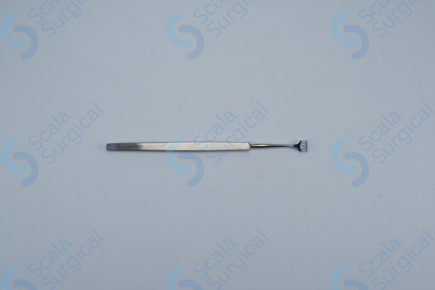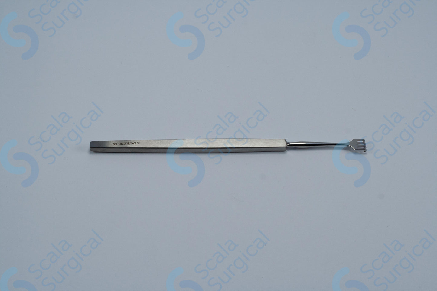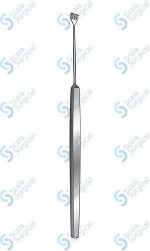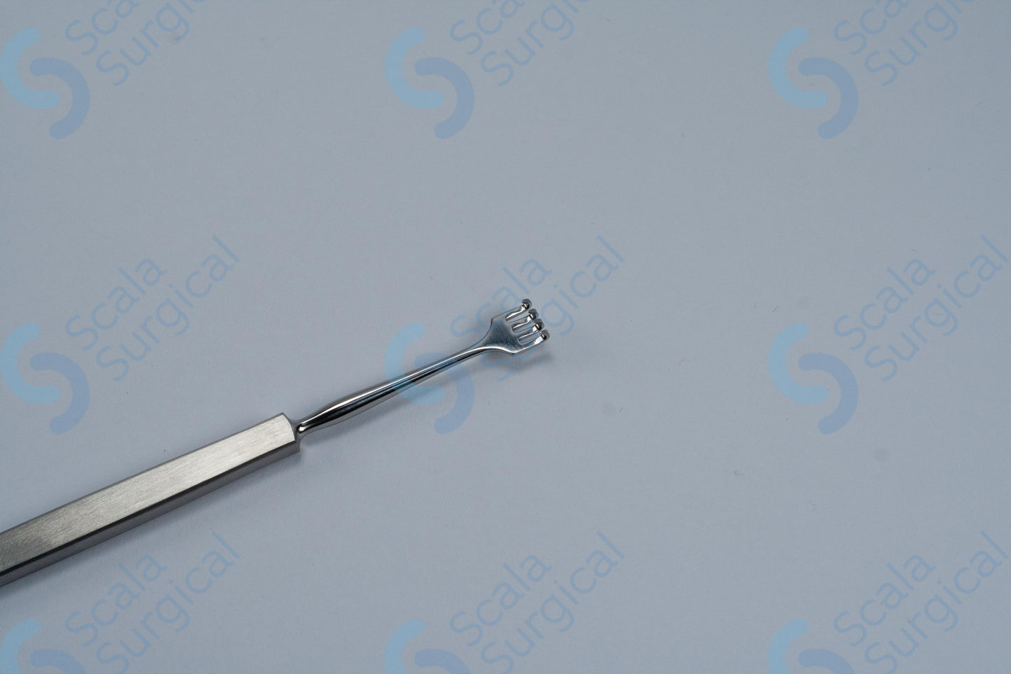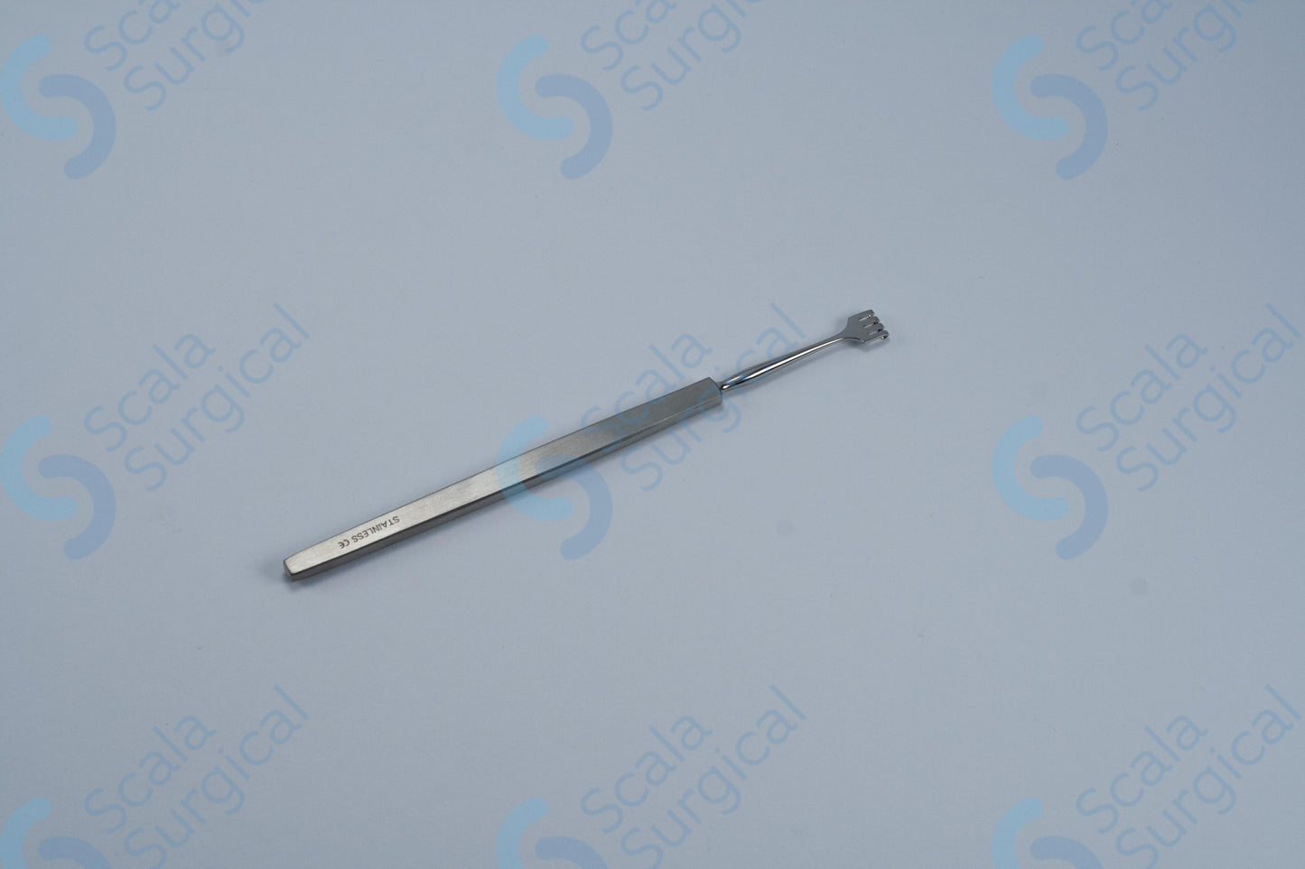 This item is used to help surgeons access the lachrymal sac during lacrimal surgery. It is a small hook with a sharp point which is used to open up the lachrymal sac to allow for the insertion of instruments or to remove any blockages.