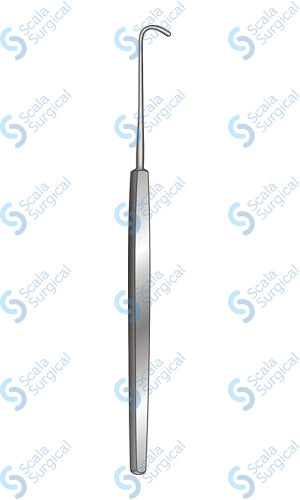 A Graefe eye hook large is a surgical instrument used for eyelid surgery. It is used to hold the eyelid in place during surgery and to help manipulate the eyelid tissue.