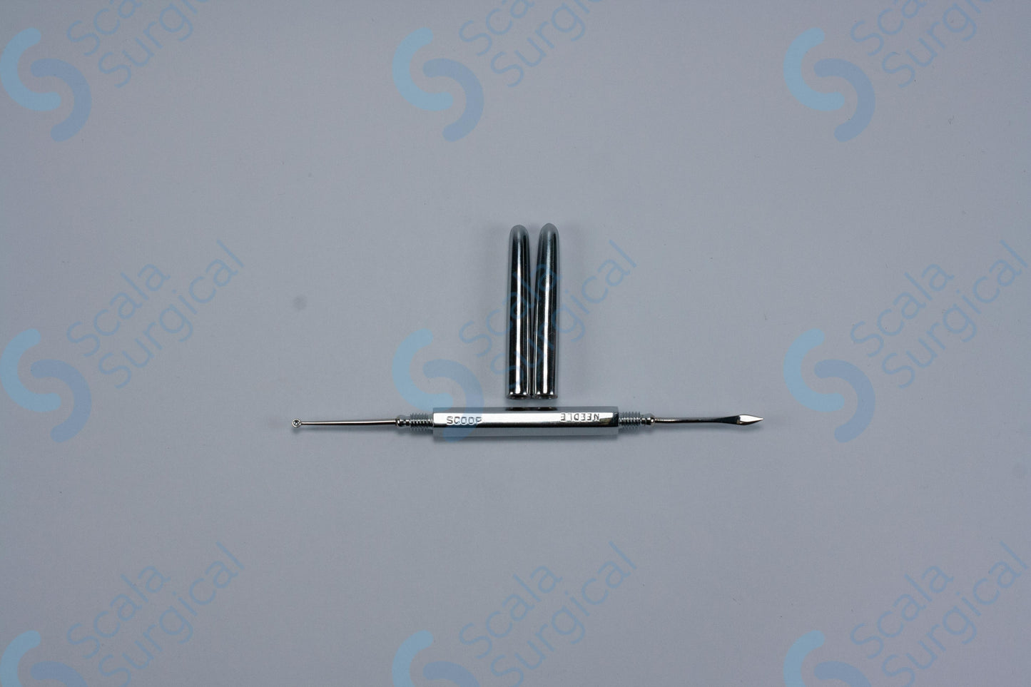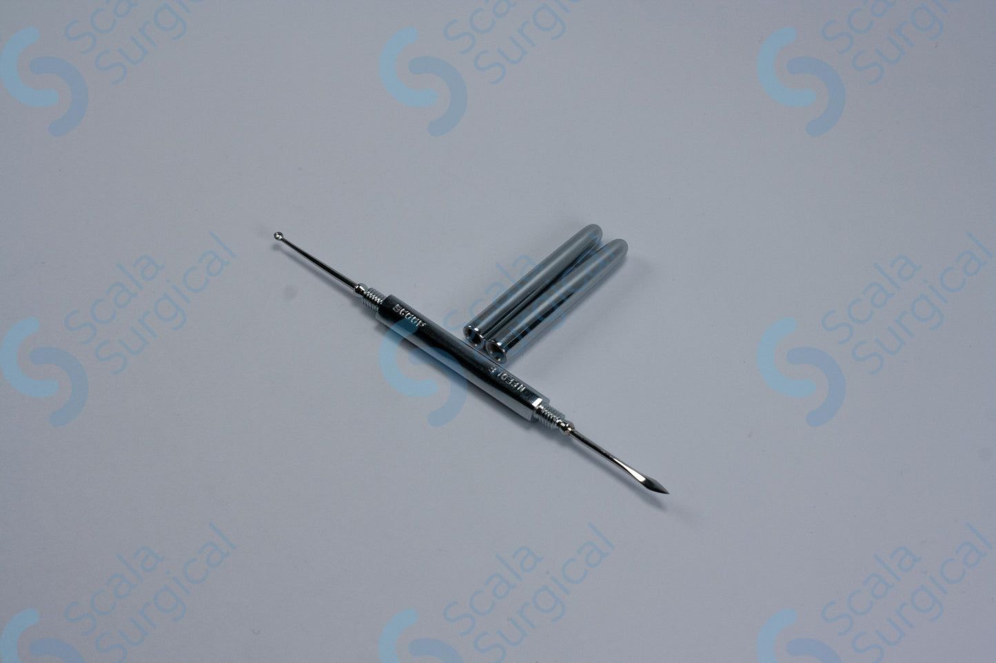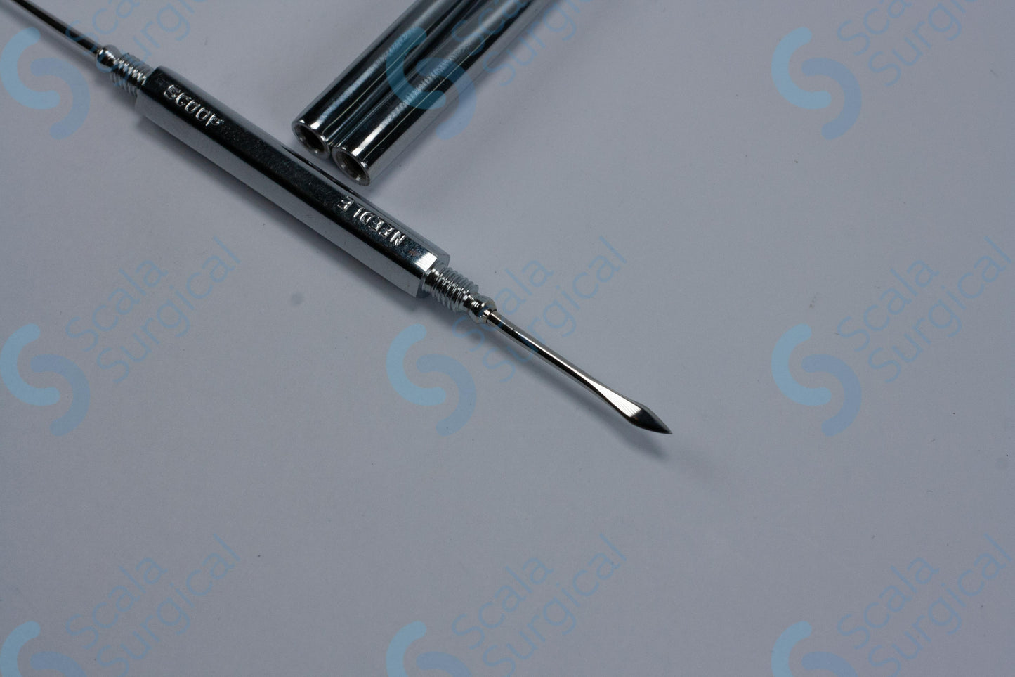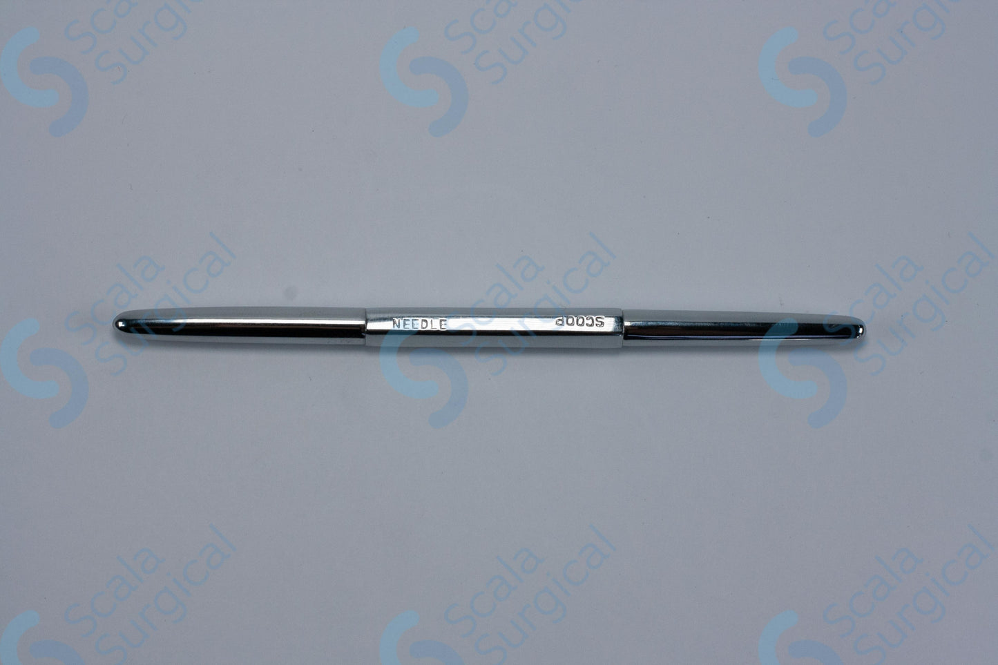 An ophthalmic scoop and needle is a medical instrument used to extract cataracts from the eye. It is a curved instrument with a scoop at one end and a needle at the other. The scoop is used to separate the cataract from the surrounding tissue and the needle is used to remove it.