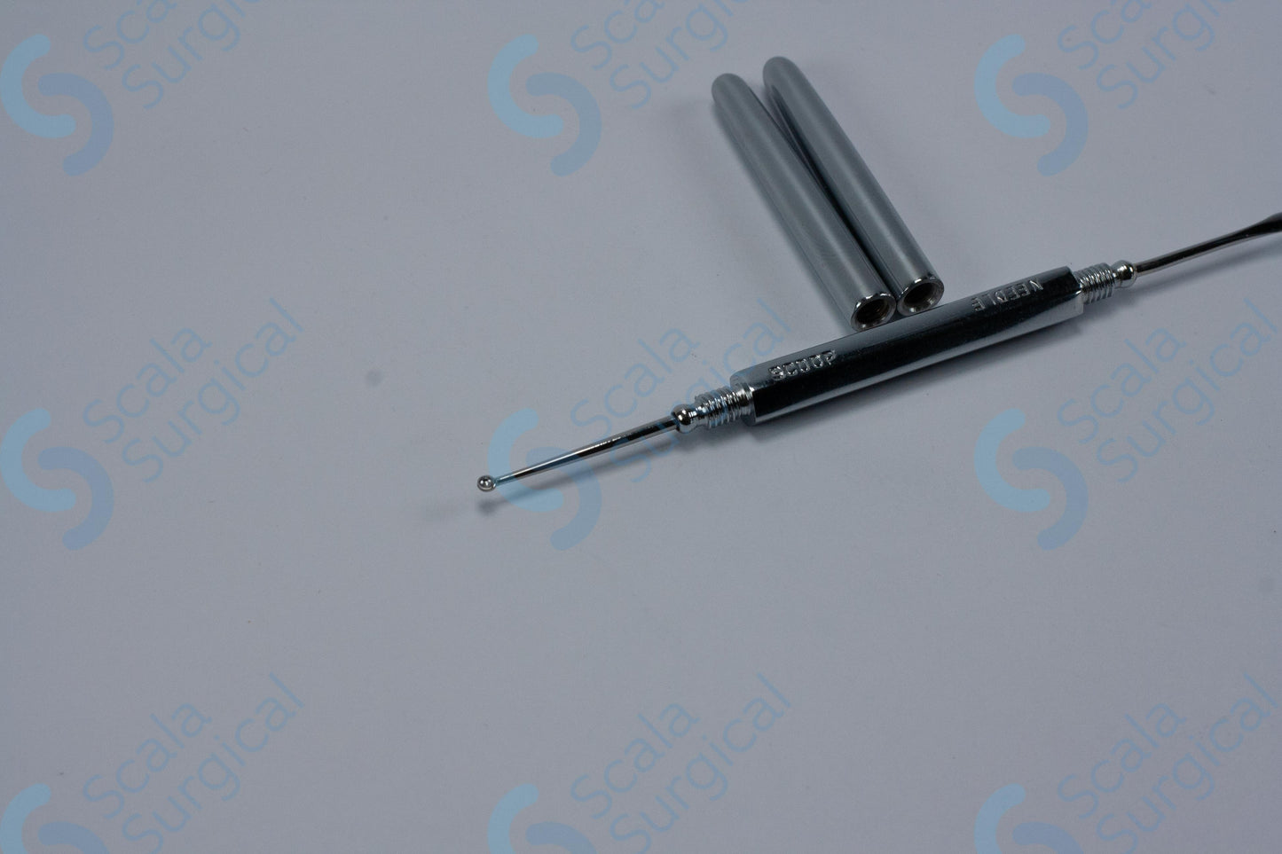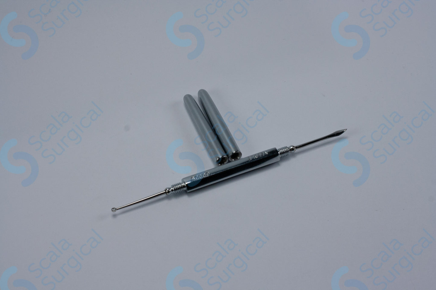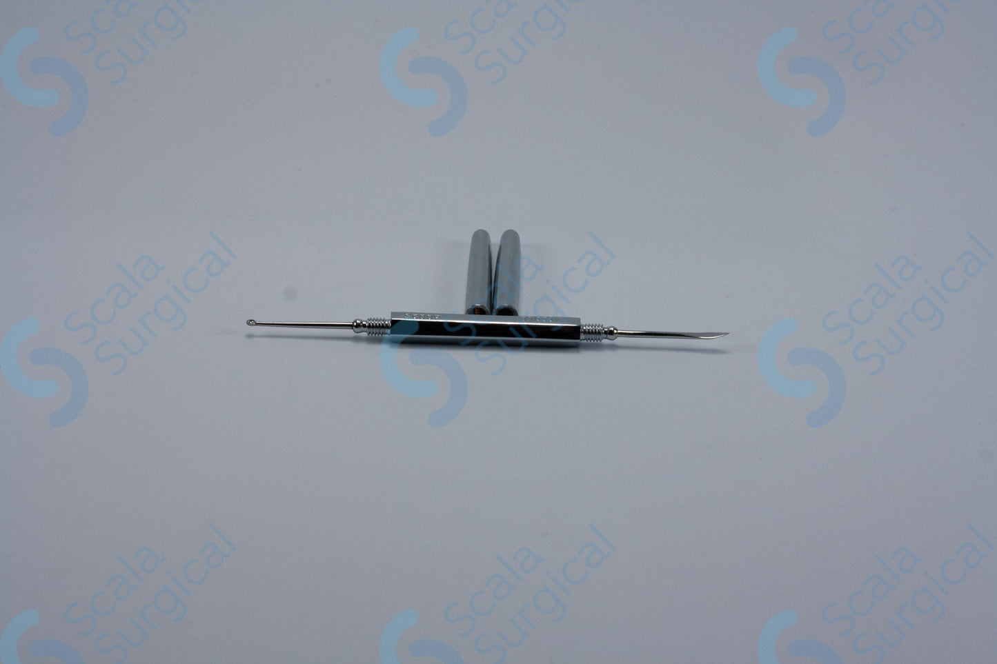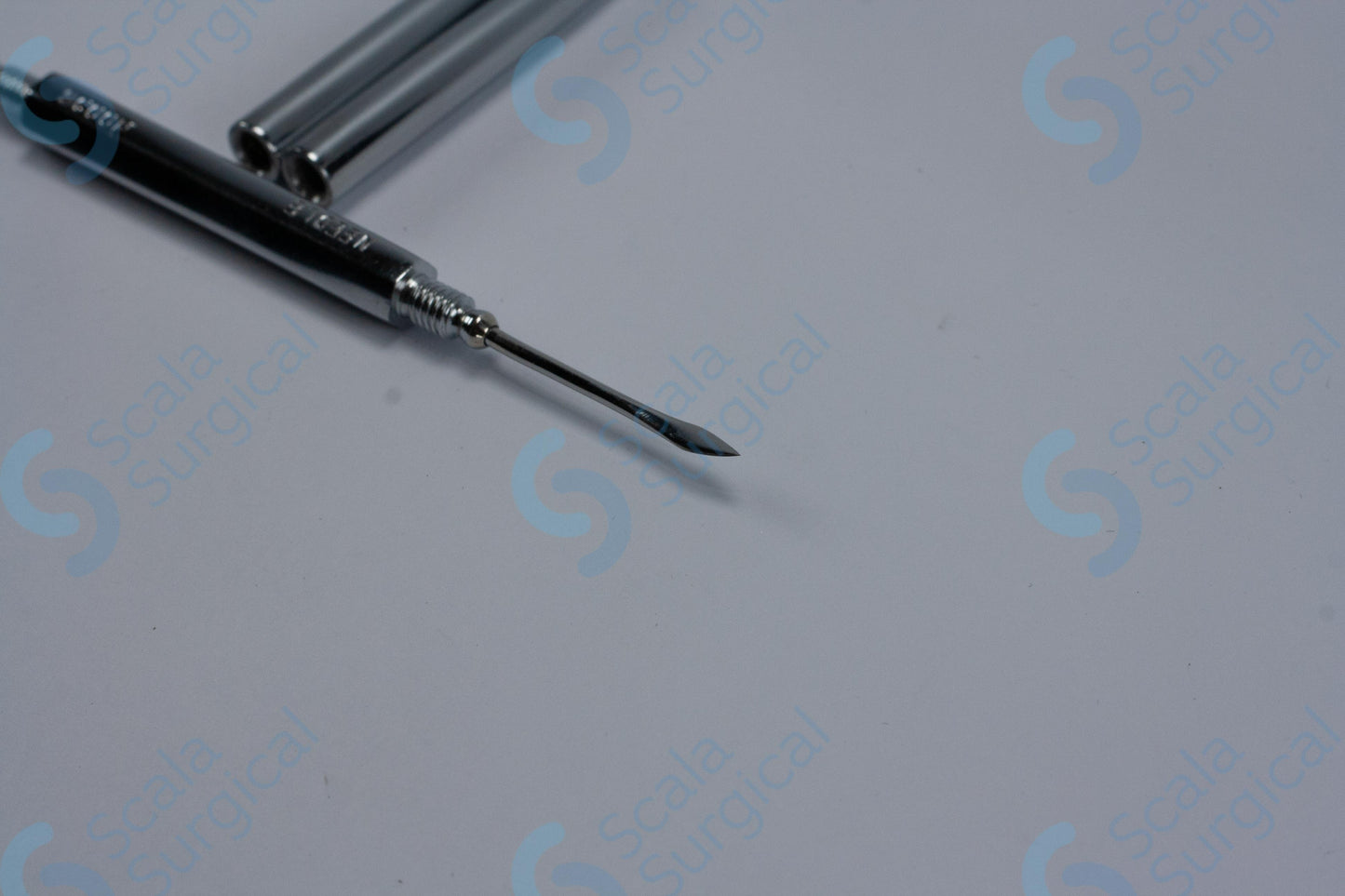 An ophthalmic scoop and needle is a medical instrument used to extract cataracts from the eye. It is a curved instrument with a scoop at one end and a needle at the other. The scoop is used to separate the cataract from the surrounding tissue and the needle is used to remove it.