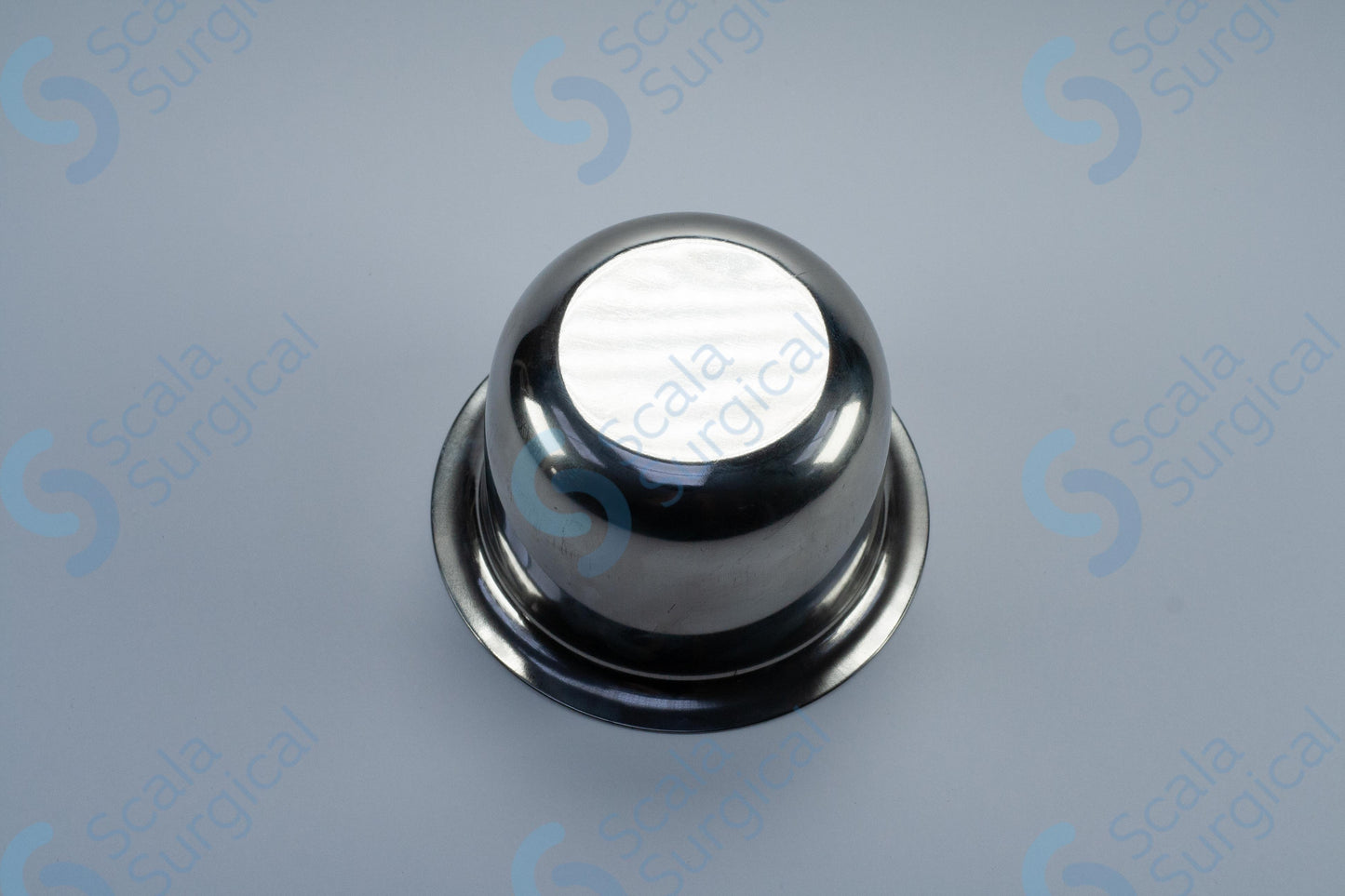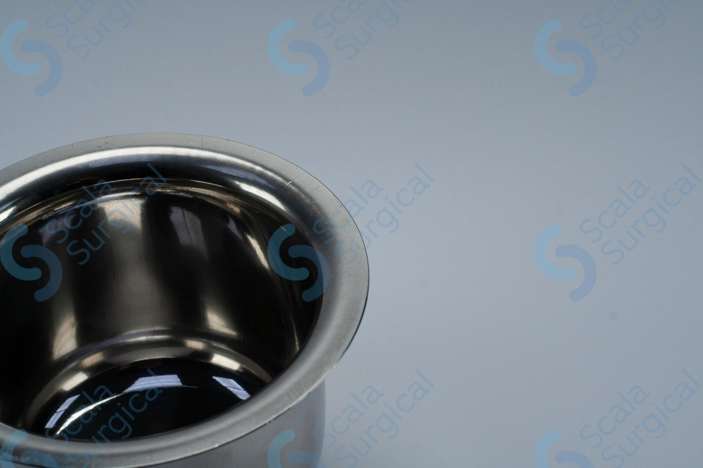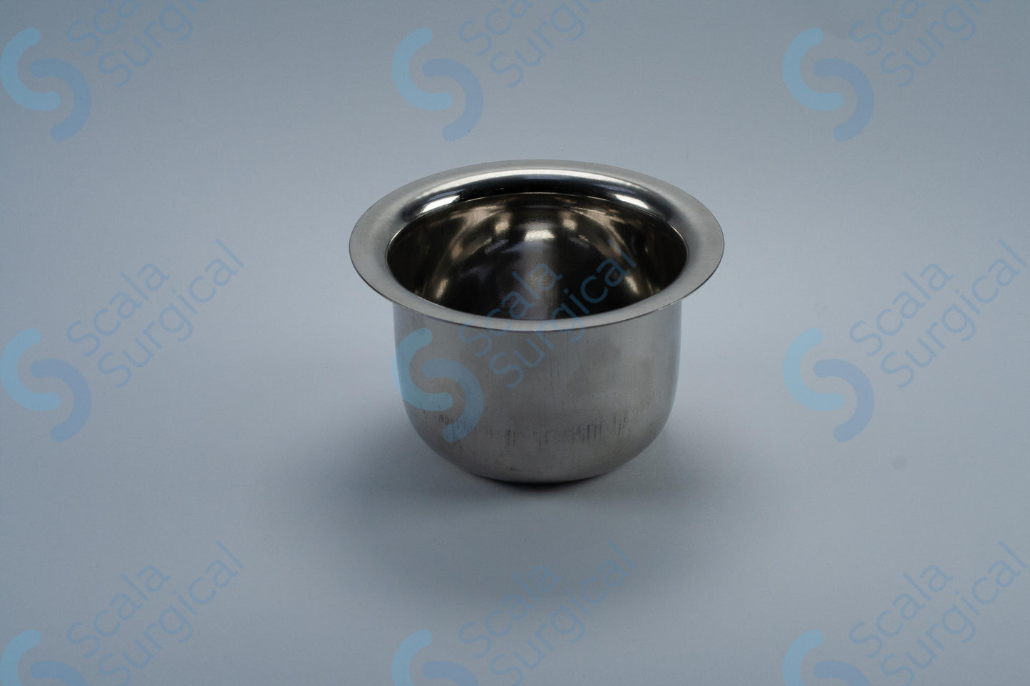 A gallipot without a lid is a small, shallow container typically used to hold medical supplies such as cotton swabs, forceps, gauze, or other small items during surgical procedures.